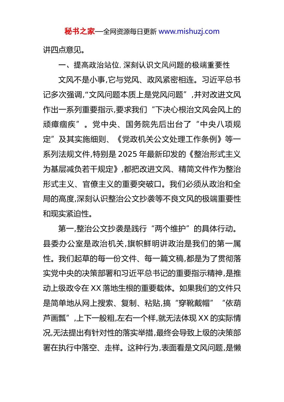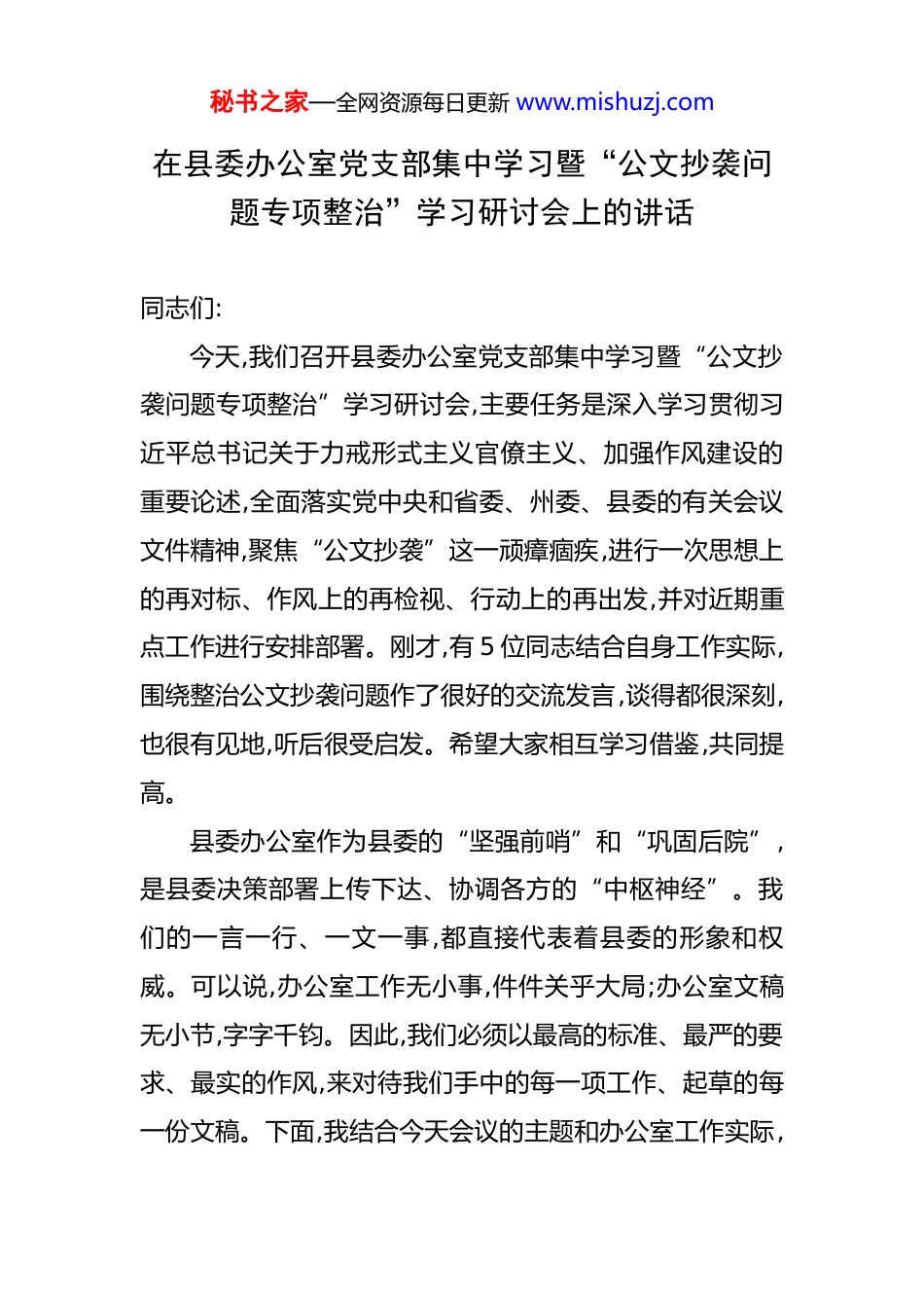秘书之家—全网资源每日更新 www.mishuzj.com在县委办公室党支部集中学习暨“公文抄袭问题专项整治”学习研讨会上的讲话 同志们: 今天,我们召开县委办公室党支部集中学习暨“公文抄袭问题专项整治”学习研讨会,主要任务是深入学习贯彻习近平总书记关于力戒形式主义官僚主义、加强作风建设的重要论述,全面落实党中央和省委、州委、县委的有关会议文件精神,聚焦“公文抄袭”这一顽瘴痼疾,进行一次思想上的再对标、作风上的再检视、行动上的再出发,并对近期重点工作进行安排部署。刚才,有 5 位同志结合自身工作实际,围绕整治公文抄袭问题作了很好的交流发言,谈得都很深刻,也很有见地,听后很受启发。希望大家相互学习借鉴,共同提高。县委办公室作为县委的“坚强前哨”和“巩固后院”,是县委决策部署上传下达、协调各方的“中枢神经”。我们的一言一行、一文一事,都直接代表着县委的形象和权威。可以说,办公室工作无小事,件件关乎大局;办公室文稿无小节,字字千钧。因此,我们必须以最高的标准、最严的要求、最实的作风,来对待我们手中的每一项工作、起草的每一份文稿。下面,我结合今天会议的主题和办公室工作实际,秘书之家—全网资源每日更新 www.mishuzj.com讲四点意见。一、提高政治站位,深刻认识文风问题的极端重要性文风不是小事,它与党风、政风紧密相连。习近平总书记多次强调,“文风问题本质上是党风问题”,并对改进文风作出一系列重要指示,要求我们“下决心根治文风会风上的顽瘴痼疾”。党中央、国务院先后出台了“中央八项规定”及其实施细则、《党政机关公文处理工作条例》等一系列法规文件,特别是 2025 年最新印发的《整治形式主义为基层减负若干规定》,都把改进文风、精简文件作为整治形式主义、官僚主义的重要突破口。我们必须从政治和全局的高度,深刻认识整治公文抄袭等不良文风的极端重要性和现实紧迫性。第一,整治公文抄袭是践行“两个维护”的具体行动。县委办公室是政治机关,旗帜鲜明讲政治是我们的第一属性。我们起草的每一份文件、每一篇文稿,都是为了贯彻落实党中央的决策部署和习近平总书记的重要指示精神,是推动上级政令在 XX 落地生根的重要载体。如果我们的文件只是简单地从网上搜索、复制、粘贴,搞“穿靴戴帽”“依葫芦画瓢”,上下一般粗,左右一个样,就无法体现 XX 的实际情况,无法提出有针对性的落实举措,最终会导致上级的决策部署在执行中落空、走样。这种行为,表面看是文风问题,是懒秘书之家—全网资源每日更新 www.mishuzj.com惰和不负责任,但实质上是政治站位不高、大局意识不强、看齐意识不够的表现,是对“两个维护”的虚化和弱化。我们必须清醒地认识到,坚决杜绝公文抄袭,就是以实际行动确保党中央政令畅通,确保县委决策部署不折不扣得到执行。第二,整治公文抄袭是力戒形式主义的必然要求。形式主义是党和人民事业的大敌。公文抄袭,正是形式主义在文稿工作中的典型表现。有的同志为了图省事、走捷径,不去深入基层调研,不去认真思考研究,而是习惯于当“搬运工”和“拼接师”,把别人的东西改个标题、换个地名就当成自己的成果。近期,媒体就曝光了邻近 XX 地区出现的“张冠李戴”式公文抄袭事件,一份事关地方长远发展的《森林防火规划》,其核心内容竟然与数百公里外的另一个县的文本高度雷同,甚至连乡镇名称都未作修改,造成了极为恶劣的社会影响,严重损害了党委政府的公信力。这给我们敲响了警钟。这种“以文件落实文件”的虚浮作风,不仅不能解决任何实际问题,反而会助长“文山会海”,加重基层负担,败坏党风政风。我们必须下大力气整治这种顽疾,大力弘扬求真务实、真抓实干的优良作风。第三,整治公文抄袭是提升辅政水平的内在需要。以文辅政是党委办公室的核心职能。我们服务的质量和水平,直接关系到县委决策的科学性和精准性。高质量的文稿,来源秘书之家—全网资源每日更新 www.mishuzj.com于对县情的深入把握、对政策的深刻理解、对问题的深入研究。抄袭出来的文稿,必然是言之无物、空洞乏味,缺乏思想性、针对性和指导性,不可能为领导决策提供有价值的参考。根据初步统计,今年以来,我们办公室处理和流转的各类文件已超过 2000 件次,起...