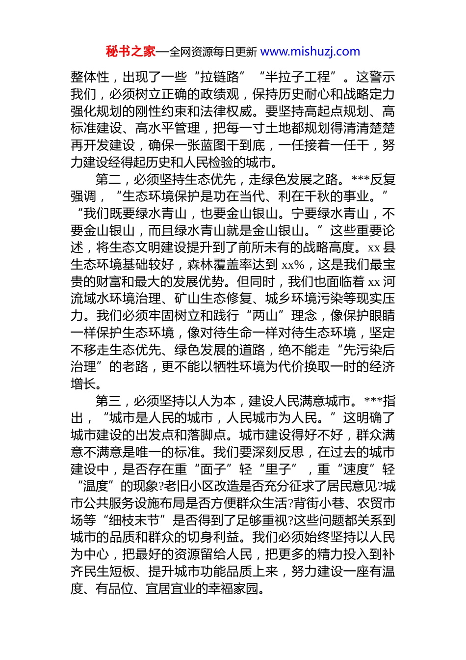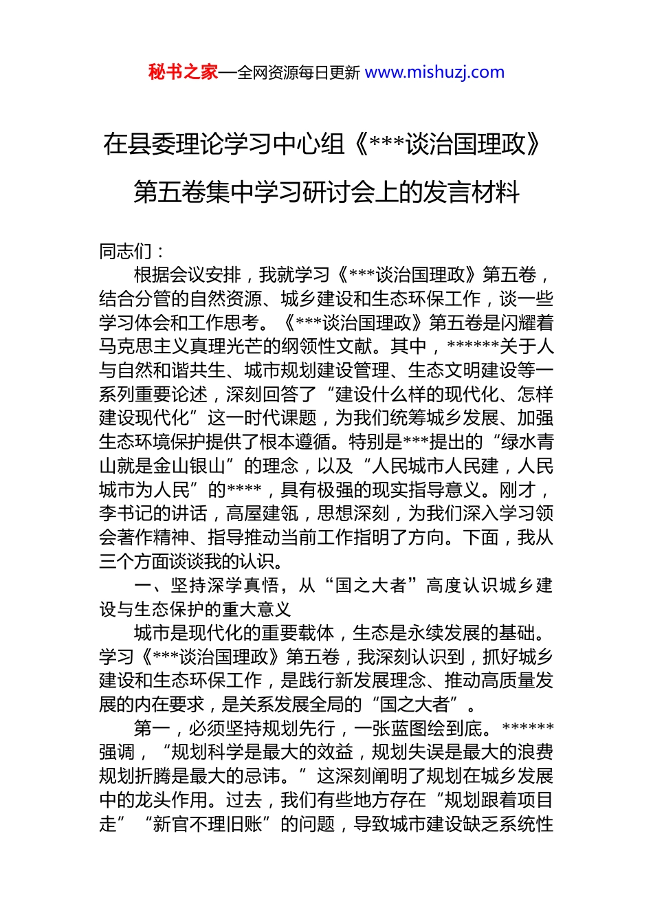 秘书之家—全网资源每日更新 www.mishuzj.com在县委理论学习中心组《***谈治国理政》第五卷集中学习研讨会上的发言材料同志们:根据会议安排,我就学习《***谈治国理政》第五卷,结合分管的自然资源、城乡建设和生态环保工作,谈一些学习体会和工作思考。《***谈治国理政》第五卷是闪耀着马克思主义真理光芒的纲领性文献。其中,******关于人与自然和谐共生、城市规划建设管理、生态文明建设等一系列重要论述,深刻回答了“建设什么样的现代化、怎样建设现代化”这一时代课题,为我们统筹城乡发展、加强生态环境保护提供了根本遵循。特别是***提出的“绿水青山就是金山银山”的理念,以及“人民城市人民建,人民城市为人民”的****,具有极强的现实指导意义。刚才,李书记的讲话,高屋建瓴,思想深刻,为我们深入学习领会著作精神、指导推动当前工作指明了方向。下面,我从三个方面谈谈我的认识。一、坚持深学真悟,从“国之大者”高度认识城乡建设与生态保护的重大意义城市是现代化的重要载体,生态是永续发展的基础。学习《***谈治国理政》第五卷,我深刻认识到,抓好城乡建设和生态环保工作,是践行新发展理念、推动高质量发展的内在要求,是关系发展全局的“国之大者”。第一,必须坚持规划先行,一张蓝图绘到底。******强调,“规划科学是最大的效益,规划失误是最大的浪费规划折腾是最大的忌讳。”这深刻阐明了规划在城乡发展中的龙头作用。过去,我们有些地方存在“规划跟着项目走”“新官不理旧账”的问题,导致城市建设缺乏系统性秘书之家—全网资源每日更新 www.mishuzj.com整体性,出现了一些“拉链路”“半拉子工程”。这警示我们,必须树立正确的政绩观,保持历史耐心和战略定力强化规划的刚性约束和法律权威。要坚持高起点规划、高标准建设、高水平管理,把每一寸土地都规划得清清楚楚再开发建设,确保一张蓝图干到底,一任接着一任干,努力建设经得起历史和人民检验的城市。第二,必须坚持生态优先,走绿色发展之路。***反复强调,“生态环境保护是功在当代、利在千秋的事业。”“我们既要绿水青山,也要金山银山。宁要绿水青山,不要金山银山,而且绿水青山就是金山银山。”这些重要论述,将生态文明建设提升到了前所未有的战略高度。xx 县生态环境基础较好,森林覆盖率达到 xx%,这是我们最宝贵的财富和最大的发展优势。但同时,我们也面临着 xx 河流域水环境治理、矿山生态修复、城乡环境污染等现实压力。我们必须牢固树立和践行“两山”理念,像保护眼睛一样保护生态环境,像对待生命一样对待生态环境,坚定不移走生态优先、绿色发展的道路,绝不能走“先污染后治理”的老路,更不能以牺牲环境为代价换取一时的经济增长。第三,必须坚持以人为本,建设人民满意城市。***指出,“城市是人民的城市,人民城市为人民。”这明确了城市建设的出发点和落脚点。城市建设得好不好,群众满意不满意是唯一的标准。我们要深刻反思,在过去的城市建设中,是否存在重“面子”轻“里子”,重“速度”轻“温度”的现象?老旧小区改造是否充分征求了居民意见?城市公共服务设施布局是否方便群众生活?背街小巷、农贸市场等“细枝末节”是否得到了足够重视?这些问题都关系到城市的品质和群众的切身利益。我们必须始终坚持以人民为中心,把最好的资源留给人民,把更多的精力投入到补齐民生短板、提升城市功能品质上来,努力建设一座有温度、有品位、宜居宜业的幸福家园。秘书之家—全网资源每日更新 www.mishuzj.com二、坚持查改贯通,在对标看齐中找准城乡发展和生态建设的差距短板以**************思想为镜子,对照检查我县城乡建设和生态环保工作,还存在一些不容忽视的问题。一是在城乡统筹发展上还有差距。长期以来,“重城轻乡”的惯性思维依然存在,城乡二元结构矛盾仍然比较突出。县城首位度不高,辐射带动能力不强,城市功能品质有待提升。而广大农村地区,基础设施和公共服务欠账较多,村庄规划滞后,特色风貌不彰显。城乡之间要素流动不畅,融合发展水平不高。二是在城市精细化管理上还有不足。城市管理中还存在“粗放式”的问题,比如车辆乱停乱放、占道经营、垃...