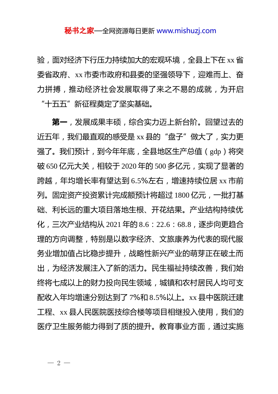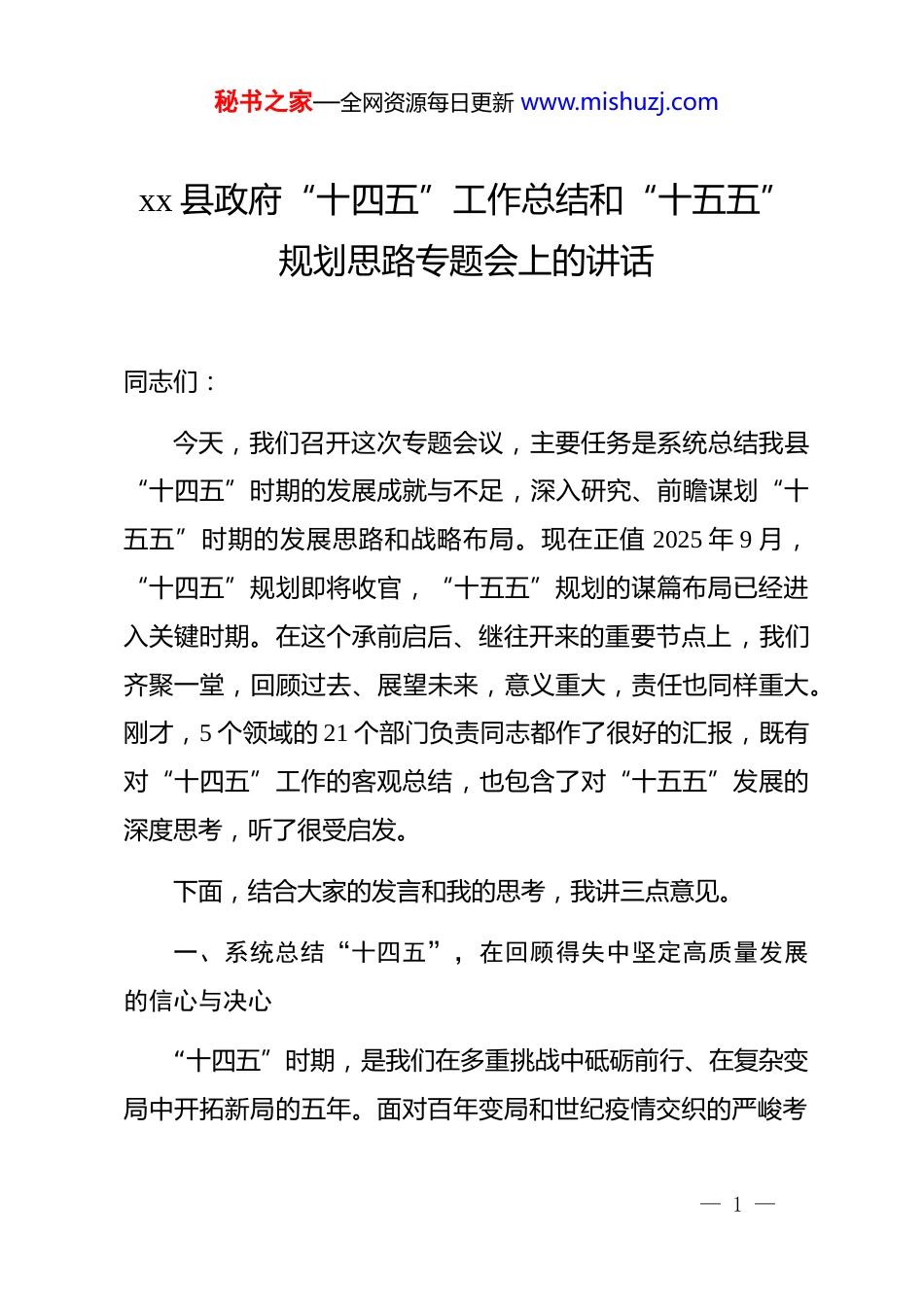 秘书之家—全网资源每日更新 www.mishuzj.comxx 县政府“十四五”工作总结和“十五五”规划思路专题会上的讲话同志们:今天,我们召开这次专题会议,主要任务是系统总结我县“十四五”时期的发展成就与不足,深入研究、前瞻谋划“十五五”时期的发展思路和战略布局。现在正值 2025 年 9 月,“十四五”规划即将收官,“十五五”规划的谋篇布局已经进入关键时期。在这个承前启后、继往开来的重要节点上,我们齐聚一堂,回顾过去、展望未来,意义重大,责任也同样重大。刚才,5 个领域的 21 个部门负责同志都作了很好的汇报,既有对“十四五”工作的客观总结,也包含了对“十五五”发展的深度思考,听了很受启发。下面,结合大家的发言和我的思考,我讲三点意见。一、系统总结“十四五”,在回顾得失中坚定高质量发展的信心与决心“十四五”时期,是我们在多重挑战中砥砺前行、在复杂变局中开拓新局的五年。面对百年变局和世纪疫情交织的严峻考— 1 —秘书之家—全网资源每日更新 www.mishuzj.com验,面对经济下行压力持续加大的宏观环境,全县上下在 xx 省委省政府、xx 市委市政府和县委的坚强领导下,迎难而上、奋力拼搏,推动经济社会发展取得了来之不易的成就,为开启“十五五”新征程奠定了坚实基础。第一,发展成果丰硕,综合实力迈上新台阶。回望过去的近五年,我们最直观的感受是 xx 县的“盘子”做大了,实力更强了。我们预计,到今年年底,全县地区生产总值(gdp)将突破 650 亿元大关,相较于 2020 年的 500 多亿元,实现了显著的跨越,年均增长率有望达到 6.5%左右,增速持续位居 xx 市前列。固定资产投资累计完成额预计将超过 1800 亿元,一批打基础、利长远的重大项目落地生根、开花结果。产业结构持续优化,三次产业结构从 2021 年的 8.6:22.6:68.8,逐步向更趋合理的方向调整,特别是以数字经济、文旅康养为代表的现代服务业增加值占比稳步提升,战略性新兴产业的萌芽正在破土而出,为经济发展注入了新的活力。民生福祉持续改善,我们始终将七成以上的财力投向民生领域,城镇和农村居民人均可支配收入年均增速分别达到了 7%和 8.5%以上。xx 县中医院迁建工程、xx 县人民医院医技综合楼等项目相继投入使用,我们的医疗卫生服务能力得到了质的提升。教育事业方面,通过实施— 2 —秘书之家—全网资源每日更新 www.mishuzj.com校园安全专项整治和改扩建工程,办学条件得到持续改善,教育质量稳步提高。这些沉甸甸的数据和实实在在的变化,是全县人民共同奋斗的结果,也是我们继续前进的信心和底气所在。第二,深刻汲取经验,发展思路在实践中愈加清晰。五年的实践探索,让我们对县域高质量发展的规律性认识更加深刻。我们深刻体会到,必须坚持发展第一要务不动摇,始终把经济建设作为中心工作,以高质量项目带动高质量投资,以高质量投资支撑高质量发展。必须坚持实体经济这个根基不松懈,无论是传统产业的转型升级,还是新兴产业的培育壮大,都必须围绕构建富有竞争力的现代化产业体系来展开。必须坚持城乡融合发展不动摇,县域经济的短板在农村,潜力也在农村,只有统筹推进新型城镇化和乡村全面振兴,才能激活发展的全局。必须坚持以人民为中心的发展思想不偏离,发展的最终目的,是让全县人民过上更加幸福美好的生活。规划的编制、政策的制定、项目的实施,都必须回应群众的所思所盼所想。这些宝贵经验,是我们用汗水换来的,必须在未来的工作中长期坚持、不断完善。第三,清醒认识不足,在正视问题中找准突破方向。在肯定成绩的同时,我们更要用“放大镜”审视自身存在的短板和— 3 —秘书之家—全网资源每日更新 www.mishuzj.com问题。这既是实事求是的态度,也是谋求更大发展的起点。一是产业结构“大而不强”的问题依然突出。我们的工业体量上去了,但产业链条短、产品附加值不高、缺少具有核心竞争力的“链主”企业和“杀手锏”产品。新兴产业尚在培育期,未能形成强有力的接续支撑。二是创新驱动“引擎不强”的问题亟待破解。全社会研发投入强度偏低,高新技术企业数量不多,科技成果就地转化率不高,领军人才和...