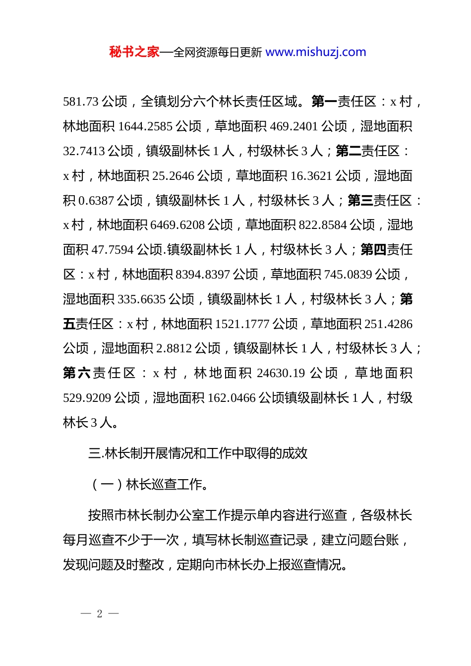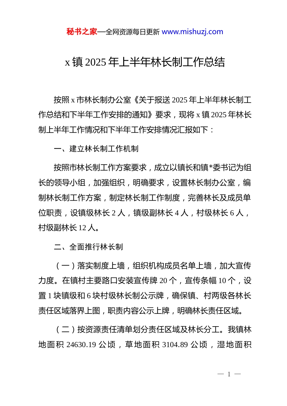秘书之家—全网资源每日更新 www.mishuzj.comx 镇 2025 年上半年林长制工作总结按照 x 市林长制办公室《关于报送 2025 年上半年林长制工作总结和下半年工作安排的通知》要求,现将 x 镇 2025 年林长制上半年工作情况和下半年工作安排情况汇报如下:一、建立林长制工作机制按照市林长制工作方案要求,成立以镇长和镇*委书记为组长的领导小组,加强组织,明确要求,设置林长制办公室,编制林长制工作方案,制定林长制工作制度,完善林长及成员单位职责,设镇级林长 2 人,镇级副林长 4 人,村级林长 6 人,村级副林长 12 人。二、全面推行林长制(一)落实制度上墙,组织机构成员名单上墙,加大宣传力度。在镇村主要路口安装宣传牌 20 个,宣传条幅 10 个,设置 1 块镇级和 6 块村级林长制公示牌,确保镇、村两级各林长责任区域落界上图,职责内容公示上牌,明确林长责任区域。(二)按资源责任清单划分责任区域及林长分工。我镇林地面积 24630.19 公顷,草地面积 3104.89 公顷,湿地面积— 1 —秘书之家—全网资源每日更新 www.mishuzj.com581.73 公顷,全镇划分六个林长责任区域。第一责任区:x 村,林地面积 1644.2585 公顷,草地面积 469.2401 公顷,湿地面积32.7413 公顷,镇级副林长 1 人,村级林长 3 人;第二责任区:x 村,林地面积 25.2646 公顷,草地面积 16.3621 公顷,湿地面积 0.6387 公顷,镇级副林长 1 人,村级林长 3 人;第三责任区:x 村,林地面积 6469.6208 公顷,草地面积 822.8584 公顷,湿地面积 47.7594 公顷.镇级副林长 1 人,村级林长 3 人;第四责任区:x 村,林地面积 8394.8397 公顷,草地面积 745.0839 公顷,湿地面积 335.6635 公顷,镇级副林长 1 人,村级林长 3 人;第五责任区:x 村,林地面积 1521.1777 公顷,草地面积 251.4286公顷,湿地面积 2.8812 公顷,镇级副林长 1 人,村级林长 3 人;第 六 责 任 区 : x 村 , 林 地 面 积 24630.19 公 顷 , 草 地 面 积529.9209 公顷,湿地面积 162.0466 公顷镇级副林长 1 人,村级林长 3 人。三.林长制开展情况和工作中取得的成效(一)林长巡查工作。按照市林长制办公室工作提示单内容进行巡查,各级林长每月巡查不少于一次,填写林长制巡查记录,建立问题台账,发现问题及时整改,定期向市林长办上报巡查情况。— 2 —秘书之家—全网资源每日更新 www.mishuzj.com(二)森林资源培育方面。发动全镇干部群众,参与到生态文明建设、清退已垦林地生态修复工作中,按时保质保量完成当年义务植树任务 5 万株,积极鼓励群众因地制宜发展经济林,鼓励社会各类主体参与造林,通过补植、管护等多种形式,造林成活率达 85%、苗木保存率达 80%以上,辖区内森林覆盖率、林业用地面积无减少,森林活立木蓄积量有所增加,造林和植被恢复工作取得成效。(三)村屯绿化美化工程实施情况。我镇 2025 年村屯绿化美化实施村,x 村,项目正在实施中。(四)强化林地保护管理。一是全面开展打击毁林开垦专项行动,2025 年专项整治行动问题图斑 143 个,销号 143 个。其中,森林督查 14 个图斑,住建领域 34 个图斑,住建领域回头看 30 个图斑,2024 年国土变更图斑 61 个图斑,2025 年以来下发图斑和群众举报 1 个图斑。处理市级林长巡查问题台账(第二季度)巡查中发现的问题,已经全部按照市委、市政府要求完成整改。二是对退耕还林、防护林、试点等造林工程中不合格的小班地块及时进行补植补造,对没有完成补植补造的下达整改通知,限期完成补植补造。— 3 —秘书之家—全网资源每日更新 www.mishuzj.com三是对 2023、2024 年采伐迹地和森林督查点进行查看,已建立问题台账,并加强整改措施。(五)森林防火工作。成立防火指挥部,召开全镇森林草原防灭火专题会议,部署防火工作,制定防灭火预案,上半年没有发生野外火情,确保森林资源安全。(六)林政管理方面。1.建立健全森林、林木和林地权属管理档案,加强林地和集体,个体林权管理,强化证件审查。...