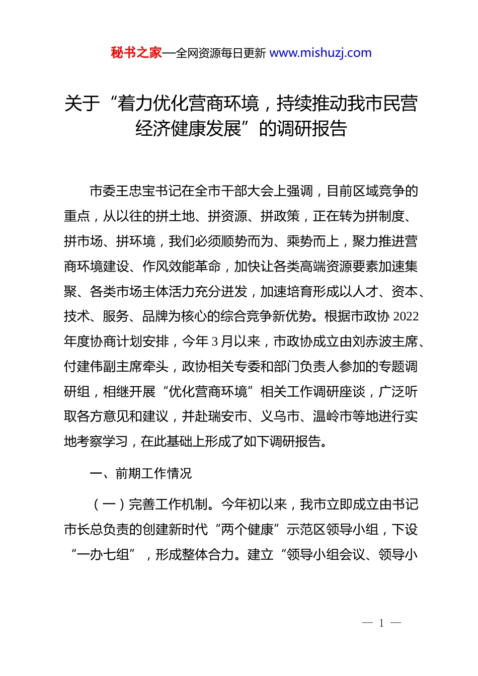 秘书之家—全网资源每日更新 www.mishuzj.com关于“着力优化营商环境,持续推动我市民营经济健康发展”的调研报告市委王忠宝书记在全市干部大会上强调,目前区域竞争的重点,从以往的拼土地、拼资源、拼政策,正在转为拼制度、拼市场、拼环境,我们必须顺势而为、乘势而上,聚力推进营商环境建设、作风效能革命,加快让各类高端资源要素加速集聚、各类市场主体活力充分迸发,加速培育形成以人才、资本、技术、服务、品牌为核心的综合竞争新优势。根据市政协 2022年度协商计划安排,今年 3 月以来,市政协成立由刘赤波主席、付建伟副主席牵头,政协相关专委和部门负责人参加的专题调研组,相继开展“优化营商环境”相关工作调研座谈,广泛听取各方意见和建议,并赴瑞安市、义乌市、温岭市等地进行实地考察学习,在此基础上形成了如下调研报告。一、前期工作情况(一)完善工作机制。今年初以来,我市立即成立由书记市长总负责的创建新时代“两个健康”示范区领导小组,下设“一办七组”,形成整体合力。建立“领导小组会议、领导小— 1 —秘书之家—全网资源每日更新 www.mishuzj.com组办公室会议和‘一办七组’工作例会”三级例会制度,以及部门联动、交办督办和双向激励制度,全力抓好工作落实。按照“1+x”文件体系要求,出台了一系列针对性强、含金量高、可供操作的政策文件。截至目前,我市各相关单位共出台或起草涉及优化营商环境工作的各类规章政策 31 份,其中已正式发文 19 份,仍在拟稿中或征求意见中的文件 12 份。(二)优化政务服务。深入推进“最多跑一次”改革,以政务服务“浇水施肥”,进一步优化营商环境。推进政务服务便利化建设,设立“一站式”业务受理窗口,累计为 90 余家企业提供汽车空调产品研发设计、检验检测、标准服务、信息咨询等服务 1350 次。深化“证照分离”改革,继续推行企业开办“零成本”一日办结,企业投资项目“一站式”审批。制定《龙泉市行政服务中心投资项目审批“一站式”服务区块运行方案(试行)》,全面梳理各职能部门投资项目审批事项。(三)激发市场活力。2021 年,全市“四上”(规上工业,规上服务业,限上批发零售业,限上住宿餐饮业和资质建筑业)企业共有 259 家,其中民营企业 240 家,占四上企业数比重 92.7%。民营经济营业收入 168.4 亿元,营业收入占“四上”企业比重 94.8%。为进一步提高服务质效,着力激发市场— 2 —秘书之家—全网资源每日更新 www.mishuzj.com主体活力和发展内生动力,我市出台《关于助力市场主体提质增效促进经济高质量发展的二十一条意见》,全力激活市场主体活力。扎实开展精准服务企业“365”专项行动,全市副处级以上领导干部、驻企服务员定期主动上门收集企业诉求,通过领导帮办、部门领办、专题协办、挂牌督办等方式全力帮扶企业。从相关部门单位选派 22 名业务骨干到企业担任总经理助理,全力推动民营经济高质量绿色发展。(四)重视企业家地位。紧扣“两个健康”工作主题,关心关爱企业健康发展,呵护企业家健康成长。发布以“五不五有五好”为核心的省内首个清廉民企建设评星定级评价标准体系,以国镜药业、三田集团、浙江能福、双益菇业等 9 家企业为创建示范单位,打造清廉民企“龙泉样板”。结合我市实际立足优化市场环境、政策环境、法制环境、政务环境,出台框架性系列企业帮扶政策。举办“亲清直通车·政企恳谈会”等活动,邀请企业代表、商会代表共商对策,促成实际问题解决。在《龙泉工商界》等设立专栏,积极开展龙商宣传,树立企业家良好社会形象。(五)强化要素保障。强化土地、资金、技术、创新等要素保障,有力推动全市绿色高质量发展。推进工业平台“二次— 3 —秘书之家—全网资源每日更新 www.mishuzj.com创业”,拓展工业空间,实施工业企业“腾笼换鸟”三年行动,今年以来共新增工业用地出让 164.69 亩,其中新出让面积134.5 亩,二次开发面积 30.18 亩。推动全市高新技术企业数量和质量全面提升,获评国家外贸转型升级基地和中国汽车空调零部件制造先进基地,汽车空调产业列入全省打造百亿规模特色优势产业。加快推进产业...