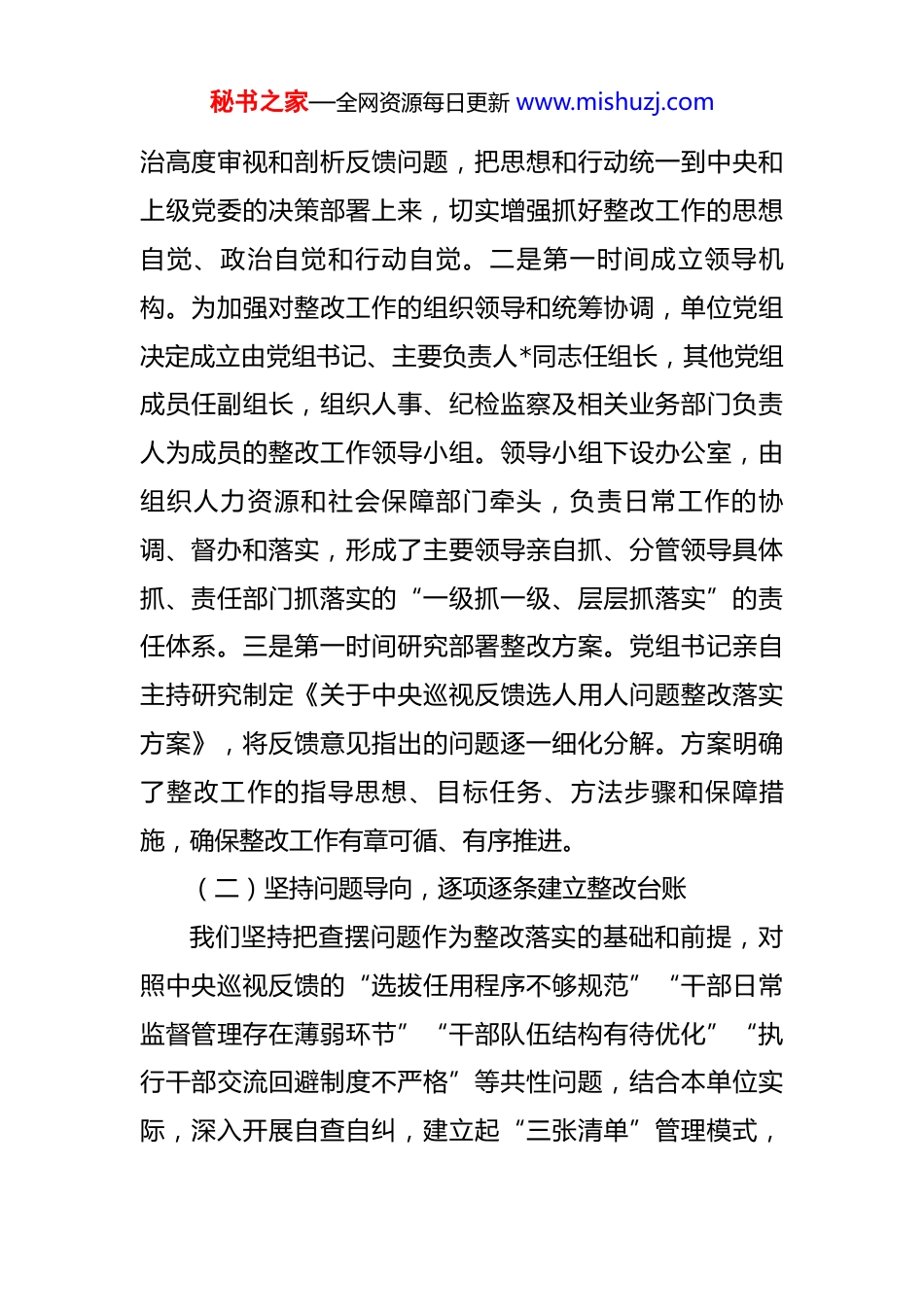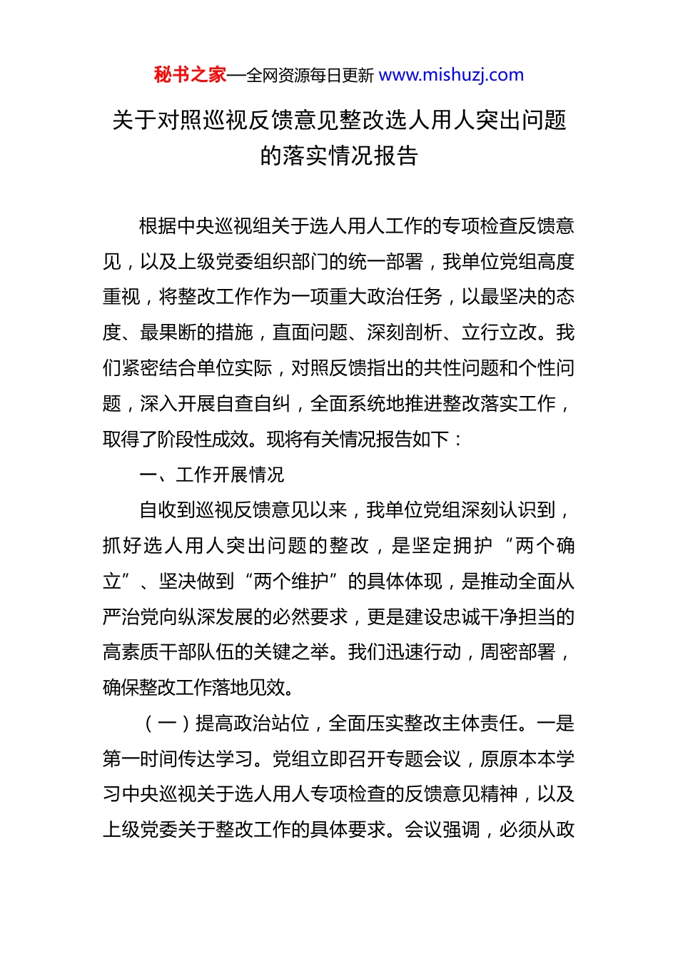 秘书之家—全网资源每日更新 www.mishuzj.com关于对照巡视反馈意见整改选人用人突出问题的落实情况报告 根据中央巡视组关于选人用人工作的专项检查反馈意见,以及上级党委组织部门的统一部署,我单位党组高度重视,将整改工作作为一项重大政治任务,以最坚决的态度、最果断的措施,直面问题、深刻剖析、立行立改。我们紧密结合单位实际,对照反馈指出的共性问题和个性问题,深入开展自查自纠,全面系统地推进整改落实工作,取得了阶段性成效。现将有关情况报告如下:一、工作开展情况自收到巡视反馈意见以来,我单位党组深刻认识到,抓好选人用人突出问题的整改,是坚定拥护“两个确立”、坚决做到“两个维护”的具体体现,是推动全面从严治党向纵深发展的必然要求,更是建设忠诚干净担当的高素质干部队伍的关键之举。我们迅速行动,周密部署,确保整改工作落地见效。(一)提高政治站位,全面压实整改主体责任。一是第一时间传达学习。党组立即召开专题会议,原原本本学习中央巡视关于选人用人专项检查的反馈意见精神,以及上级党委关于整改工作的具体要求。会议强调,必须从政秘书之家—全网资源每日更新 www.mishuzj.com治高度审视和剖析反馈问题,把思想和行动统一到中央和上级党委的决策部署上来,切实增强抓好整改工作的思想自觉、政治自觉和行动自觉。二是第一时间成立领导机构。为加强对整改工作的组织领导和统筹协调,单位党组决定成立由党组书记、主要负责人*同志任组长,其他党组成员任副组长,组织人事、纪检监察及相关业务部门负责人为成员的整改工作领导小组。领导小组下设办公室,由组织人力资源和社会保障部门牵头,负责日常工作的协调、督办和落实,形成了主要领导亲自抓、分管领导具体抓、责任部门抓落实的“一级抓一级、层层抓落实”的责任体系。三是第一时间研究部署整改方案。党组书记亲自主持研究制定《关于中央巡视反馈选人用人问题整改落实方案》,将反馈意见指出的问题逐一细化分解。方案明确了整改工作的指导思想、目标任务、方法步骤和保障措施,确保整改工作有章可循、有序推进。(二)坚持问题导向,逐项逐条建立整改台账我们坚持把查摆问题作为整改落实的基础和前提,对照中央巡视反馈的“选拔任用程序不够规范”“干部日常监督管理存在薄弱环节”“干部队伍结构有待优化”“执行干部交流回避制度不严格”等共性问题,结合本单位实际,深入开展自查自纠,建立起“三张清单”管理模式,秘书之家—全网资源每日更新 www.mishuzj.com实行挂图作战、对账销号。。一是全面梳理,建立“问题清单”。组织人力资源和社会保障部门牵头,对 2020 年以来的干部选拔任用工作进行了全面“回头看”,系统梳理出本单位在选人用人方面存在的 3 大类共 11 个具体问题。每一个问题都清晰描述其具体表现、涉及人员和产生原因,确保问题找得准、挖得深。二是细化措施,建立“任务清单”。针对“问题清单”中的每一个问题,我们都制定了具体、可操作的整改措施。譬如,针对“选拔任用程序不够规范”的问题,我们明确了“严格执行动议、民主推荐、考察、讨论决定、任职前公示等程序,完善全程纪实档案”等 5 条具体整改措施。目前,11 个问题共计细化为 35 项整改任务,每一项任务都明确了整改目标和具体内容。三是明确分工,建立“责任清单”。为防止责任虚化、任务空转,我们将 35 项整改任务逐一分解,明确了牵头领导、责任部门、具体责任人和完成时限。譬如,“加强干部日常监督管理”的任务由分管纪检监察工作的党组成员*同志牵头,纪检监察室与组织人事科共同负责,确保压力传导到位、责任落实到人。截至 2025 年 9 月底,清单中的 35 项任务已完成 33 项,完成率达到 94.3%,剩余2 项长期坚持的任务正在持续推进中。(三)聚焦标本兼治,健全完善长效制度机制秘书之家—全网资源每日更新 www.mishuzj.com我们深刻认识到,巡视整改不仅要解决当前存在的具体问题,更要深挖问题根源,从制度层面堵塞漏洞、防患于未然,真正做到“整改一个问题、完善一套制度、治理一个领域”。。一是着力规范选人用人程序。坚持把制度建设贯穿整改全过程...