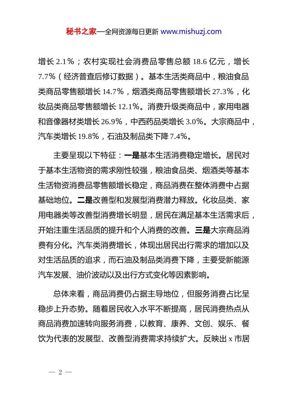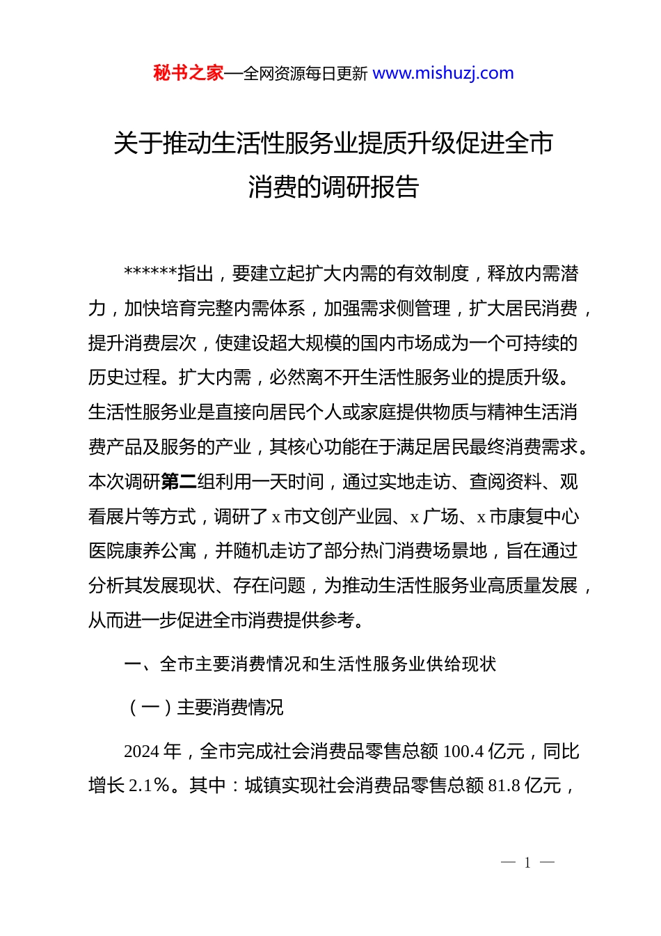 秘书之家—全网资源每日更新 www.mishuzj.com关于推动生活性服务业提质升级促进全市消费的调研报告******指出,要建立起扩大内需的有效制度,释放内需潜力,加快培育完整内需体系,加强需求侧管理,扩大居民消费,提升消费层次,使建设超大规模的国内市场成为一个可持续的历史过程。扩大内需,必然离不开生活性服务业的提质升级。生活性服务业是直接向居民个人或家庭提供物质与精神生活消费产品及服务的产业,其核心功能在于满足居民最终消费需求。本次调研第二组利用一天时间,通过实地走访、查阅资料、观看展片等方式,调研了 x 市文创产业园、x 广场、x 市康复中心医院康养公寓,并随机走访了部分热门消费场景地,旨在通过分析其发展现状、存在问题,为推动生活性服务业高质量发展,从而进一步促进全市消费提供参考。一、全市主要消费情况和生活性服务业供给现状(一)主要消费情况2024 年,全市完成社会消费品零售总额 100.4 亿元,同比增长 2.1%。其中:城镇实现社会消费品零售总额 81.8 亿元,— 1 —秘书之家—全网资源每日更新 www.mishuzj.com增长 2.1%;农村实现社会消费品零售总额 18.6 亿元,增长7.7%(经济普查后修订数据)。基本生活类商品中,粮油食品类商品零售额增长 14.7%,烟酒类商品零售额增长 27.3%,化妆品类商品零售额增长 12.1%。消费升级类商品中,家用电器和音像器材类增长 26.9%,中西药品类增长 3.0%。大宗商品中,汽车类增长 19.8%,石油及制品类下降 7.4%。主要呈现以下特征:一是基本生活消费稳定增长。居民对于基本生活物资的需求刚性较强,粮油食品类、烟酒类等基本生活物资消费品零售额增长稳定,商品消费在整体消费中占据基础地位。二是改善型和发展型消费潜力释放。化妆品类、家用电器类等改善型消费增长明显,居民在满足基本生活需求后,开始注重生活品质的提升和个人消费的改善。三是大宗商品消费有分化。汽车类消费增长,体现出居民出行需求的增加以及对生活品质的追求,而石油及制品类消费下降,主要受新能源汽车发展、油价波动以及出行方式变化等因素影响。总体来看,商品消费仍占据主导地位,但服务消费占比呈稳步上升态势。随着居民收入水平不断提高,居民消费热点从商品消费加速转向服务消费,以教育、康养、文创、娱乐、餐饮为代表的发展型、改善型消费需求持续扩大。反映出 x 市居— 2 —秘书之家—全网资源每日更新 www.mishuzj.com民消费正从满足基本生活需求向追求高品质生活加速转变。(二)生活性服务业供给现状近年来,x 市积极丰富应用场景,激发消费新活力,夜间经济、体验式消费等新型消费场景不断涌现。通过制定消费品以旧换新政策、争取专项资金、开展促销活动、加大商贸主体培育力度等措施,有效促进了消费市场的活跃和消费需求的释放。一是全市各大消费市场持续向好。2019-2024 年,限额以上零售业商品销售额由 18.57 亿元增长至 32.96 亿元,年均增长率 16%。零售业从业人员由 920 人增长至 1690 人,年均增长率16.42%。依托 x、x、x,精心打造 3 处夜间消费场所,“夜游”“夜演”“夜娱”“夜食”等多元消费业态,让城市烟火味更浓。持续推进“城市一刻钟便民生活圈”建设,x 鲜生商业综合体、x 商场升级改造项目投运,x 智慧服务平台完成系统搭建,对接 600 余家商户,绘制便民生活服务导视图 24 个。消费领域,逐渐呈现出传统消费逐渐向追求品质的服务型消费拓展的趋势。二是住宿和餐饮行业企稳回升。2019-2024 年,住宿和餐— 3 —秘书之家—全网资源每日更新 www.mishuzj.com饮 业 增 加 值 由 2.71 亿 元 增 长 至 6.76 亿 元 , 年 均 增 长 率20.06%。2019-2023 年限额以上住宿和餐饮业营业额由 1.47亿元增长至 2.17 亿元,年均增长率 10.23%,我市已形成以大型酒店饭店为龙头,火锅店、农家乐、美食街、中小型餐馆为主体,大中小、高中低、中西兼具竞相发展的态势,餐饮业已成为繁荣市场、扩大内需、拉动消费、增加就业,推动全市经济多元发展的重要力量。三是银发经济和托育需求前景广阔。2019-2024 ...