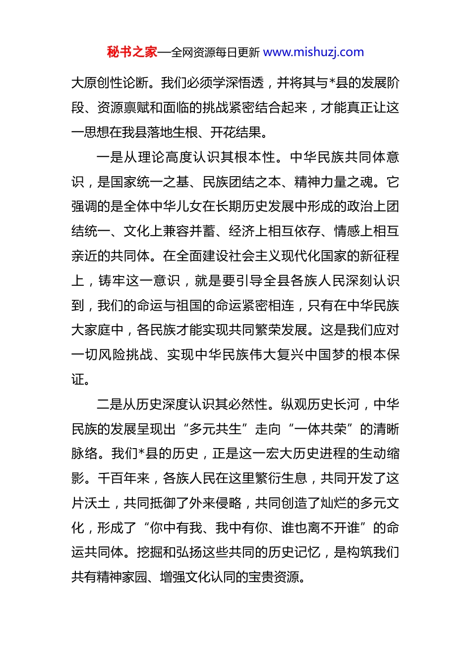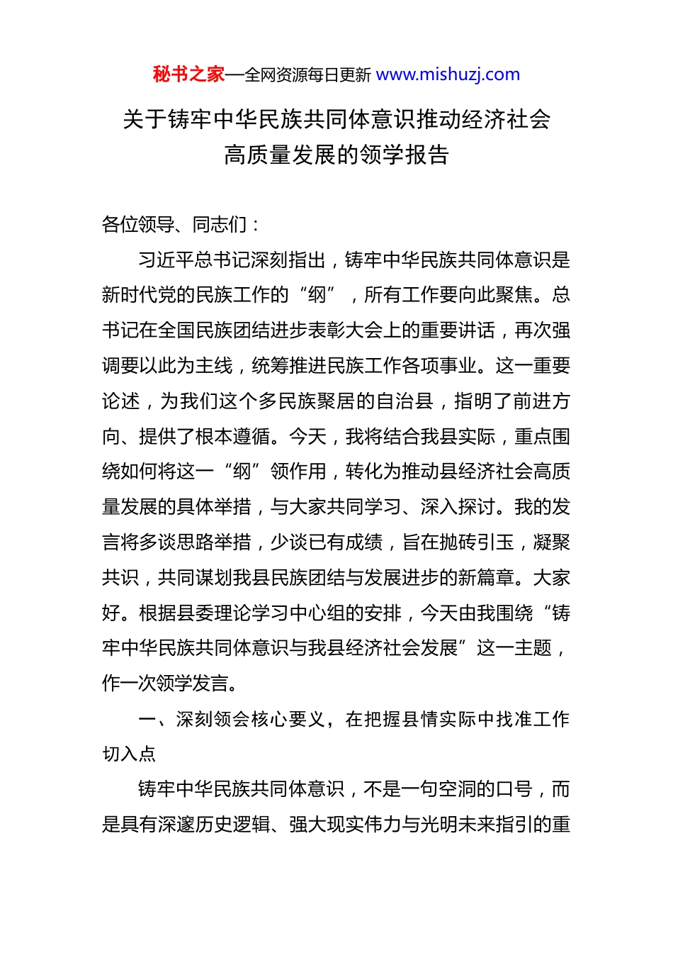 秘书之家—全网资源每日更新 www.mishuzj.com关于铸牢中华民族共同体意识推动经济社会高质量发展的领学报告 各位领导、同志们:习近平总书记深刻指出,铸牢中华民族共同体意识是新时代党的民族工作的“纲”,所有工作要向此聚焦。总书记在全国民族团结进步表彰大会上的重要讲话,再次强调要以此为主线,统筹推进民族工作各项事业。这一重要论述,为我们这个多民族聚居的自治县,指明了前进方向、提供了根本遵循。今天,我将结合我县实际,重点围绕如何将这一“纲”领作用,转化为推动县经济社会高质量发展的具体举措,与大家共同学习、深入探讨。我的发言将多谈思路举措,少谈已有成绩,旨在抛砖引玉,凝聚共识,共同谋划我县民族团结与发展进步的新篇章。大家好。根据县委理论学习中心组的安排,今天由我围绕“铸牢中华民族共同体意识与我县经济社会发展”这一主题,作一次领学发言。一、深刻领会核心要义,在把握县情实际中找准工作切入点铸牢中华民族共同体意识,不是一句空洞的口号,而是具有深邃历史逻辑、强大现实伟力与光明未来指引的重秘书之家—全网资源每日更新 www.mishuzj.com大原创性论断。我们必须学深悟透,并将其与*县的发展阶段、资源禀赋和面临的挑战紧密结合起来,才能真正让这一思想在我县落地生根、开花结果。一是从理论高度认识其根本性。中华民族共同体意识,是国家统一之基、民族团结之本、精神力量之魂。它强调的是全体中华儿女在长期历史发展中形成的政治上团结统一、文化上兼容并蓄、经济上相互依存、情感上相互亲近的共同体。在全面建设社会主义现代化国家的新征程上,铸牢这一意识,就是要引导全县各族人民深刻认识到,我们的命运与祖国的命运紧密相连,只有在中华民族大家庭中,各民族才能实现共同繁荣发展。这是我们应对一切风险挑战、实现中华民族伟大复兴中国梦的根本保证。二是从历史深度认识其必然性。纵观历史长河,中华民族的发展呈现出“多元共生”走向“一体共荣”的清晰脉络。我们*县的历史,正是这一宏大历史进程的生动缩影。千百年来,各族人民在这里繁衍生息,共同开发了这片沃土,共同抵御了外来侵略,共同创造了灿烂的多元文化,形成了“你中有我、我中有你、谁也离不开谁”的命运共同体。挖掘和弘扬这些共同的历史记忆,是构筑我们共有精神家园、增强文化认同的宝贵资源。秘书之家—全网资源每日更新 www.mishuzj.com三是从现实维度认识其紧迫性。当前,*县正处于转型升级、爬坡过坎的关键时期。根据县统计局最新数据,预计到 2025 年底,我县地区生产总值将达到 165 亿元,同比 增 长 6.5% 。 三 次 产 业 结 构 持 续 优 化 , 预 计 调 整 为17.5:40.5:42.0,第三产业比重稳步提升,显示出经济发展的活力和潜力。全县居民人均可支配收入预计达到36800 元,同比增长 7%。这些数据令人振奋,但我们更要清醒地看到发展中的不平衡不充分问题。一是产业结构仍需优化。我县的特色农业和文旅产业虽有基础,但产业链条短、品牌效应不强、抗风险能力弱的问题依然突出,未能完全转化为各族群众持续增收的强大动力。二是城乡区域发展不平衡。部分偏远乡镇的基础设施,如交通、水利、信息网络等仍是短板,公共服务供给与人民群众的期盼还有差距,这直接影响了各族群众的获得感、幸福感、安全感。三是文化传承与创新面临压力。在全球化和信息化浪潮冲击下,如何保护好、传承好、利用好我县宝贵的民族传统文化,并将其创造性转化为推动文旅深度融合发展的独特优势,是我们必须破解的课题。四是从挑战角度认识其艰巨性。我们必须正视,在铸牢中华民族共同体意识、推动高质量发展的道路上,依然面临诸多挑战。四是防范化解风险隐患的任务依然艰巨。意识形态领域的斗争秘书之家—全网资源每日更新 www.mishuzj.com复杂尖锐,境外敌对势力利用民族、宗教问题进行渗透破坏的风险始终存在,维护社会和谐稳定的任务不容丝毫懈怠。这些问题,既是发展的难题,也是影响民族团结的潜在风险点。因此,将铸牢中华民族共同体意识与解决这些实际问题结合起来,既是政治任务,更是现实需要。二、聚焦关键领域,以务实举措推动...