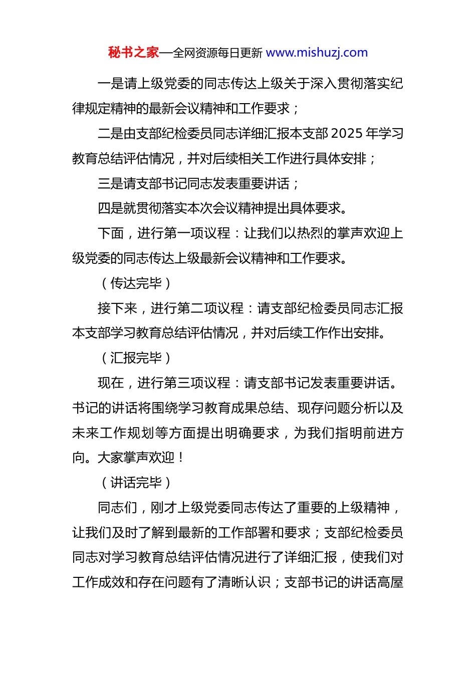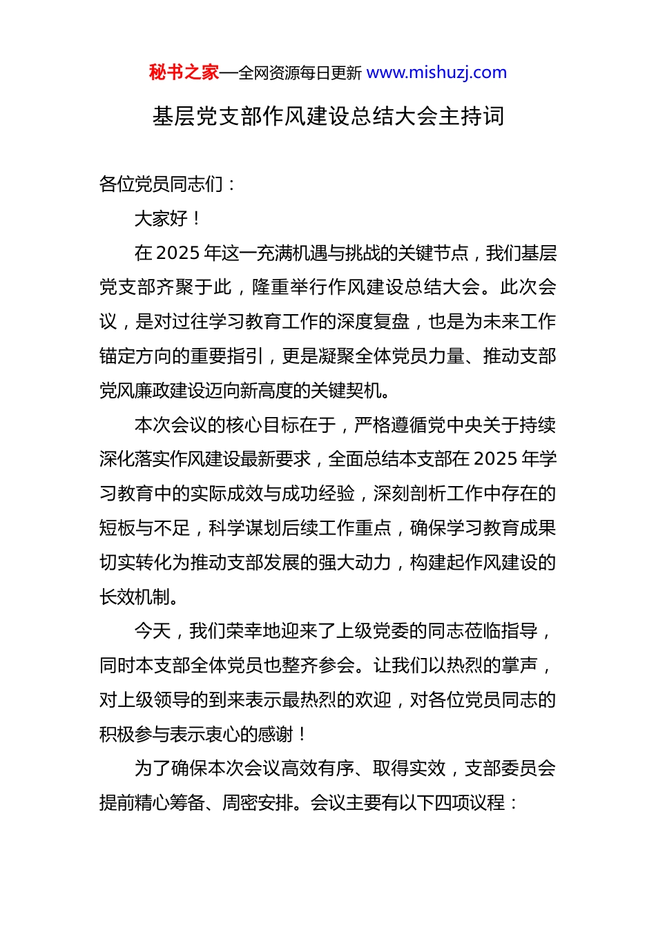 秘书之家—全网资源每日更新 www.mishuzj.com基层党支部作风建设总结大会主持词 各位党员同志们:大家好!在 2025 年这一充满机遇与挑战的关键节点,我们基层党支部齐聚于此,隆重举行作风建设总结大会。此次会议,是对过往学习教育工作的深度复盘,也是为未来工作锚定方向的重要指引,更是凝聚全体党员力量、推动支部党风廉政建设迈向新高度的关键契机。本次会议的核心目标在于,严格遵循党中央关于持续深化落实作风建设最新要求,全面总结本支部在 2025 年学习教育中的实际成效与成功经验,深刻剖析工作中存在的短板与不足,科学谋划后续工作重点,确保学习教育成果切实转化为推动支部发展的强大动力,构建起作风建设的长效机制。今天,我们荣幸地迎来了上级党委的同志莅临指导,同时本支部全体党员也整齐参会。让我们以热烈的掌声,对上级领导的到来表示最热烈的欢迎,对各位党员同志的积极参与表示衷心的感谢!为了确保本次会议高效有序、取得实效,支部委员会提前精心筹备、周密安排。会议主要有以下四项议程:秘书之家—全网资源每日更新 www.mishuzj.com一是请上级党委的同志传达上级关于深入贯彻落实纪律规定精神的最新会议精神和工作要求;二是由支部纪检委员同志详细汇报本支部 2025 年学习教育总结评估情况,并对后续相关工作进行具体安排;三是请支部书记同志发表重要讲话;四是就贯彻落实本次会议精神提出具体要求。下面,进行第一项议程:让我们以热烈的掌声欢迎上级党委的同志传达上级最新会议精神和工作要求。(传达完毕)接下来,进行第二项议程:请支部纪检委员同志汇报本支部学习教育总结评估情况,并对后续工作作出安排。(汇报完毕)现在,进行第三项议程:请支部书记发表重要讲话。书记的讲话将围绕学习教育成果总结、现存问题分析以及未来工作规划等方面提出明确要求,为我们指明前进方向。大家掌声欢迎!(讲话完毕)同志们,刚才上级党委同志传达了重要的上级精神,让我们及时了解到最新的工作部署和要求;支部纪检委员同志对学习教育总结评估情况进行了详细汇报,使我们对工作成效和存在问题有了清晰认识;支部书记的讲话高屋秘书之家—全网资源每日更新 www.mishuzj.com建瓴、内涵丰富,全面总结了学习教育取得的显著成效,深入剖析了存在的问题短板,并对巩固拓展成果、推动长效发展作出了系统部署。讲话政治站位高、思想深刻、指导性强,为我们下一步工作提供了精准的行动指南。在这里,我再强调五点要求,希望大家认真抓好落实:一、提高政治站位,筑牢思想根基。全体党员要深刻认识到深入贯彻落实纪律规定精神的重大政治意义,将其作为增强“四个意识”、坚定“四个自信”、做到“两个维护”的具体实践。不断提高政治判断力、政治领悟力、政治执行力,始终在思想上、政治上、行动上同以习近平同志为核心的党中央保持高度一致。通过持续加强政治理论学习,筑牢信仰之基、补足精神之钙、把稳思想之舵,确保在任何时候、任何情况下都能保持政治上的清醒和坚定。二、坚持问题导向,狠抓整改落实。针对学习教育中查摆出来的问题,全体党员要建立详细的问题清单、责任清单和整改清单,明确整改措施、整改时限和责任人。以“钉钉子”精神,一项一项抓整改,一个一个改到位,确保问题得到彻底解决。同时,要举一反三,深入分析问题产生的根源,建立健全长效机制,防止问题反弹回潮。在秘书之家—全网资源每日更新 www.mishuzj.com整改过程中,要注重实效,不搞形式主义,以实实在在的整改成效取信于民。三、强化纪律意识,严守行为底线。全体党员要严格遵守党的纪律和规矩,自觉遵守纪律规定及其要求,做到心有所畏、言有所戒、行有所止。要时刻保持清醒的头脑,坚决抵制各种腐朽思想的侵蚀,杜绝违规违纪行为的发生。在日常工作和生活中,要严格执行廉洁自律各项规定,规范自身行为,树立良好的党员形象。支部纪检委员要加强对党员遵守纪律情况的监督检查,对发现的问题及时进行提醒和纠正,对违规违纪行为严肃查处。四、注重成果转化,推动工作发展。要把学习教育成果切实转化为推动工作的强大动力,将作风建设与业务工作紧密结合起来。以优良...