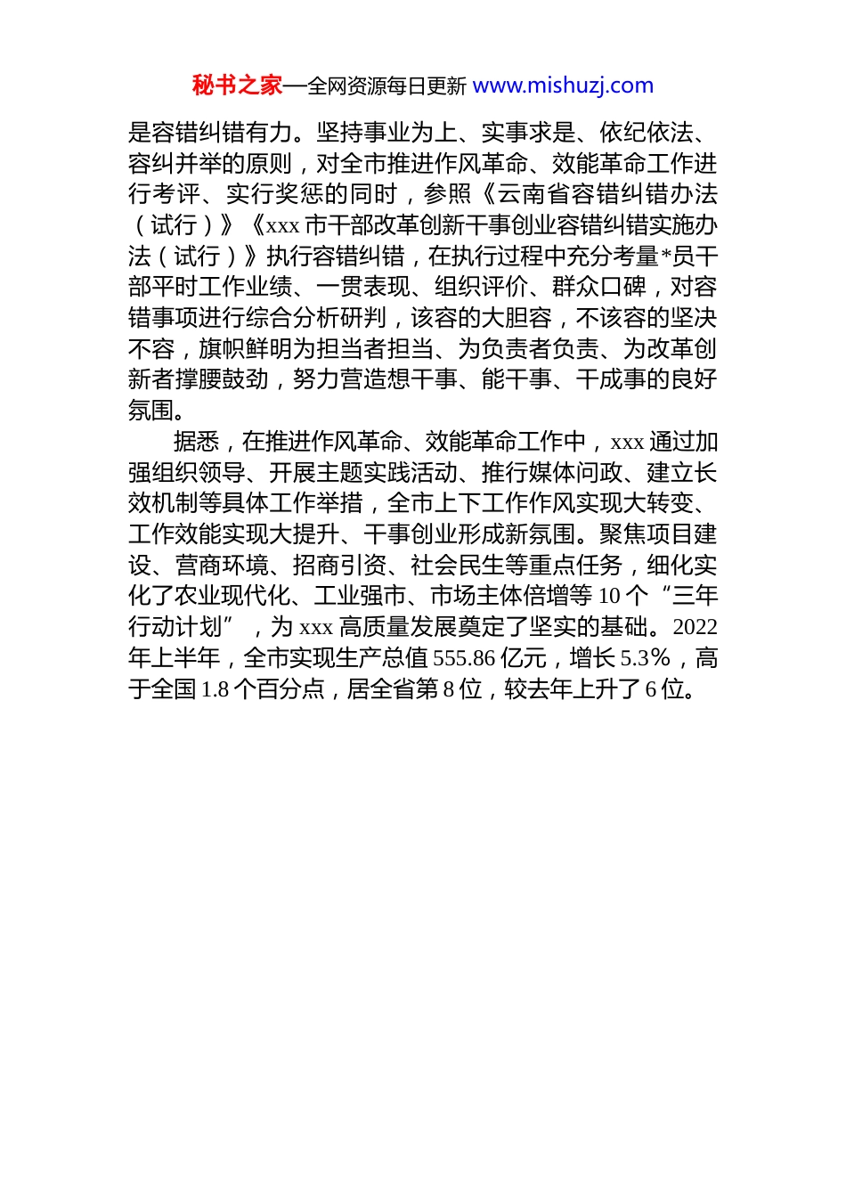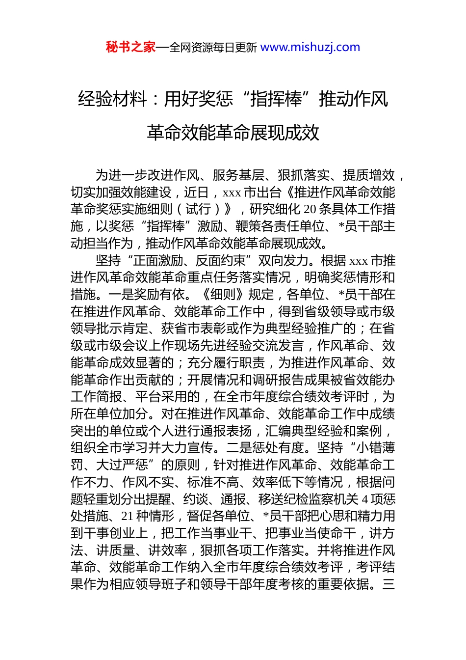 秘书之家—全网资源每日更新 www.mishuzj.com经验材料:用好奖惩“指挥棒”推动作风革命效能革命展现成效为进一步改进作风、服务基层、狠抓落实、提质增效,切实加强效能建设,近日,xxx 市出台《推进作风革命效能革命奖惩实施细则(试行)》,研究细化 20 条具体工作措施,以奖惩“指挥棒”激励、鞭策各责任单位、*员干部主动担当作为,推动作风革命效能革命展现成效。坚持“正面激励、反面约束”双向发力。根据 xxx 市推进作风革命效能革命重点任务落实情况,明确奖惩情形和措施。一是奖励有依。《细则》规定,各单位、*员干部在在推进作风革命、效能革命工作中,得到省级领导或市级领导批示肯定、获省市表彰或作为典型经验推广的;在省级或市级会议上作现场先进经验交流发言,作风革命、效能革命成效显著的;充分履行职责,为推进作风革命、效能革命作出贡献的;开展情况和调研报告成果被省效能办工作简报、平台采用的,在全市年度综合绩效考评时,为所在单位加分。对在推进作风革命、效能革命工作中成绩突出的单位或个人进行通报表扬,汇编典型经验和案例,组织全市学习并大力宣传。二是惩处有度。坚持“小错薄罚、大过严惩”的原则,针对推进作风革命、效能革命工作不力、作风不实、标准不高、效率低下等情况,根据问题轻重划分出提醒、约谈、通报、移送纪检监察机关 4 项惩处措施、21 种情形,督促各单位、*员干部把心思和精力用到干事创业上,把工作当事业干、把事业当使命干,讲方法、讲质量、讲效率,狠抓各项工作落实。并将推进作风革命、效能革命工作纳入全市年度综合绩效考评,考评结果作为相应领导班子和领导干部年度考核的重要依据。三秘书之家—全网资源每日更新 www.mishuzj.com是容错纠错有力。坚持事业为上、实事求是、依纪依法、容纠并举的原则,对全市推进作风革命、效能革命工作进行考评、实行奖惩的同时,参照《云南省容错纠错办法(试行)》《xxx 市干部改革创新干事创业容错纠错实施办法(试行)》执行容错纠错,在执行过程中充分考量*员干部平时工作业绩、一贯表现、组织评价、群众口碑,对容错事项进行综合分析研判,该容的大胆容,不该容的坚决不容,旗帜鲜明为担当者担当、为负责者负责、为改革创新者撑腰鼓劲,努力营造想干事、能干事、干成事的良好氛围。据悉,在推进作风革命、效能革命工作中,xxx 通过加强组织领导、开展主题实践活动、推行媒体问政、建立长效机制等具体工作举措,全市上下工作作风实现大转变、工作效能实现大提升、干事创业形成新氛围。聚焦项目建设、营商环境、招商引资、社会民生等重点任务,细化实化了农业现代化、工业强市、市场主体倍增等 10 个“三年行动计划”,为 xxx 高质量发展奠定了坚实的基础。2022年上半年,全市实现生产总值 555.86 亿元,增长 5.3%,高于全国 1.8 个百分点,居全省第 8 位,较去年上升了 6 位。