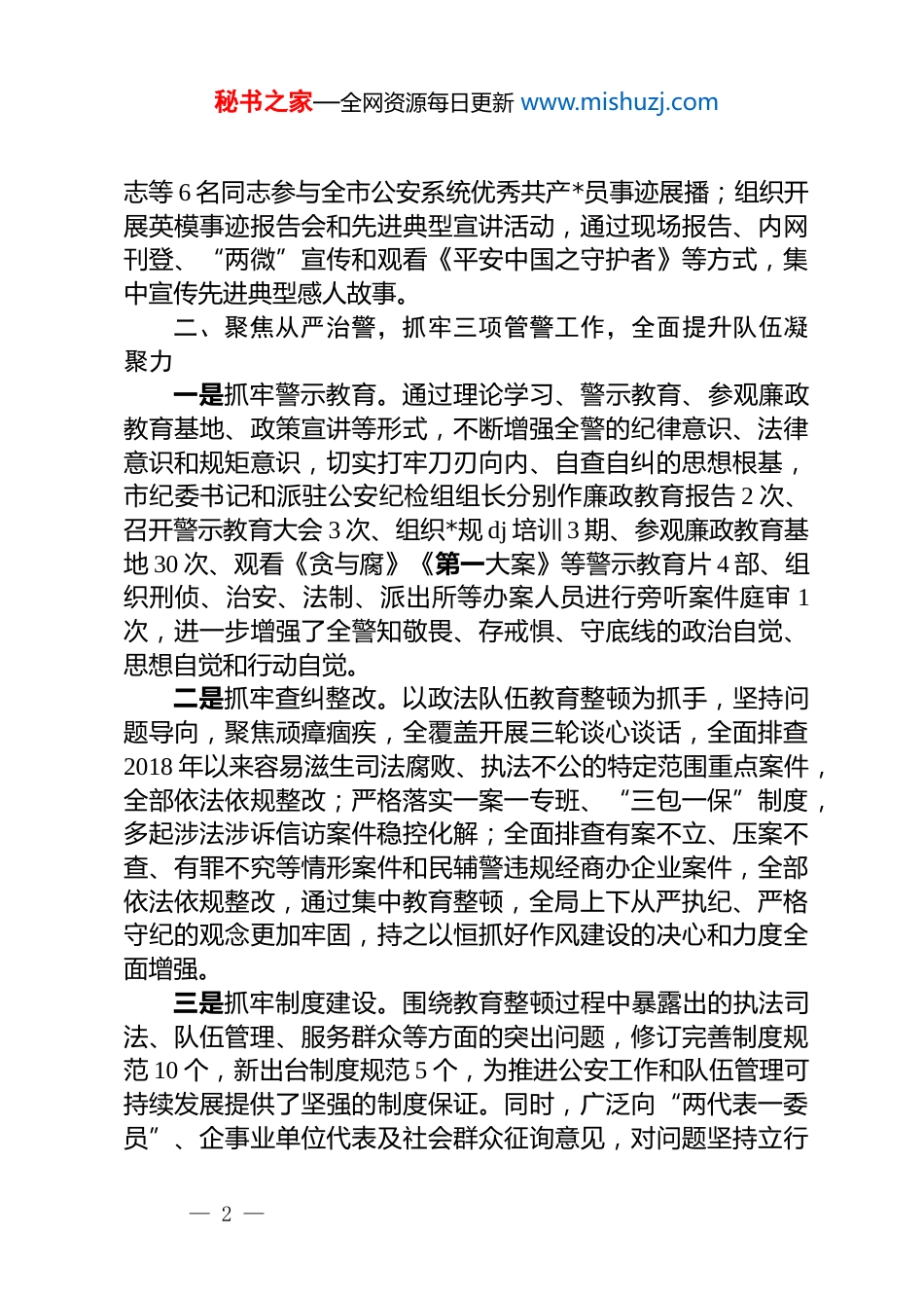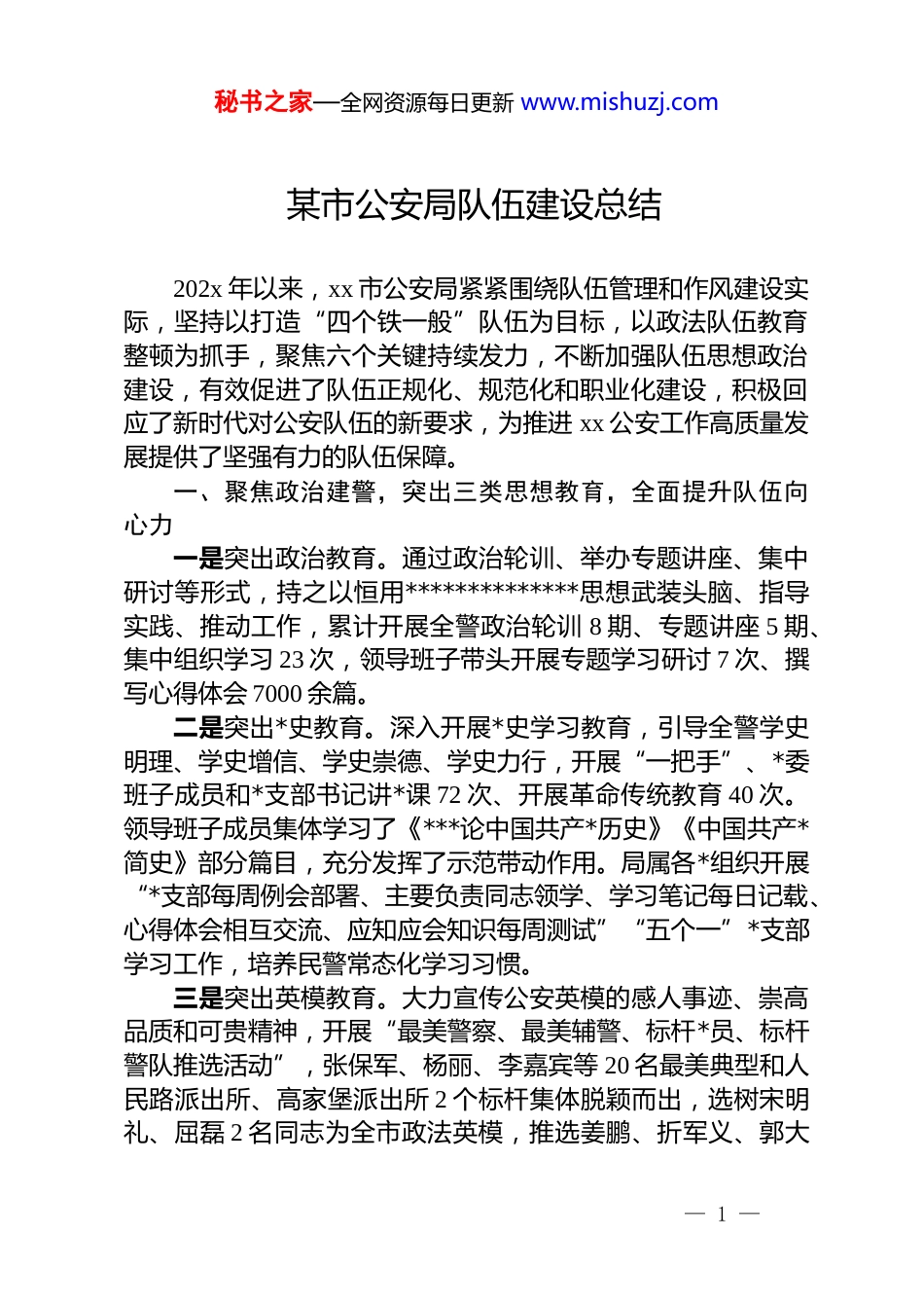 秘书之家—全网资源每日更新 www.mishuzj.com某市公安局队伍建设总结202x 年以来,xx 市公安局紧紧围绕队伍管理和作风建设实际,坚持以打造“四个铁一般”队伍为目标,以政法队伍教育整顿为抓手,聚焦六个关键持续发力,不断加强队伍思想政治建设,有效促进了队伍正规化、规范化和职业化建设,积极回应了新时代对公安队伍的新要求,为推进 xx 公安工作高质量发展提供了坚强有力的队伍保障。一、聚焦政治建警,突出三类思想教育,全面提升队伍向心力一是突出政治教育。通过政治轮训、举办专题讲座、集中研讨等形式,持之以恒用**************思想武装头脑、指导实践、推动工作,累计开展全警政治轮训 8 期、专题讲座 5 期、集中组织学习 23 次,领导班子带头开展专题学习研讨 7 次、撰写心得体会 7000 余篇。二是突出*史教育。深入开展*史学习教育,引导全警学史明理、学史增信、学史崇德、学史力行,开展“一把手”、*委班子成员和*支部书记讲*课 72 次、开展革命传统教育 40 次。领导班子成员集体学习了《***论中国共产*历史》《中国共产*简史》部分篇目,充分发挥了示范带动作用。局属各*组织开展“*支部每周例会部署、主要负责同志领学、学习笔记每日记载、心得体会相互交流、应知应会知识每周测试”“五个一”*支部学习工作,培养民警常态化学习习惯。三是突出英模教育。大力宣传公安英模的感人事迹、崇高品质和可贵精神,开展“最美警察、最美辅警、标杆*员、标杆警队推选活动”,张保军、杨丽、李嘉宾等 20 名最美典型和人民路派出所、高家堡派出所 2 个标杆集体脱颖而出,选树宋明礼、屈磊 2 名同志为全市政法英模,推选姜鹏、折军义、郭大— 1 —秘书之家—全网资源每日更新 www.mishuzj.com志等 6 名同志参与全市公安系统优秀共产*员事迹展播;组织开展英模事迹报告会和先进典型宣讲活动,通过现场报告、内网刊登、“两微”宣传和观看《平安中国之守护者》等方式,集中宣传先进典型感人故事。二、聚焦从严治警,抓牢三项管警工作,全面提升队伍凝聚力一是抓牢警示教育。通过理论学习、警示教育、参观廉政教育基地、政策宣讲等形式,不断增强全警的纪律意识、法律意识和规矩意识,切实打牢刀刃向内、自查自纠的思想根基,市纪委书记和派驻公安纪检组组长分别作廉政教育报告 2 次、召开警示教育大会 3 次、组织*规 dj 培训 3 期、参观廉政教育基地 30 次、观看《贪与腐》《第一大案》等警示教育片 4 部、组织刑侦、治安、法制、派出所等办案人员进行旁听案件庭审 1次,进一步增强了全警知敬畏、存戒惧、守底线的政治自觉、思想自觉和行动自觉。二是抓牢查纠整改。以政法队伍教育整顿为抓手,坚持问题导向,聚焦顽瘴痼疾,全覆盖开展三轮谈心谈话,全面排查2018 年以来容易滋生司法腐败、执法不公的特定范围重点案件,全部依法依规整改;严格落实一案一专班、“三包一保”制度,多起涉法涉诉信访案件稳控化解;全面排查有案不立、压案不查、有罪不究等情形案件和民辅警违规经商办企业案件,全部依法依规整改,通过集中教育整顿,全局上下从严执纪、严格守纪的观念更加牢固,持之以恒抓好作风建设的决心和力度全面增强。三是抓牢制度建设。围绕教育整顿过程中暴露出的执法司法、队伍管理、服务群众等方面的突出问题,修订完善制度规范 10 个,新出台制度规范 5 个,为推进公安工作和队伍管理可持续发展提供了坚强的制度保证。同时,广泛向“两代表一委员”、企事业单位代表及社会群众征询意见,对问题坚持立行— 2 —秘书之家—全网资源每日更新 www.mishuzj.com立改,推动公安工作时注重群众感受,为群众办实事 940 余件,集中推出 7 大类 28 项便民利民措施,一系列实实在在的长效为民举措,赢得了广大群众的欢迎和支持。三、聚焦素质强警,抓实三项教育培训,全面提升队伍战斗力今年建成了一所面积达 4800 平方米的综合性实战训练场所,为全局教育训练工作提供了有力支撑。一是抓实初始培训。以强化民辅警职业意识、职业道德和基础能力为目标,以“轮训轮值”机制为载体,围绕政治理论、常用法律法规、基础警...