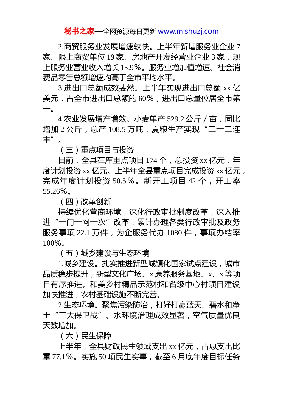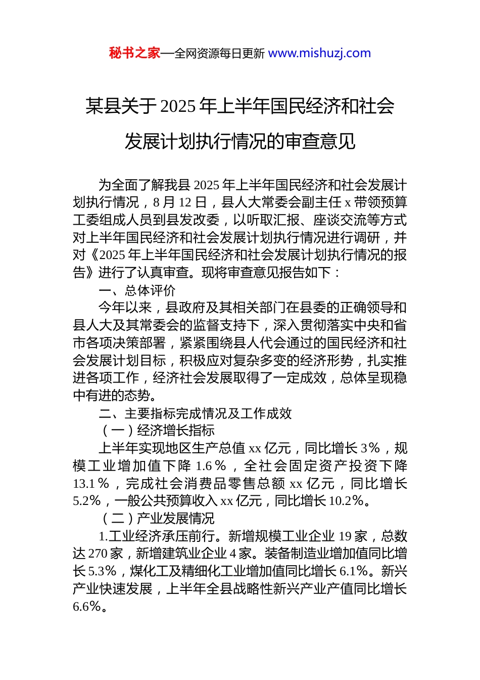 秘书之家—全网资源每日更新 www.mishuzj.com某县关于 2025 年上半年国民经济和社会发展计划执行情况的审查意见为全面了解我县 2025 年上半年国民经济和社会发展计划执行情况,8 月 12 日,县人大常委会副主任 x 带领预算工委组成人员到县发改委,以听取汇报、座谈交流等方式对上半年国民经济和社会发展计划执行情况进行调研,并对《2025 年上半年国民经济和社会发展计划执行情况的报告》进行了认真审查。现将审查意见报告如下:一、总体评价今年以来,县政府及其相关部门在县委的正确领导和县人大及其常委会的监督支持下,深入贯彻落实中央和省市各项决策部署,紧紧围绕县人代会通过的国民经济和社会发展计划目标,积极应对复杂多变的经济形势,扎实推进各项工作,经济社会发展取得了一定成效,总体呈现稳中有进的态势。二、主要指标完成情况及工作成效(一)经济增长指标上半年实现地区生产总值 xx 亿元,同比增长 3%,规模 工 业 增 加 值 下 降 1.6 % , 全 社 会 固 定 资 产 投 资 下 降13.1%,完成社会消费品零售总额 xx 亿元,同比增长5.2%,一般公共预算收入 xx 亿元,同比增长 10.2%。(二)产业发展情况1.工业经济承压前行。新增规模工业企业 19 家,总数达 270 家,新增建筑业企业 4 家。装备制造业增加值同比增长 5.3%,煤化工及精细化工业增加值同比增长 6.1%。新兴产业快速发展,上半年全县战略性新兴产业产值同比增长6.6%。秘书之家—全网资源每日更新 www.mishuzj.com2.商贸服务业发展增速较快。上半年新增服务业企业 7家、限上商贸单位 19 家、房地产开发经营业企业 3 家,规上服务业营业收入增长 13.9%。服务业增加值增速、社会消费品零售总额增速均高于全市平均水平。3.进出口总额成效斐然。上半年实现进出口总额 xx 亿美元,占全市进出口总额的 60%,进出口总量位居全市第一。4.农业发展增产增效。小麦单产 529.2 公斤/亩,同比增加 2 公斤,总产 108.5 万吨,夏粮生产实现“二十二连丰”。(三)重点项目与投资目前,全县在库重点项目 174 个,总投资 xx 亿元,年度计划投资 xx 亿元。上半年全县重点项目完成投资 xx 亿元,完成年度计划投资 50.5%。新开工项目 42 个,开工率55.26%。(四)改革创新持续优化营商环境,深化行政审批制度改革,深入推进“一门一网一次”改革,累计办理各类行政审批及政务服务事项 22.1 万件,为企服务代办 1080 件,事项办结率100%。(五)城乡建设与生态环境1.城乡建设。扎实推进新型城镇化国家试点建设,城市品质稳步提升,新型文化广场、x 康养服务基地、x、x 等项目有序推进。和美乡村精品示范村和省级中心村项目建设加快推进,农村基础设施不断完善。2.生态环境。聚焦污染防治,打好打赢蓝天、碧水和净土“三大保卫战”。水环境治理成效显著,空气质量优良天数增加。(六)民生保障上半年,全县财政民生领域支出 xx 亿元,占总支出比重 77.1%。实施 50 项民生实事,截至 6 月底年度目标任务秘书之家—全网资源每日更新 www.mishuzj.com完成率达 76.7%。三、存在的主要问题(一)部分经济指标增速缓慢。从上半年经济运行来看,部分主要经济指标增长速度较为缓慢,规模工业增加值、全社会固定资产投资等主要经济指标呈负增长,完成年初预定目标的压力较大。(二)投资增长后劲不足。大项目和新开工项目少,重点项目推进难度大,投资支撑不足,实现全年投资持续增长的目标较为困难。(三)工业经济发展乏力。工业基础薄弱,规模以上新兴产业、科技含量高的工业企业少,新增动力不足。受经济下行影响,有效需求动力不足,实体经济面临较大困难,部分企业处于停产、半停产状态,影响规上工业增速。四、意见和建议(一)强化经济运行分析,确保完成全年目标任务。认真总结和分析上半年全县经济运行中的突出问题,尤其是对各项重点指标的完成情况,要进行全面、细致的梳理和分析,针对存在的问题,制定切实可行的解决方案,进一步细化经济指标,压实工作责任,凝心聚力,真抓实干以更精准、更有效的举措补短板、强...