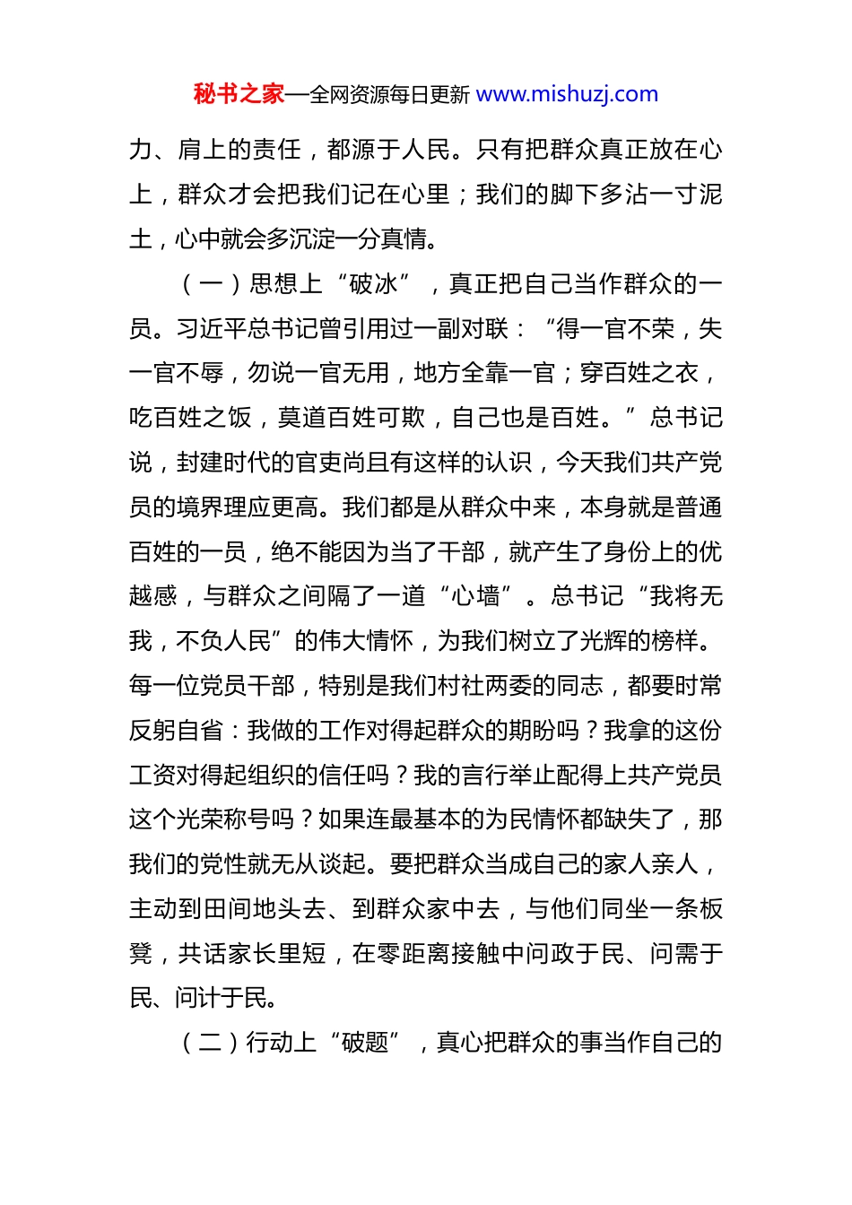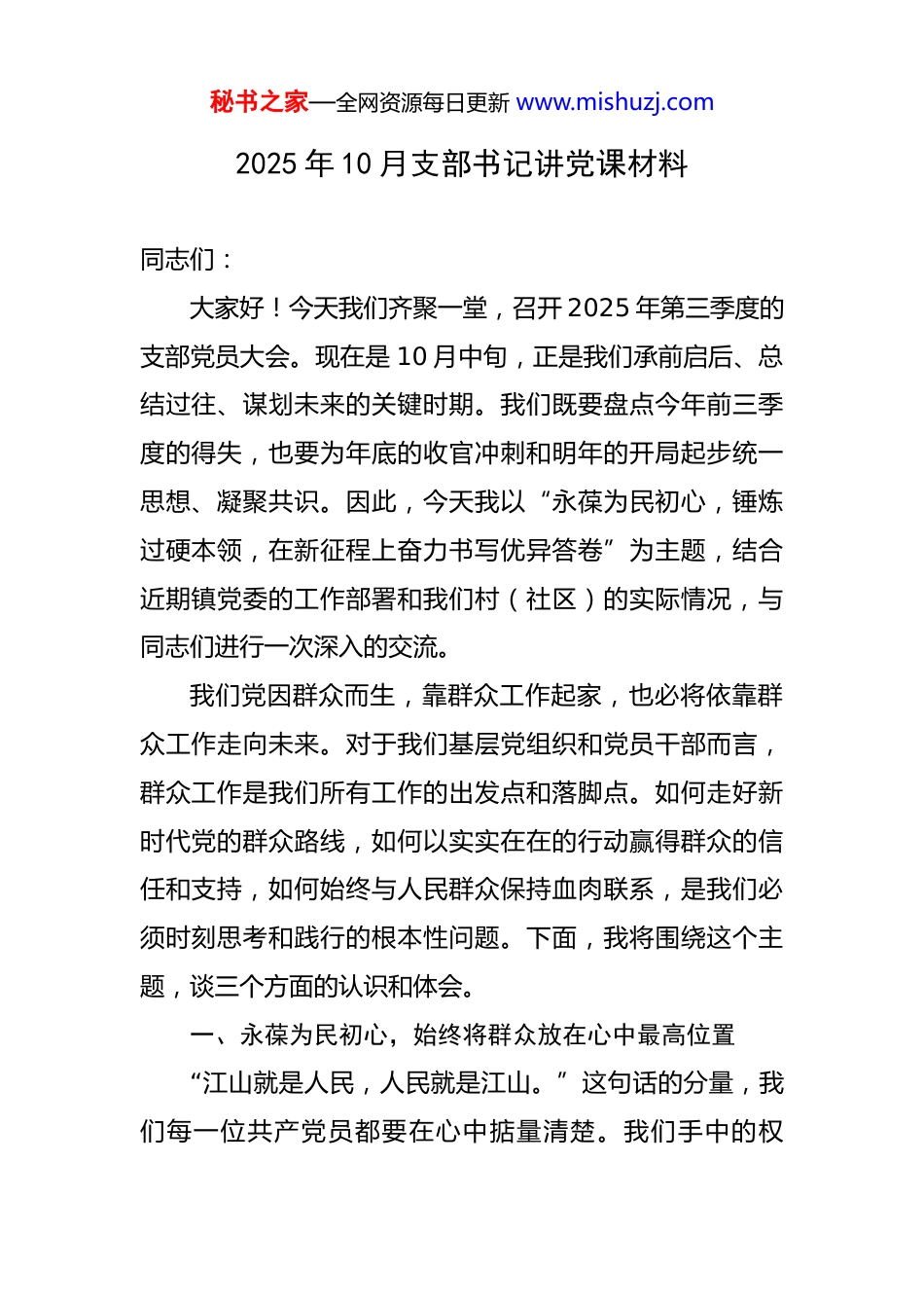 秘书之家—全网资源每日更新 www.mishuzj.com2025 年 10 月支部书记讲党课材料 同志们:大家好!今天我们齐聚一堂,召开 2025 年第三季度的支部党员大会。现在是 10 月中旬,正是我们承前启后、总结过往、谋划未来的关键时期。我们既要盘点今年前三季度的得失,也要为年底的收官冲刺和明年的开局起步统一思想、凝聚共识。因此,今天我以“永葆为民初心,锤炼过硬本领,在新征程上奋力书写优异答卷”为主题,结合近期镇党委的工作部署和我们村(社区)的实际情况,与同志们进行一次深入的交流。我们党因群众而生,靠群众工作起家,也必将依靠群众工作走向未来。对于我们基层党组织和党员干部而言,群众工作是我们所有工作的出发点和落脚点。如何走好新时代党的群众路线,如何以实实在在的行动赢得群众的信任和支持,如何始终与人民群众保持血肉联系,是我们必须时刻思考和践行的根本性问题。下面,我将围绕这个主题,谈三个方面的认识和体会。一、永葆为民初心,始终将群众放在心中最高位置“江山就是人民,人民就是江山。”这句话的分量,我们每一位共产党员都要在心中掂量清楚。我们手中的权秘书之家—全网资源每日更新 www.mishuzj.com力、肩上的责任,都源于人民。只有把群众真正放在心上,群众才会把我们记在心里;我们的脚下多沾一寸泥土,心中就会多沉淀一分真情。(一)思想上“破冰”,真正把自己当作群众的一员。习近平总书记曾引用过一副对联:“得一官不荣,失一官不辱,勿说一官无用,地方全靠一官;穿百姓之衣,吃百姓之饭,莫道百姓可欺,自己也是百姓。”总书记说,封建时代的官吏尚且有这样的认识,今天我们共产党员的境界理应更高。我们都是从群众中来,本身就是普通百姓的一员,绝不能因为当了干部,就产生了身份上的优越感,与群众之间隔了一道“心墙”。总书记“我将无我,不负人民”的伟大情怀,为我们树立了光辉的榜样。每一位党员干部,特别是我们村社两委的同志,都要时常反躬自省:我做的工作对得起群众的期盼吗?我拿的这份工资对得起组织的信任吗?我的言行举止配得上共产党员这个光荣称号吗?如果连最基本的为民情怀都缺失了,那我们的党性就无从谈起。要把群众当成自己的家人亲人,主动到田间地头去、到群众家中去,与他们同坐一条板凳,共话家长里短,在零距离接触中问政于民、问需于民、问计于民。(二)行动上“破题”,真心把群众的事当作自己的秘书之家—全网资源每日更新 www.mishuzj.com事。群众利益无小事,一枝一叶总关情。很多时候,我们觉得是举手之劳的“小事”,对群众而言可能就是天大的“大事”“难事”。想一想,如果是我们自己的事情,我们会不会想方设法、竭尽全力去办好?答案是肯定的。那么,只要我们拿出同样的态度和劲头来对待群众的事,就没有办不好的。群众对政策不了解,对办事流程不熟悉,来找我们咨询,我们多一点耐心、多一句解释、多一个指引,就能让他们少走很多弯路,我们干部的威信也就是在这样一点一滴的服务中树立起来的。对于群众反映的诉求和问题,必须建立“马上就办”的工作机制,第一时间响应、第一时间处理、第一时间反馈,坚决杜绝“等等看、拖一拖、推一推”的官僚作风。要把群众的“问题清单”变成我们的“履职清单”,把群众的“满意度”作为检验我们工作成效的唯一标准。(三)姿态上“破壁”,诚心与群众坐在一条板凳上。什么是和群众坐在一条板凳上?就是放下架子、扑下身子,以一种平等谦逊的态度和一份真挚为民的情怀融入群众。我们不必刻意“摆低姿态”,因为我们本就是群众的一员。在座的各位同志,在上任之初都曾向村民们许下过庄严的承诺。现在任期过去大半,我们可以扪心自问,有多少承诺已经兑现?有多少工作还在纸上?为什么有些秘书之家—全网资源每日更新 www.mishuzj.com工作我们觉得是好事,群众却不理解、不支持?根子很可能就在于我们没有真正和群众坐到一条板凳上,我们说的话、做的事,没有贴近他们的心窝子,久而久之,承诺变成了“空头支票”,信任就打了折扣。在信息技术高度发达的今天,我们更要警惕“指尖上”的群众工作代替“脚板下”的群众路线。微信群里的通知...