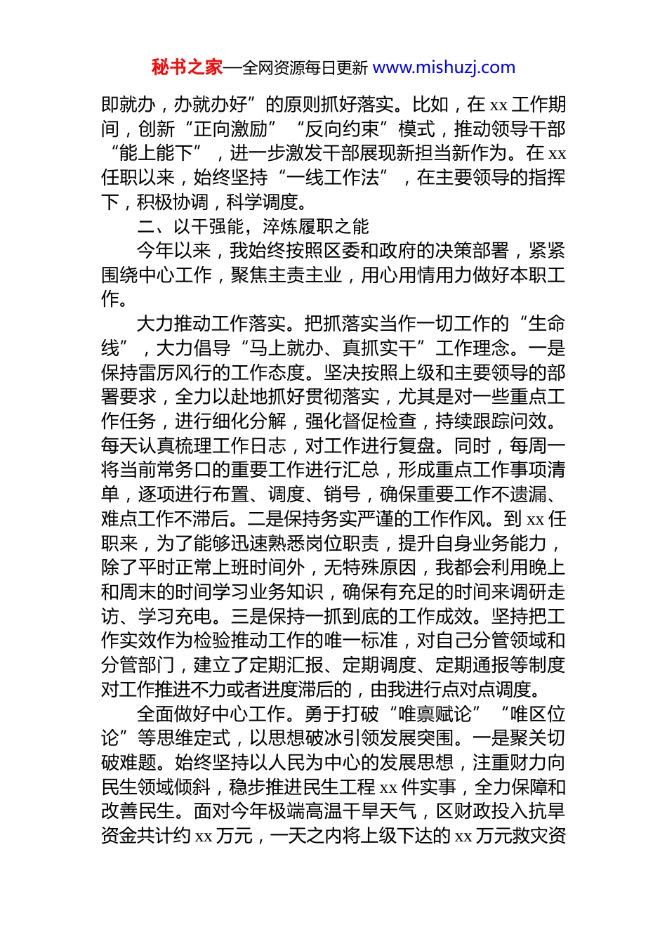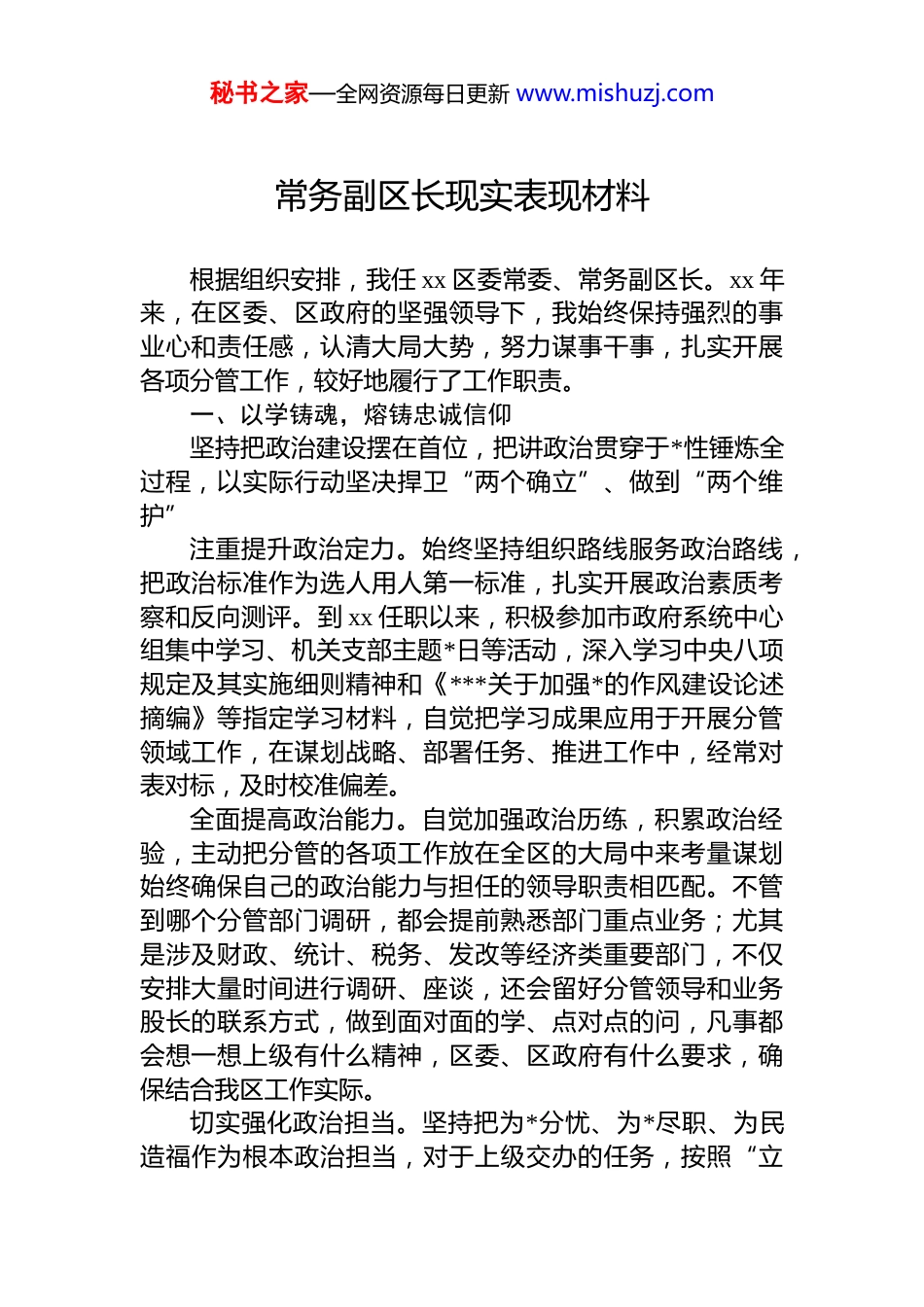 秘书之家—全网资源每日更新 www.mishuzj.com常务副区长现实表现材料根据组织安排,我任 xx 区委常委、常务副区长。xx 年来,在区委、区政府的坚强领导下,我始终保持强烈的事业心和责任感,认清大局大势,努力谋事干事,扎实开展各项分管工作,较好地履行了工作职责。一、以学铸魂,熔铸忠诚信仰坚持把政治建设摆在首位,把讲政治贯穿于*性锤炼全过程,以实际行动坚决捍卫“两个确立”、做到“两个维护”注重提升政治定力。始终坚持组织路线服务政治路线,把政治标准作为选人用人第一标准,扎实开展政治素质考察和反向测评。到 xx 任职以来,积极参加市政府系统中心组集中学习、机关支部主题*日等活动,深入学习中央八项规定及其实施细则精神和《***关于加强*的作风建设论述摘编》等指定学习材料,自觉把学习成果应用于开展分管领域工作,在谋划战略、部署任务、推进工作中,经常对表对标,及时校准偏差。全面提高政治能力。自觉加强政治历练,积累政治经验,主动把分管的各项工作放在全区的大局中来考量谋划始终确保自己的政治能力与担任的领导职责相匹配。不管到哪个分管部门调研,都会提前熟悉部门重点业务;尤其是涉及财政、统计、税务、发改等经济类重要部门,不仅安排大量时间进行调研、座谈,还会留好分管领导和业务股长的联系方式,做到面对面的学、点对点的问,凡事都会想一想上级有什么精神,区委、区政府有什么要求,确保结合我区工作实际。切实强化政治担当。坚持把为*分忧、为*尽职、为民造福作为根本政治担当,对于上级交办的任务,按照“立秘书之家—全网资源每日更新 www.mishuzj.com即就办,办就办好”的原则抓好落实。比如,在 xx 工作期间,创新“正向激励”“反向约束”模式,推动领导干部“能上能下”,进一步激发干部展现新担当新作为。在 xx任职以来,始终坚持“一线工作法”,在主要领导的指挥下,积极协调,科学调度。二、以干强能,淬炼履职之能今年以来,我始终按照区委和政府的决策部署,紧紧围绕中心工作,聚焦主责主业,用心用情用力做好本职工作。大力推动工作落实。把抓落实当作一切工作的“生命线”,大力倡导“马上就办、真抓实干”工作理念。一是保持雷厉风行的工作态度。坚决按照上级和主要领导的部署要求,全力以赴地抓好贯彻落实,尤其是对一些重点工作任务,进行细化分解,强化督促检查,持续跟踪问效。每天认真梳理工作日志,对工作进行复盘。同时,每周一将当前常务口的重要工作进行汇总,形成重点工作事项清单,逐项进行布置、调度、销号,确保重要工作不遗漏、难点工作不滞后。二是保持务实严谨的工作作风。到 xx 任职来,为了能够迅速熟悉岗位职责,提升自身业务能力,除了平时正常上班时间外,无特殊原因,我都会利用晚上和周末的时间学习业务知识,确保有充足的时间来调研走访、学习充电。三是保持一抓到底的工作成效。坚持把工作实效作为检验推动工作的唯一标准,对自己分管领域和分管部门,建立了定期汇报、定期调度、定期通报等制度对工作推进不力或者进度滞后的,由我进行点对点调度。全面做好中心工作。勇于打破“唯禀赋论”“唯区位论”等思维定式,以思想破冰引领发展突围。一是聚关切破难题。始终坚持以人民为中心的发展思想,注重财力向民生领域倾斜,稳步推进民生工程 xx 件实事,全力保障和改善民生。面对今年极端高温干旱天气,区财政投入抗旱资金共计约 xx 万元,一天之内将上级下达的 xx 万元救灾资秘书之家—全网资源每日更新 www.mishuzj.com金分解到受灾农户手上,最大限度保障粮食生产安全。二是挑重担,攻难关。面对当前经济下行压力,加之惠企政策兑现、常态化 xx 等刚性支出需求,我每月组织财政、税务、金融工作服务中心等部门进行协商,想方设法开源节流,牢牢兜住“三保”底线,全力稳住财政金融大盘。三是抓改革,谋创新。本人始终坚持把改革创新作为第一动力,努力以创新促进工作提质增效。步提升了青年干部的综合素质和个人能力。聚焦实现创新突破。始终牢记***视察 xx 时提出的工作要求,全面践行新时代*的组织路线,做好做优基层*组织建设、干部队伍建设和人才强县“三篇文章...