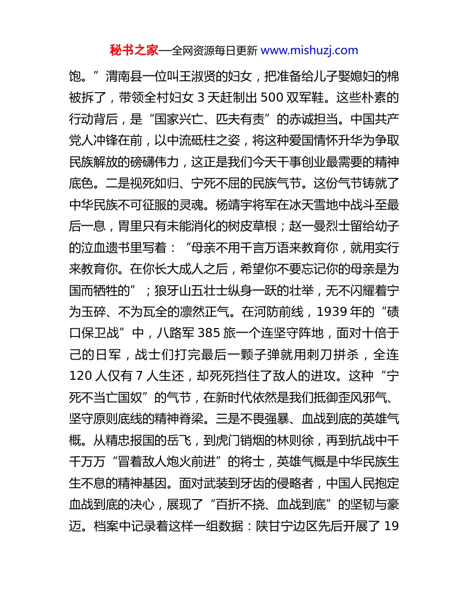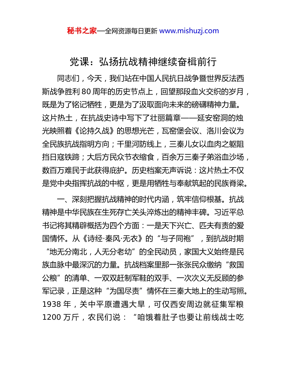 秘书之家—全网资源每日更新 www.mishuzj.com党课:弘扬抗战精神继续奋楫前行同志们,今天,我们站在中国人民抗日战争暨世界反法西斯战争胜利 80 周年的历史节点上,回望那段血火交织的岁月,既是为了铭记牺牲,更是为了汲取面向未来的磅礴精神力量。这片热土,在抗战史诗中写下了壮丽篇章——延安窑洞的烛光映照着《论持久战》的思想光芒,瓦窑堡会议、洛川会议为全民族抗战指明方向;千里河防线上,三秦儿女以血肉之躯阻挡日寇铁蹄;大后方民众节衣缩食,百余万三秦子弟浴血沙场,数百万难民于此获得庇护。历史档案无声诉说:这片热土不仅是党中央指挥抗战的中枢,更是用牺牲与奉献筑起的民族脊梁。一、深刻把握抗战精神的时代内涵,筑牢信仰根基。抗战精神是中华民族在生死存亡关头淬炼出的精神丰碑。习近平总书记将其精辟概括为四个方面:一是天下兴亡、匹夫有责的爱国情怀。从《诗经·秦风·无衣》的“与子同袍”,到抗战时期“地无分南北,人无分老幼”的全民动员,家国大义始终是民族血脉中最深沉的力量。抗战档案里那一张张民众缴纳“救国公粮”的清单、一双双赶制军鞋的双手、一次次义无反顾的参军记录,正是这种“为国尽责”情怀在三秦大地上的生动写照。1938 年,关中平原遭遇大旱,可仅西安周边就征集军粮1200 万斤,农民们说:“咱饿着肚子也要让前线战士吃秘书之家—全网资源每日更新 www.mishuzj.com饱。”渭南县一位叫王淑贤的妇女,把准备给儿子娶媳妇的棉被拆了,带领全村妇女 3 天赶制出 500 双军鞋。这些朴素的行动背后,是“国家兴亡、匹夫有责”的赤诚担当。中国共产党人冲锋在前,以中流砥柱之姿,将这种爱国情怀升华为争取民族解放的磅礴伟力,这正是我们今天干事创业最需要的精神底色。二是视死如归、宁死不屈的民族气节。这份气节铸就了中华民族不可征服的灵魂。杨靖宇将军在冰天雪地中战斗至最后一息,胃里只有未能消化的树皮草根;赵一曼烈士留给幼子的泣血遗书里写着:“母亲不用千言万语来教育你,就用实行来教育你。在你长大成人之后,希望你不要忘记你的母亲是为国而牺牲的”;狼牙山五壮士纵身一跃的壮举,无不闪耀着宁为玉碎、不为瓦全的凛然正气。在河防前线,1939 年的“碛口保卫战”中,八路军 385 旅一个连坚守阵地,面对十倍于己的日军,战士们打完最后一颗子弹就用刺刀拼杀,全连120 人仅有 7 人生还,却死死挡住了敌人的进攻。这种“宁死不当亡国奴”的气节,在新时代依然是我们抵御歪风邪气、坚守原则底线的精神脊梁。三是不畏强暴、血战到底的英雄气概。从精忠报国的岳飞,到虎门销烟的林则徐,再到抗战中千千万万“冒着敌人炮火前进”的将士,英雄气概是中华民族生生不息的精神基因。面对武装到牙齿的侵略者,中国人民抱定血战到底的决心,展现了“百折不挠、血战到底”的坚韧与豪迈。档案中记录着这样一组数据:陕甘宁边区先后开展了 19秘书之家—全网资源每日更新 www.mishuzj.com次大规模扩兵运动,每次都超额完成任务;在“百团大战”中,籍战士占参战兵力的 23%,伤亡率却高达 31%,因为他们总是冲锋在最前面。这种敢于亮剑、勇于牺牲的气概,正是我们今天攻克改革难关、突破发展瓶颈最需要的精神利刃。四是百折不挠、坚忍不拔的必胜信念。“故天将降大任于是人也,必先苦其心志”。正是这份“正义必胜、人民必胜”的坚定信念,支撑中国军民在 14 年艰苦卓绝的斗争中克服武器劣势、物资匮乏与环境险恶,最终赢得胜利。延安窑洞的灯光穿透漫漫长夜,象征着黑暗中永不熄灭的希望之光。1941 年,国民党对陕甘宁边区实行严密封锁,“几乎没有衣穿,没有油吃,没有纸,没有菜,战士没有鞋袜,工作人员在冬天没有被盖”。可就是在这样的困境中,边区军民开展大生产运动,“自己动手、丰衣足食”,不仅渡过了难关,更创造了经济奇迹。这种在绝望中寻找希望、在困境中开辟道路的信念,是我们应对风险挑战、实现宏伟目标的精神灯塔。二、深刻领会抗战精神的时代价值,汲取前行伟力。抗战精神绝非尘封的历史记忆,其蕴含的真理力量在新时代愈发彰显,是实现民族复兴不可或缺的精神支柱。一是必须毫不动摇坚持党的领...