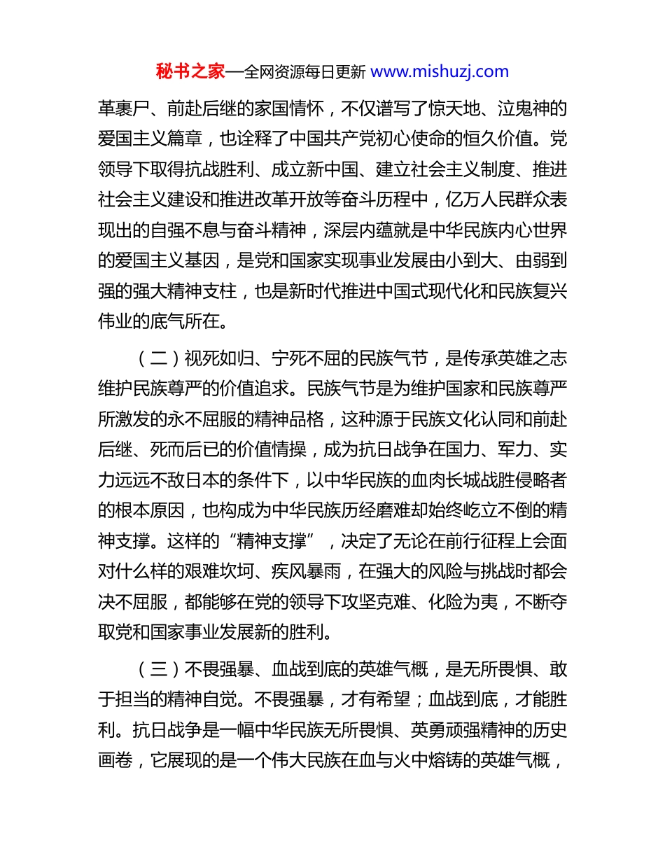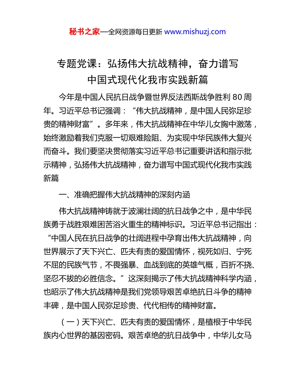 秘书之家—全网资源每日更新 www.mishuzj.com专题党课:弘扬伟大抗战精神,奋力谱写中国式现代化我市实践新篇今年是中国人民抗日战争暨世界反法西斯战争胜利 80 周年。习近平总书记强调:“伟大抗战精神,是中国人民弥足珍贵的精神财富”。多年来,伟大抗战精神在中华儿女胸中激荡,始终激励着我们克服一切艰难险阻、为实现中华民族伟大复兴而奋斗。我们要坚决贯彻落实习近平总书记重要讲话和指示批示精神,弘扬伟大抗战精神,奋力谱写中国式现代化我市实践新篇一、准确把握伟大抗战精神的深刻内涵伟大抗战精神铸就于波澜壮阔的抗日战争之中,是中华民族勇于战胜艰难困苦浴火重生的精神标识。习近平总书记指出:“中国人民在抗日战争的壮阔进程中孕育出伟大抗战精神,向世界展示了天下兴亡、匹夫有责的爱国情怀,视死如归、宁死不屈的民族气节,不畏强暴、血战到底的英雄气概,百折不挠、坚忍不拔的必胜信念。”这深刻揭示了伟大抗战精神科学内涵,也昭示了伟大抗战精神是我们党领导艰苦卓绝抗日斗争的精神丰碑,是中国人民弥足珍贵、代代相传的精神财富。(一)天下兴亡、匹夫有责的爱国情怀,是植根于中华民族内心世界的基因密码。艰苦卓绝的抗日战争中,中华儿女马秘书之家—全网资源每日更新 www.mishuzj.com革裹尸、前赴后继的家国情怀,不仅谱写了惊天地、泣鬼神的爱国主义篇章,也诠释了中国共产党初心使命的恒久价值。党领导下取得抗战胜利、成立新中国、建立社会主义制度、推进社会主义建设和推进改革开放等奋斗历程中,亿万人民群众表现出的自强不息与奋斗精神,深层内蕴就是中华民族内心世界的爱国主义基因,是党和国家实现事业发展由小到大、由弱到强的强大精神支柱,也是新时代推进中国式现代化和民族复兴伟业的底气所在。(二)视死如归、宁死不屈的民族气节,是传承英雄之志维护民族尊严的价值追求。民族气节是为维护国家和民族尊严所激发的永不屈服的精神品格,这种源于民族文化认同和前赴后继、死而后已的价值情操,成为抗日战争在国力、军力、实力远远不敌日本的条件下,以中华民族的血肉长城战胜侵略者的根本原因,也构成为中华民族历经磨难却始终屹立不倒的精神支撑。这样的“精神支撑”,决定了无论在前行征程上会面对什么样的艰难坎坷、疾风暴雨,在强大的风险与挑战时都会决不屈服,都能够在党的领导下攻坚克难、化险为夷,不断夺取党和国家事业发展新的胜利。(三)不畏强暴、血战到底的英雄气概,是无所畏惧、敢于担当的精神自觉。不畏强暴,才有希望;血战到底,才能胜利。抗日战争是一幅中华民族无所畏惧、英勇顽强精神的历史画卷,它展现的是一个伟大民族在血与火中熔铸的英雄气概,秘书之家—全网资源每日更新 www.mishuzj.com奏响的是亿万国人在党的领导下同仇敌忾,无数将士为抗击外敌慷慨赴死的英雄赞歌。历史的发展与实践的发展证明,进入新时代,弘扬伟大抗战精神,就能使我们越是面对复杂局面,越能够保持战略定力;越是遭遇坎坷行程,越能够坚定必胜信心,勇敢面对和克服所面临的困难和挑战。(四)百折不挠、坚忍不拔的必胜信念,是中华儿女为实现国家繁荣富强不懈奋斗的内在动力。伟大抗战精神是中华民族在面对磨难坎坷时坚贞不屈、愈挫愈奋的魂魄写实,抗日战争中党带领广大人民群众以弱胜强、反败为胜,取得抗日战争最后胜利的辉煌历史,昭示的既是一个民族永不屈膝、抗争到底的坚定决心,也是中国共产党人以伟大历史主动精神,百折不挠为国家与民族的前途命运而奋斗的坚强意志。在推进民族复兴的进程中,坚毅顽强、永不言败和自立自强的精神动力,正是中华儿女勠力同心、共同奋斗实现中华民族由站起来、富起来向强起来转变的必然逻辑与结论。二、深刻认识伟大抗战精神的时代价值抗日战争是近代以来中国人民反抗外敌入侵持续时间最长规模最大、牺牲最多的民族解放斗争,也是第一次取得完全胜利的民族解放斗争。抗战历史中形成的伟大抗战精神,已经为中国共产党领导的革命、建设和改革开放实践证明,它始终是激励中国人民应对各种挑战、抵御多重风险、争取更大胜利的秘书之家—全网资源每日更新 www.mishuzj.com精神动力。进入新时代...