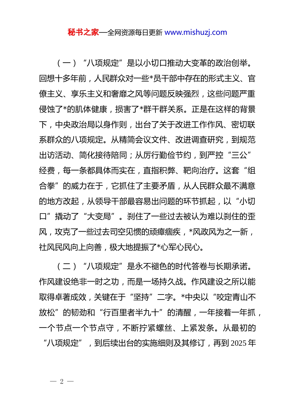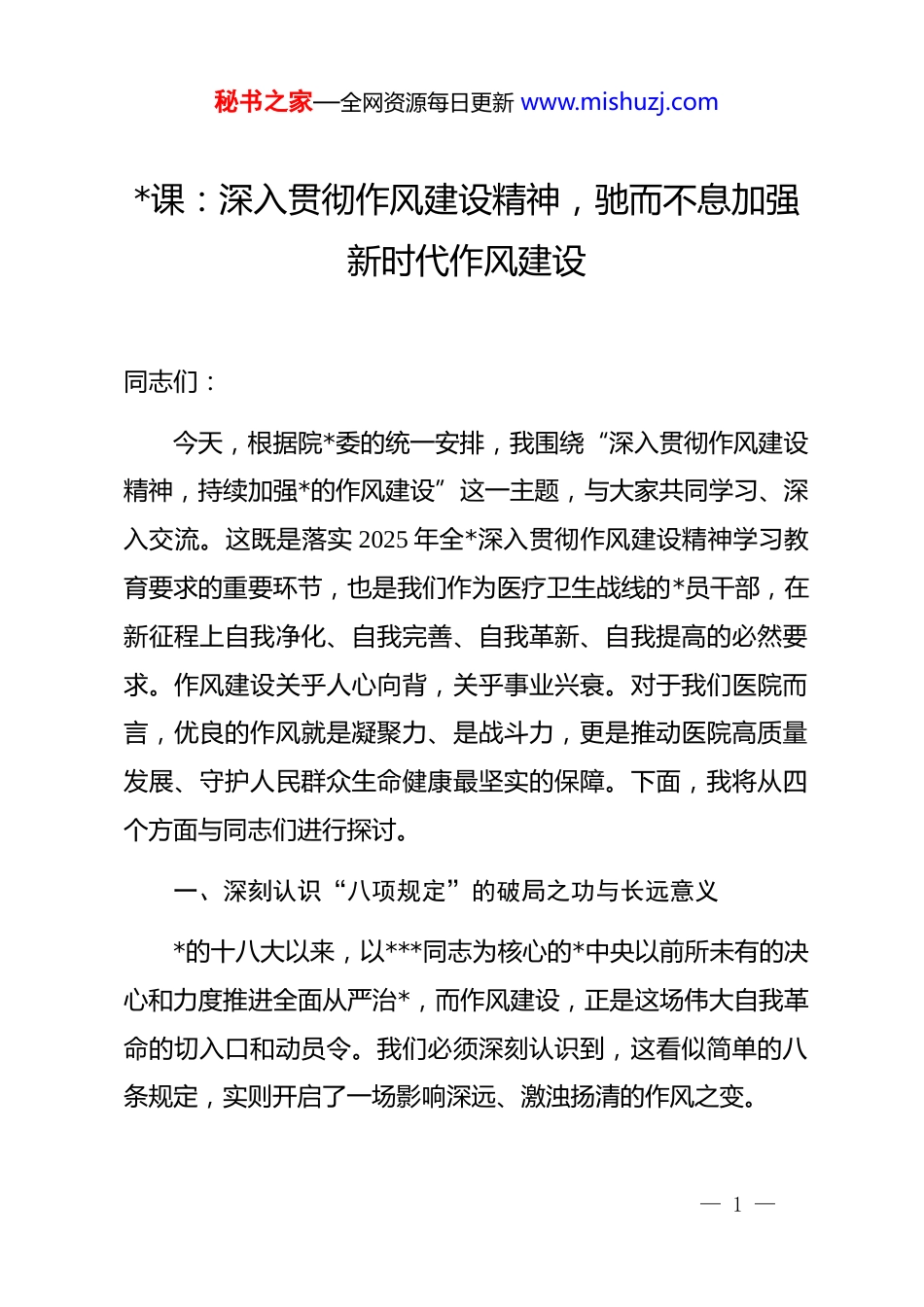 秘书之家—全网资源每日更新 www.mishuzj.com*课:深入贯彻作风建设精神,驰而不息加强新时代作风建设同志们:今天,根据院*委的统一安排,我围绕“深入贯彻作风建设精神,持续加强*的作风建设”这一主题,与大家共同学习、深入交流。这既是落实 2025 年全*深入贯彻作风建设精神学习教育要求的重要环节,也是我们作为医疗卫生战线的*员干部,在新征程上自我净化、自我完善、自我革新、自我提高的必然要求。作风建设关乎人心向背,关乎事业兴衰。对于我们医院而言,优良的作风就是凝聚力、是战斗力,更是推动医院高质量发展、守护人民群众生命健康最坚实的保障。下面,我将从四个方面与同志们进行探讨。一、深刻认识“八项规定”的破局之功与长远意义*的十八大以来,以***同志为核心的*中央以前所未有的决心和力度推进全面从严治*,而作风建设,正是这场伟大自我革命的切入口和动员令。我们必须深刻认识到,这看似简单的八条规定,实则开启了一场影响深远、激浊扬清的作风之变。— 1 —秘书之家—全网资源每日更新 www.mishuzj.com(一)“八项规定”是以小切口推动大变革的政治创举。回想十多年前,人民群众对一些*员干部中存在的形式主义、官僚主义、享乐主义和奢靡之风等问题反映强烈,这些问题严重侵蚀了*的肌体健康,损害了*群干群关系。正是在这样的背景下,中央政治局以身作则,出台了关于改进工作作风、密切联系群众的八项规定。从精简会议文件、改进调查研究,到规范出访活动、简化接待陪同;从厉行勤俭节约,到严控“三公”经费,每一条都具体而实在,直指积弊、靶向治疗。这套“组合拳”的威力在于,它抓住了主要矛盾,从人民群众最不满意的地方改起,从领导干部最容易出问题的环节抓起,以“小切口”撬动了“大变局”。刹住了一些过去被认为难以刹住的歪风,攻克了一些过去司空见惯的顽瘴痼疾,*风政风为之一新,社风民风向上向善,极大地提振了*心军心民心。(二)“八项规定”是永不褪色的时代答卷与长期承诺。作风建设绝非一时之功,而是一场持久战。作风建设之所以能取得卓著成效,关键在于“坚持”二字。*中央以“咬定青山不放松”的韧劲和“行百里者半九十”的清醒,一年接着一年抓,一个节点一个节点守,不断拧紧螺丝、上紧发条。从最初的“八项规定”,到后续出台的实施细则及其修订,再到 2025 年— 2 —秘书之家—全网资源每日更新 www.mishuzj.com全国两会后启动、并计划于 7 月底前基本结束的新一轮学习教育,无不彰显了*中央将作风建设进行到底的坚定决心。这充分说明,作风建设不是五年、十年的短期安排,而是我们*在新时代加强自身建设的“金色名片”和对人民的庄严承诺。我们必须清醒地认识到,作风问题具有顽固性和反复性,稍有松懈就可能反弹回潮。因此,落实作风建设精神,必须常抓不懈、久久为功,将其作为一项永恒的课题,内化为每个*员干部的思想自觉和行动自觉。(三)“八项规定”是推动我们医疗卫生事业高质量发展的根本保障。对于我们医院而言,贯彻落实作风建设精神具有尤为重要的现实意义。医院是服务群众的第一线,医务人员的作风直接关系到患者的就医体验和生命健康。如果我们的作风漂浮,调查研究走过场,就无法真正了解临床一线的痛点、患者就医的难点;如果我们沾染了官僚习气,对患者的诉求漠不关心、推诿扯皮,就会寒了群众的心;如果我们追求享乐、贪图奢靡,就可能在药品采购、设备引进、工程建设中滋生腐败,最终损害的是医院的利益和患者的权益。因此,我们必须把作风建设精神不折不扣地落实到医院管理、临床诊疗、后勤保障等每一个环节,以优良的作风凝聚起全院职工干事创业的磅礴— 3 —秘书之家—全网资源每日更新 www.mishuzj.com力量,为人民群众提供更加优质、高效、温暖的医疗服务。二、精准把握“四风”问题在医疗领域的新动向、新表现经过持续整治,“四风”问题在面上得到有效遏制,但树倒根存,其表现形式也出现了一些新动向、新变种,更加隐蔽、更具迷惑性。我们必须擦亮眼睛,保持高度警惕,特别是要结合医疗行业的特点,精准识别和靶向纠治。(一)形式主义方面的新变种。当前,医疗领域的形式主...
