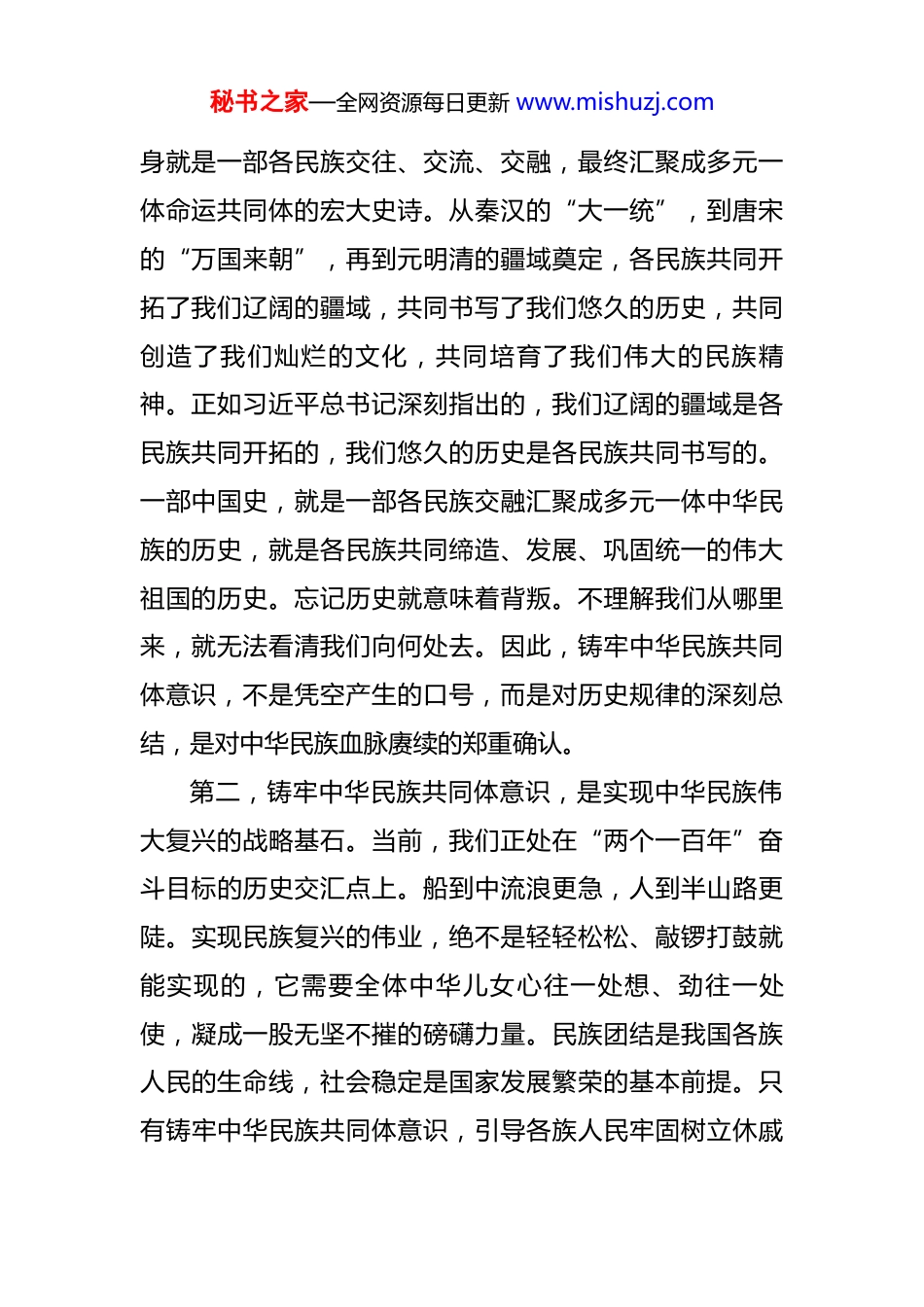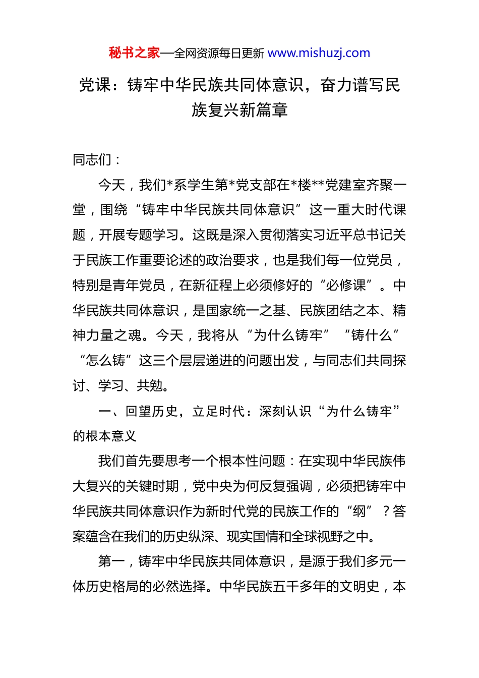 秘书之家—全网资源每日更新 www.mishuzj.com党课:铸牢中华民族共同体意识,奋力谱写民族复兴新篇章 同志们:今天,我们*系学生第*党支部在*楼**党建室齐聚一堂,围绕“铸牢中华民族共同体意识”这一重大时代课题,开展专题学习。这既是深入贯彻落实习近平总书记关于民族工作重要论述的政治要求,也是我们每一位党员,特别是青年党员,在新征程上必须修好的“必修课”。中华民族共同体意识,是国家统一之基、民族团结之本、精神力量之魂。今天,我将从“为什么铸牢”“铸什么”“怎么铸”这三个层层递进的问题出发,与同志们共同探讨、学习、共勉。一、回望历史,立足时代:深刻认识“为什么铸牢”的根本意义我们首先要思考一个根本性问题:在实现中华民族伟大复兴的关键时期,党中央为何反复强调,必须把铸牢中华民族共同体意识作为新时代党的民族工作的“纲”?答案蕴含在我们的历史纵深、现实国情和全球视野之中。第一,铸牢中华民族共同体意识,是源于我们多元一体历史格局的必然选择。中华民族五千多年的文明史,本秘书之家—全网资源每日更新 www.mishuzj.com身就是一部各民族交往、交流、交融,最终汇聚成多元一体命运共同体的宏大史诗。从秦汉的“大一统”,到唐宋的“万国来朝”,再到元明清的疆域奠定,各民族共同开拓了我们辽阔的疆域,共同书写了我们悠久的历史,共同创造了我们灿烂的文化,共同培育了我们伟大的民族精神。正如习近平总书记深刻指出的,我们辽阔的疆域是各民族共同开拓的,我们悠久的历史是各民族共同书写的。一部中国史,就是一部各民族交融汇聚成多元一体中华民族的历史,就是各民族共同缔造、发展、巩固统一的伟大祖国的历史。忘记历史就意味着背叛。不理解我们从哪里来,就无法看清我们向何处去。因此,铸牢中华民族共同体意识,不是凭空产生的口号,而是对历史规律的深刻总结,是对中华民族血脉赓续的郑重确认。第二,铸牢中华民族共同体意识,是实现中华民族伟大复兴的战略基石。当前,我们正处在“两个一百年”奋斗目标的历史交汇点上。船到中流浪更急,人到半山路更陡。实现民族复兴的伟业,绝不是轻轻松松、敲锣打鼓就能实现的,它需要全体中华儿女心往一处想、劲往一处使,凝成一股无坚不摧的磅礴力量。民族团结是我国各族人民的生命线,社会稳定是国家发展繁荣的基本前提。只有铸牢中华民族共同体意识,引导各族人民牢固树立休戚秘书之家—全网资源每日更新 www.mishuzj.com与共、荣辱与共、生死与共、命运与共的共同体理念,才能从根本上消除隔阂、凝聚共识,有效抵御和防范一切分裂破坏活动,确保国家长治久安、社会和谐稳定,为现代化建设营造坚如磐石的社会环境。党的民族工作取得的历史性成就雄辩地证明,民族地区同全国一道打赢脱贫攻坚战、全面建成小康社会,靠的正是这种强大的凝聚力和向心力。第三,铸牢中华民族共同体意识,是应对当今世界百年未有之大变局的现实需要。我们放眼全球,世界并不太平。一些西方敌对势力亡我之心不死,惯于打“民族牌”“宗教牌”,企图利用民族问题、宗教问题西化、分化中国。他们炮制谎言、颠倒黑白,挑拨民族关系,妄图在我国制造混乱,阻碍中华民族伟大复兴的进程。同时,历史虚无主义、狭隘民族主义等错误思潮也时有沉渣泛起。面对这些风险挑战,我们必须保持高度的战略清醒。铸牢中华民族共同体意识,就是要构建起一道坚不可摧的思想长城,让各族人民在思想上、政治上、情感上、文化上紧密团结在一起,使任何离间、破坏民族团结的图谋都无机可乘,确保我们的事业在任何风浪考验面前都稳如泰山。二、明确方向,把握精髓:准确理解“铸什么”的核心要义秘书之家—全网资源每日更新 www.mishuzj.com明确了“为什么铸牢”的重大意义,我们就要进一步弄清楚“铸什么”的核心内涵。铸牢中华民族共同体意识,不是要消灭各民族的个性和差异,而是要在尊重差异、包容多样性的基础上,不断增进各民族的共同性,巩固和发展平等团结互助和谐的社会主义民族关系。具体而言,我们要牢牢把握以下几个核心要义。一是铸牢对伟大祖国的深刻认同。这是中华民族共同体意识的根基所在。要引导各族人民深刻认...