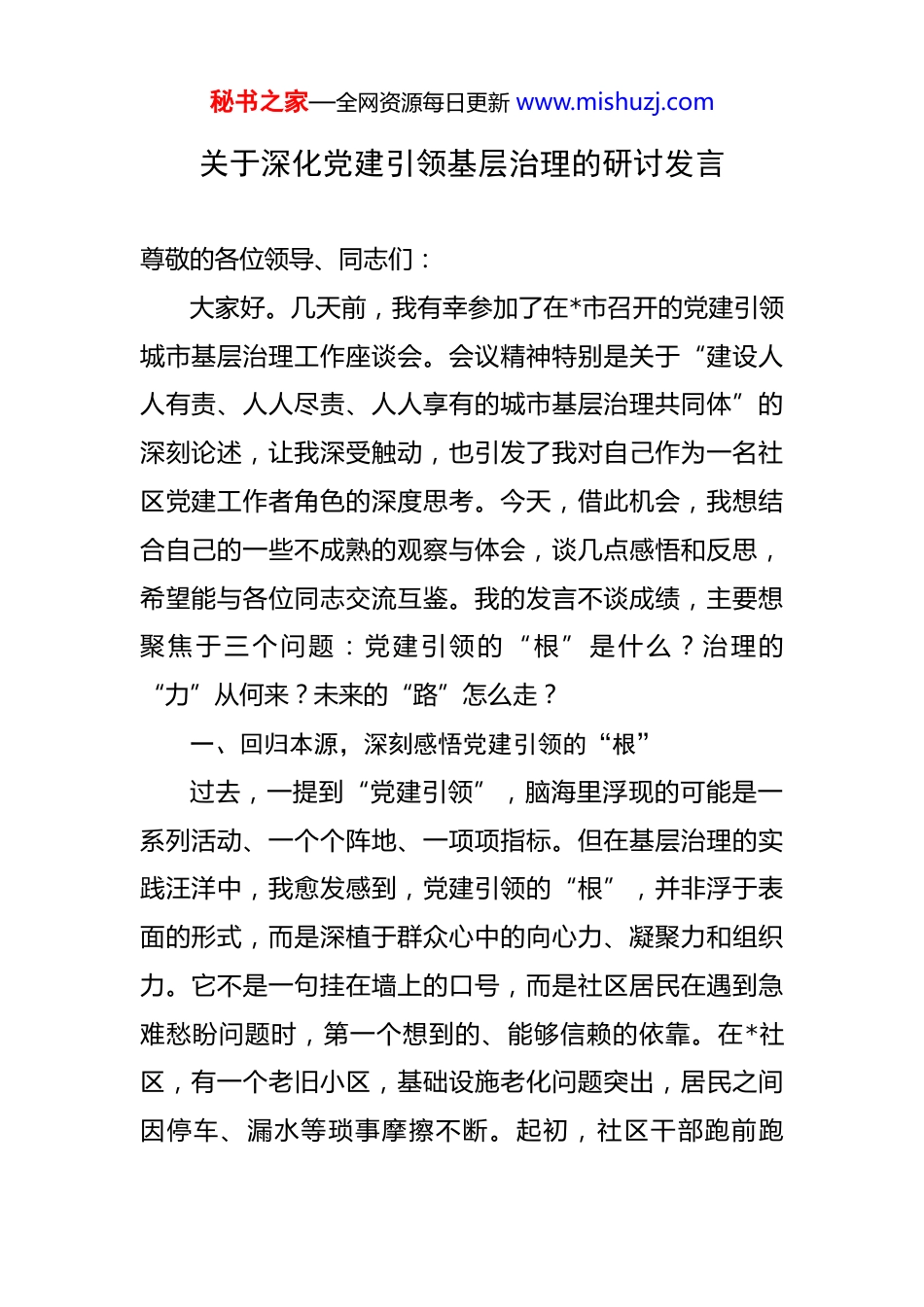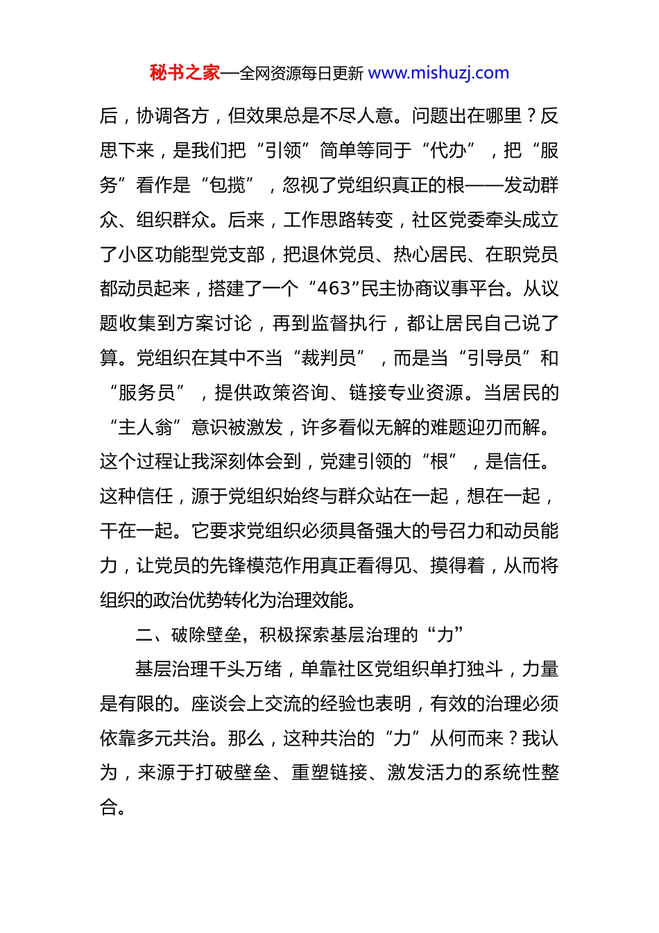 秘书之家—全网资源每日更新 www.mishuzj.com关于深化党建引领基层治理的研讨发言 尊敬的各位领导、同志们:大家好。几天前,我有幸参加了在*市召开的党建引领城市基层治理工作座谈会。会议精神特别是关于“建设人人有责、人人尽责、人人享有的城市基层治理共同体”的深刻论述,让我深受触动,也引发了我对自己作为一名社区党建工作者角色的深度思考。今天,借此机会,我想结合自己的一些不成熟的观察与体会,谈几点感悟和反思,希望能与各位同志交流互鉴。我的发言不谈成绩,主要想聚焦于三个问题:党建引领的“根”是什么?治理的“力”从何来?未来的“路”怎么走?一、回归本源,深刻感悟党建引领的“根”过去,一提到“党建引领”,脑海里浮现的可能是一系列活动、一个个阵地、一项项指标。但在基层治理的实践汪洋中,我愈发感到,党建引领的“根”,并非浮于表面的形式,而是深植于群众心中的向心力、凝聚力和组织力。它不是一句挂在墙上的口号,而是社区居民在遇到急难愁盼问题时,第一个想到的、能够信赖的依靠。在*社区,有一个老旧小区,基础设施老化问题突出,居民之间因停车、漏水等琐事摩擦不断。起初,社区干部跑前跑秘书之家—全网资源每日更新 www.mishuzj.com后,协调各方,但效果总是不尽人意。问题出在哪里?反思下来,是我们把“引领”简单等同于“代办”,把“服务”看作是“包揽”,忽视了党组织真正的根——发动群众、组织群众。后来,工作思路转变,社区党委牵头成立了小区功能型党支部,把退休党员、热心居民、在职党员都动员起来,搭建了一个“463”民主协商议事平台。从议题收集到方案讨论,再到监督执行,都让居民自己说了算。党组织在其中不当“裁判员”,而是当“引导员”和“服务员”,提供政策咨询、链接专业资源。当居民的“主人翁”意识被激发,许多看似无解的难题迎刃而解。这个过程让我深刻体会到,党建引领的“根”,是信任。这种信任,源于党组织始终与群众站在一起,想在一起,干在一起。它要求党组织必须具备强大的号召力和动员能力,让党员的先锋模范作用真正看得见、摸得着,从而将组织的政治优势转化为治理效能。二、破除壁垒,积极探索基层治理的“力”基层治理千头万绪,单靠社区党组织单打独斗,力量是有限的。座谈会上交流的经验也表明,有效的治理必须依靠多元共治。那么,这种共治的“力”从何而来?我认为,来源于打破壁垒、重塑链接、激发活力的系统性整合。秘书之家—全网资源每日更新 www.mishuzj.com首先是组织链接之力。传统社区治理中,社区党组织、业委会、物业公司、驻区单位常常是“各扫门前雪”,甚至相互掣肘。*市等地推行的“大党委”制度,为破解这个难题提供了很好的思路。通过组织共建、资源共享、活动共联,将辖区内不同隶属关系的党组织串联起来,形成一个紧密的“红色联盟”。这种模式的核心,是通过党建这根红线,将原本平行的主体,变为同向而行的伙伴。例如,可以探索建立共建责任清单,让驻区单位的资源,如场地、人才、信息,能够有效下沉到社区,为居民提供更丰富的服务。其次是社会协同之力。社区是各类社会组织成长的沃土。党组织需要扮演好“伯乐”和“孵化器”的角色,积极培育和引导社会组织、志愿者队伍、居民自组织等力量有序参与治理。我所在的社区曾尝试通过购买服务的方式引入专业社工机构,开展针对独居老人的关爱服务。实践证明,专业的人做专业的事,不仅提升了服务的精细化水平,也弥补了社区行政力量的不足。未来,如何进一步健全机制,让这些社会力量从“补充”变为“主力”,是需要持续探索的课题。再次是数字赋能之力。随着城市治理现代化水平的提升,数字技术为基层治理插上了翅膀。一些地方探索的秘书之家—全网资源每日更新 www.mishuzj.com“党建+网格”治理模式,通过线上平台实现了信息的快速流转和问题的精准处置。然而,当前数字赋能仍存在一些短板,比如平台功能单一、数据壁垒未完全打通、部分老年居民“数字鸿沟”等问题。如何让技术更好地为人服务,而不是让居民被技术束缚,需要我们在应用中不断优化迭代。例如,开发更简化、更人性化的操作界面,同时保留线下渠...