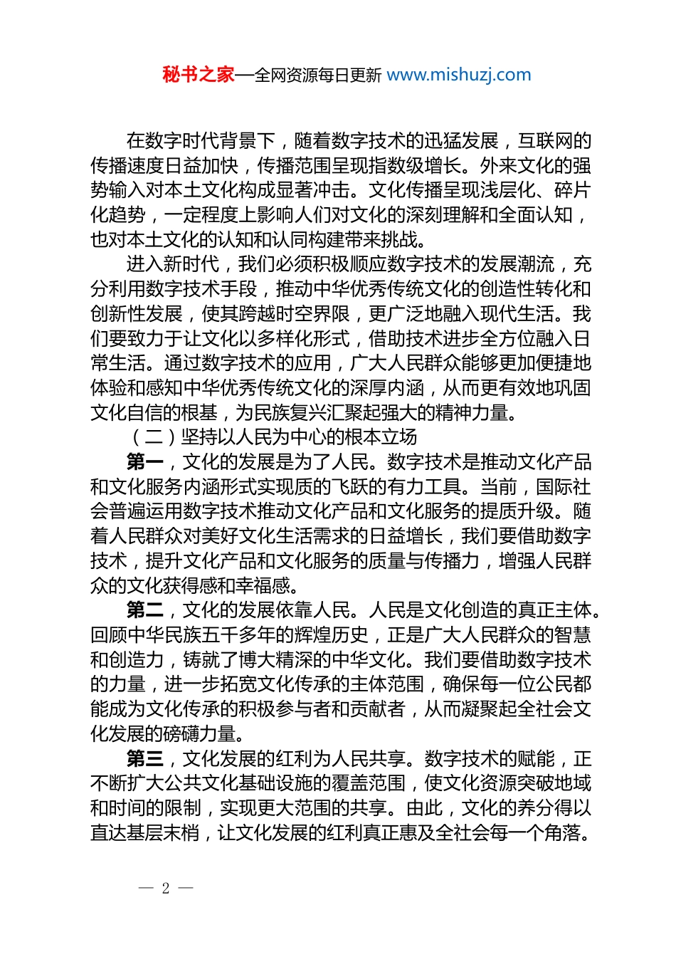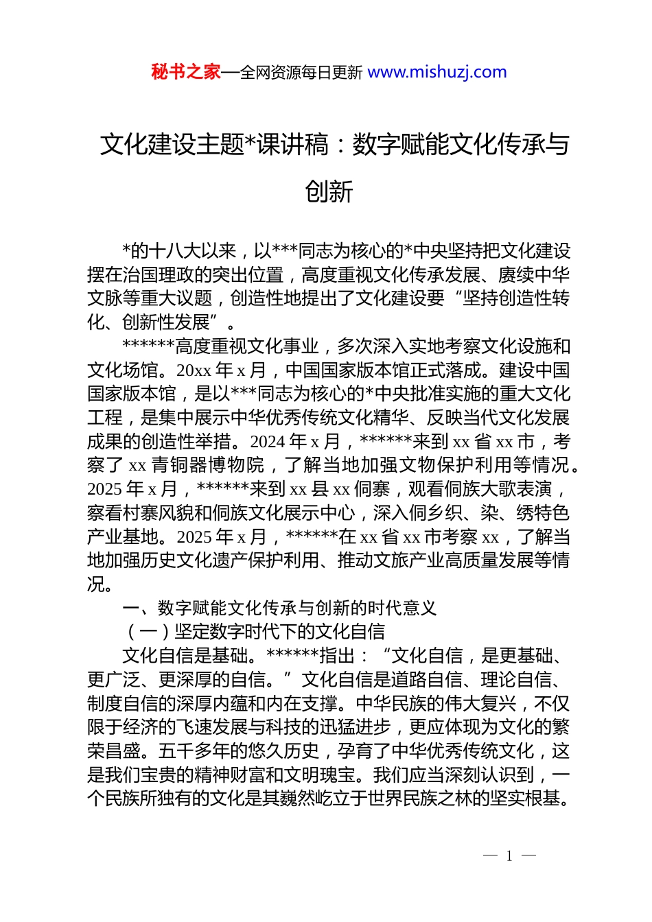 秘书之家—全网资源每日更新 www.mishuzj.com文化建设主题*课讲稿:数字赋能文化传承与创新*的十八大以来,以***同志为核心的*中央坚持把文化建设摆在治国理政的突出位置,高度重视文化传承发展、赓续中华文脉等重大议题,创造性地提出了文化建设要“坚持创造性转化、创新性发展”。******高度重视文化事业,多次深入实地考察文化设施和文化场馆。20xx 年 x 月,中国国家版本馆正式落成。建设中国国家版本馆,是以***同志为核心的*中央批准实施的重大文化工程,是集中展示中华优秀传统文化精华、反映当代文化发展成果的创造性举措。2024 年 x 月,******来到 xx 省 xx 市,考察了 xx 青铜器博物院,了解当地加强文物保护利用等情况。2025 年 x 月,******来到 xx 县 xx 侗寨,观看侗族大歌表演,察看村寨风貌和侗族文化展示中心,深入侗乡织、染、绣特色产业基地。2025 年 x 月,******在 xx 省 xx 市考察 xx,了解当地加强历史文化遗产保护利用、推动文旅产业高质量发展等情况。一、数字赋能文化传承与创新的时代意义(一)坚定数字时代下的文化自信文化自信是基础。******指出:“文化自信,是更基础、更广泛、更深厚的自信。”文化自信是道路自信、理论自信、制度自信的深厚内蕴和内在支撑。中华民族的伟大复兴,不仅限于经济的飞速发展与科技的迅猛进步,更应体现为文化的繁荣昌盛。五千多年的悠久历史,孕育了中华优秀传统文化,这是我们宝贵的精神财富和文明瑰宝。我们应当深刻认识到,一个民族所独有的文化是其巍然屹立于世界民族之林的坚实根基。— 1 —秘书之家—全网资源每日更新 www.mishuzj.com在数字时代背景下,随着数字技术的迅猛发展,互联网的传播速度日益加快,传播范围呈现指数级增长。外来文化的强势输入对本土文化构成显著冲击。文化传播呈现浅层化、碎片化趋势,一定程度上影响人们对文化的深刻理解和全面认知,也对本土文化的认知和认同构建带来挑战。进入新时代,我们必须积极顺应数字技术的发展潮流,充分利用数字技术手段,推动中华优秀传统文化的创造性转化和创新性发展,使其跨越时空界限,更广泛地融入现代生活。我们要致力于让文化以多样化形式,借助技术进步全方位融入日常生活。通过数字技术的应用,广大人民群众能够更加便捷地体验和感知中华优秀传统文化的深厚内涵,从而更有效地巩固文化自信的根基,为民族复兴汇聚起强大的精神力量。(二)坚持以人民为中心的根本立场第一,文化的发展是为了人民。数字技术是推动文化产品和文化服务内涵形式实现质的飞跃的有力工具。当前,国际社会普遍运用数字技术推动文化产品和文化服务的提质升级。随着人民群众对美好文化生活需求的日益增长,我们要借助数字技术,提升文化产品和文化服务的质量与传播力,增强人民群众的文化获得感和幸福感。第二,文化的发展依靠人民。人民是文化创造的真正主体。回顾中华民族五千多年的辉煌历史,正是广大人民群众的智慧和创造力,铸就了博大精深的中华文化。我们要借助数字技术的力量,进一步拓宽文化传承的主体范围,确保每一位公民都能成为文化传承的积极参与者和贡献者,从而凝聚起全社会文化发展的磅礴力量。第三,文化发展的红利为人民共享。数字技术的赋能,正不断扩大公共文化基础设施的覆盖范围,使文化资源突破地域和时间的限制,实现更大范围的共享。由此,文化的养分得以直达基层末梢,让文化发展的红利真正惠及全社会每一个角落。— 2 —秘书之家—全网资源每日更新 www.mishuzj.com二、数字赋能文化传承与创新的深度挖掘(一)数字时代文化传承与创新的主体实现拓展和转变1.文化传承与创新的主体实现了扩容以前,文化传承主要依赖于师徒相授的封闭体系以及学术机构的专业研究,尤其是对于需要口口相传的非遗技艺来说,其传承往往局限于一个封闭的体系内,仅由有限的人群进行文化的传承与创新。然而,随着数字时代的到来,文化传承与创新已经迈入了全民参与的新阶段。这一改变,为数字时代的文化传承与创新提供了庞大的主体基础。2.文化传承与创新的主体扩容为文化发展带来三种变革第一,传播维度实现指数级拓展。以前...
