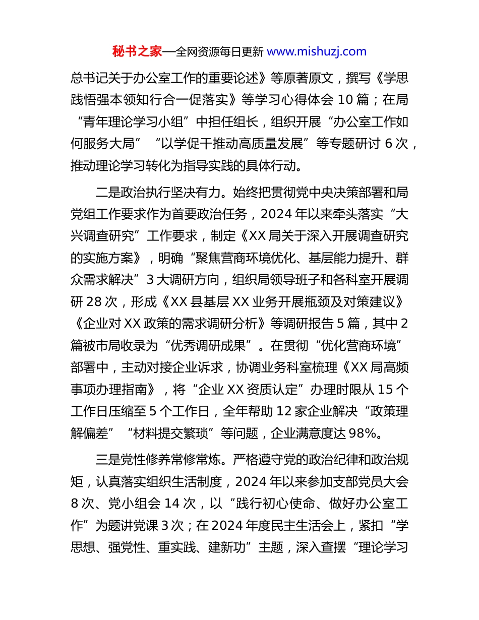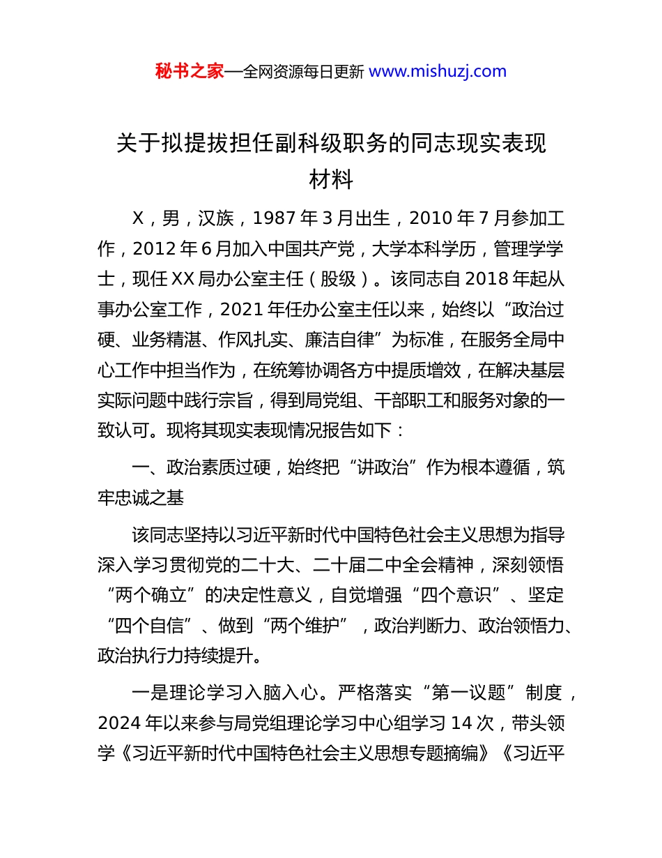 秘书之家—全网资源每日更新 www.mishuzj.com关于拟提拔担任副科级职务的同志现实表现材料X,男,汉族,1987 年 3 月出生,2010 年 7 月参加工作,2012 年 6 月加入中国共产党,大学本科学历,管理学学士,现任 XX 局办公室主任(股级)。该同志自 2018 年起从事办公室工作,2021 年任办公室主任以来,始终以“政治过硬、业务精湛、作风扎实、廉洁自律”为标准,在服务全局中心工作中担当作为,在统筹协调各方中提质增效,在解决基层实际问题中践行宗旨,得到局党组、干部职工和服务对象的一致认可。现将其现实表现情况报告如下:一、政治素质过硬,始终把“讲政治”作为根本遵循,筑牢忠诚之基该同志坚持以习近平新时代中国特色社会主义思想为指导深入学习贯彻党的二十大、二十届二中全会精神,深刻领悟“两个确立”的决定性意义,自觉增强“四个意识”、坚定“四个自信”、做到“两个维护”,政治判断力、政治领悟力、政治执行力持续提升。一是理论学习入脑入心。严格落实“第一议题”制度 ,2024 年以来参与局党组理论学习中心组学习 14 次,带头领学《习近平新时代中国特色社会主义思想专题摘编》《习近平秘书之家—全网资源每日更新 www.mishuzj.com总书记关于办公室工作的重要论述》等原著原文,撰写《学思践悟强本领知行合一促落实》等学习心得体会 10 篇;在局“青年理论学习小组”中担任组长,组织开展“办公室工作如何服务大局”“以学促干推动高质量发展”等专题研讨 6 次,推动理论学习转化为指导实践的具体行动。二是政治执行坚决有力。始终把贯彻党中央决策部署和局党组工作要求作为首要政治任务,2024 年以来牵头落实“大兴调查研究”工作要求,制定《XX 局关于深入开展调查研究的实施方案》,明确“聚焦营商环境优化、基层能力提升、群众需求解决”3 大调研方向,组织局领导班子和各科室开展调研 28 次,形成《XX 县基层 XX 业务开展瓶颈及对策建议》《企业对 XX 政策的需求调研分析》等调研报告 5 篇,其中 2篇被市局收录为“优秀调研成果”。在贯彻“优化营商环境”部署中,主动对接企业诉求,协调业务科室梳理《XX 局高频事项办理指南》,将“企业 XX 资质认定”办理时限从 15 个工作日压缩至 5 个工作日,全年帮助 12 家企业解决“政策理解偏差”“材料提交繁琐”等问题,企业满意度达 98%。三是党性修养常修常炼。严格遵守党的政治纪律和政治规矩,认真落实组织生活制度,2024 年以来参加支部党员大会8 次、党小组会 14 次,以“践行初心使命、做好办公室工作”为题讲党课 3 次;在 2024 年度民主生活会上,紧扣“学思想、强党性、重实践、建新功”主题,深入查摆“理论学习秘书之家—全网资源每日更新 www.mishuzj.com系统性不足”“服务基层主动性不够”等 4 个问题,制定“每日 1 小时原著学习”“每月 2 次基层调研”等整改措施 6条,目前已全部整改到位,党性修养在“红脸出汗”中不断提升。二、履职担当作为,始终把“抓落实”作为核心任务,彰显实干之能该同志深耕办公室岗位 7 年,熟悉办公室“三服务”(服务领导、服务基层、服务群众)核心职能,具备较强的统筹协调、应急处置和精准落实能力,2024 年以来带领办公室团队推动各项工作提质增效,成为局党组的“坚强前哨”和“巩固后院”。一是办文办会精准高效,筑牢工作“基本功”。始终把“零差错、零延误”作为办文办会标准,2024 年以来处理各类公文 1260 余份,其中起草局党组文件 38 份、行政文件62 份,审核修改各科室上报文件 1180 余份,公文格式规范率、内容准确率均达 100%;组织全局工作会议、党组会议、专题研讨会等 36 次,其中筹备 2024 年 XX 局“半年工作推进会”时,从会议方案制定、材料汇编、会场布置到后勤保障,全程参与、逐环节把关,针对“会议议程衔接”“发言材料篇幅”等细节修改 5 次,确保会议既务实高效又符合上级要求,得到局领导“考虑周全、滴水不漏”的评价。秘书之家—全网资源每日更新 www.mishuzj.com二是统筹协调有力有序,织密联动“一张网”。作为办公室主任,该同志...