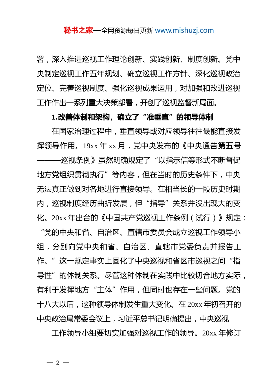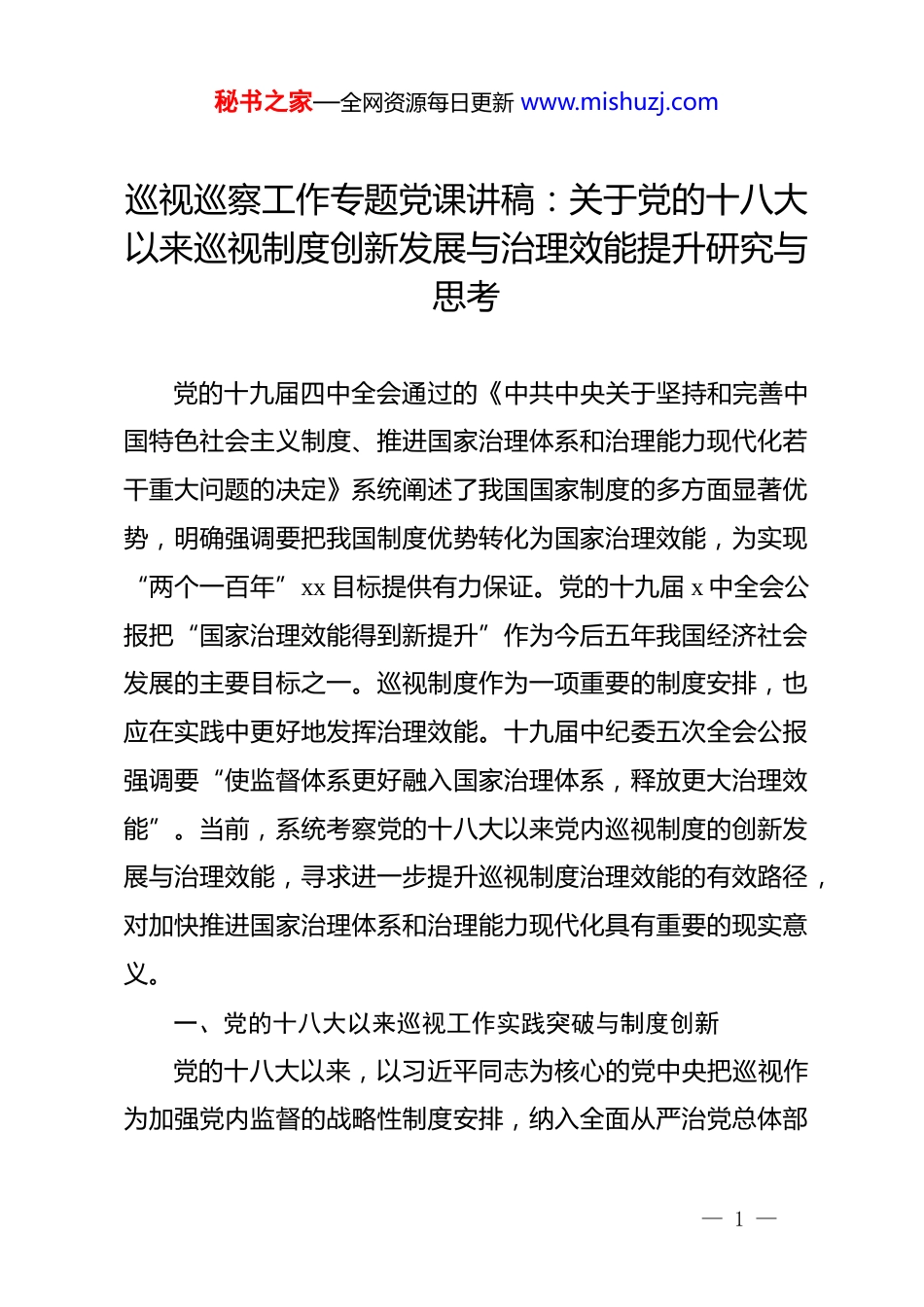 秘书之家—全网资源每日更新 www.mishuzj.com巡视巡察工作专题党课讲稿:关于党的十八大以来巡视制度创新发展与治理效能提升研究与思考党的十九届四中全会通过的《中共中央关于坚持和完善中国特色社会主义制度、推进国家治理体系和治理能力现代化若干重大问题的决定》系统阐述了我国国家制度的多方面显著优势,明确强调要把我国制度优势转化为国家治理效能,为实现“两个一百年”xx 目标提供有力保证。党的十九届 x 中全会公报把“国家治理效能得到新提升”作为今后五年我国经济社会发展的主要目标之一。巡视制度作为一项重要的制度安排,也应在实践中更好地发挥治理效能。十九届中纪委五次全会公报强调要“使监督体系更好融入国家治理体系,释放更大治理效能”。当前,系统考察党的十八大以来党内巡视制度的创新发展与治理效能,寻求进一步提升巡视制度治理效能的有效路径,对加快推进国家治理体系和治理能力现代化具有重要的现实意义。一、党的十八大以来巡视工作实践突破与制度创新党的十八大以来,以习近平同志为核心的党中央把巡视作为加强党内监督的战略性制度安排,纳入全面从严治党总体部— 1 —秘书之家—全网资源每日更新 www.mishuzj.com署,深入推进巡视工作理论创新、实践创新、制度创新。党中央制定巡视工作五年规划、确立巡视工作方针、深化巡视政治定位、完善巡视制度、强化巡视成果运用,对加强和改进巡视工作作出一系列重大决策部署,开创了巡视监督新局面。1.改善体制和架构,确立了“准垂直”的领导体制在国家治理过程中,垂直领导或对应领导往往最能直接发挥领导作用。19xx 年 xx 月,党中央发布的《中央通告第五号———巡视条例》虽然明确规定了“以指示信等形式不断督促地方党组织贯彻执行”等内容,但在当时的历史条件下,中央无法真正做到对各地进行直接领导。在相当长的一段历史时期内,巡视制度经历曲折发展,但“指导”关系并没出现大的变化。20xx 年出台的《中国共产党巡视工作条例(试行)》规定:“党的中央和省、自治区、直辖市委员会成立巡视工作领导小组,分别向党中央和省、自治区、直辖市党委负责并报告工作。”这一规定事实上固化了中央巡视和省区市巡视之间“指导性”的体制关系。尽管这种体制在实践中比较切合地方实际,有利于发挥地方“主体”作用,但同时也存在一些问题。党的十八大以后,这种领导体制发生重大变化。在 20xx 年初召开的中央政治局常委会议上,习近平总书记明确提出,中央巡视工作领导小组要切实加强对巡视工作的领导。20xx 年修订— 2 —秘书之家—全网资源每日更新 www.mishuzj.com后的《中国共产党巡视工作条例》据此规定:“中央巡视工作领导小组应当加强对省、自治区、直辖市巡视工作的领导。”这种由“指导”到“领导”的关系变化,实现了巡视工作领导体制“准垂直”的突破。2.拓展巡视领域和层次,形成全覆盖的工作格局纵向的全面性和横向的系统性,是党的十八大以来巡视工作全覆盖的两大重要取向和目标。新时代,巡视工作的领域范围不断扩大,形成纵向到底、横向到边的巡视工作格局。横向上,按照党的十八届三中全会提出的“改进中央和省区市巡视制度,做到对地方、部门、企事业单位全覆盖”这一要求,巡视工作的领域性全覆盖全面展开。中央巡视组将巡视对象分为地方、部门、央企、金融和事业单位五个板块并分别进行巡视;地方巡视组也在中央巡视工作领导小组领导下开展全方位巡视,“从中央到地方的机关、企事业单位,已全部实施了巡视工作全覆盖”。纵向上,以党的十八届 x 中全会通过的《中国共产党党内监督条例》的规定“中央和省、自治区、直辖市党委一届任期内,对所管理的地方、部门、企事业单位党组织全面巡视”为基准,巡视工作的过程性全覆盖强力推进。特别是市县党委巡察制度的确立,不仅完全消除了监督的死角和盲区,而且使全覆盖固化成为一项重要制度成果。— 3 —秘书之家—全网资源每日更新 www.mishuzj.com3.配套规则和程序,构建多维度的支撑体系任何一项制度的规范运行,都需要相应的配套体系作支撑党内巡视制度也是如此。纵观党的十八大以来巡视制度体系建设,从实体...