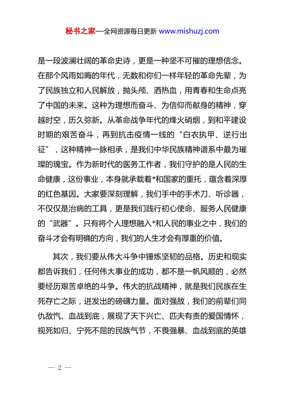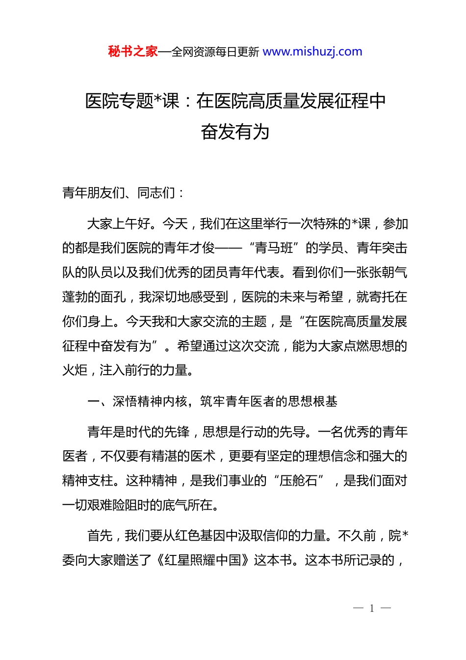 秘书之家—全网资源每日更新 www.mishuzj.com医院专题*课:在医院高质量发展征程中奋发有为青年朋友们、同志们:大家上午好。今天,我们在这里举行一次特殊的*课,参加的都是我们医院的青年才俊——“青马班”的学员、青年突击队的队员以及我们优秀的团员青年代表。看到你们一张张朝气蓬勃的面孔,我深切地感受到,医院的未来与希望,就寄托在你们身上。今天我和大家交流的主题,是“在医院高质量发展征程中奋发有为”。希望通过这次交流,能为大家点燃思想的火炬,注入前行的力量。一、深悟精神内核,筑牢青年医者的思想根基青年是时代的先锋,思想是行动的先导。一名优秀的青年医者,不仅要有精湛的医术,更要有坚定的理想信念和强大的精神支柱。这种精神,是我们事业的“压舱石”,是我们面对一切艰难险阻时的底气所在。首先,我们要从红色基因中汲取信仰的力量。不久前,院*委向大家赠送了《红星照耀中国》这本书。这本书所记录的,— 1 —秘书之家—全网资源每日更新 www.mishuzj.com是一段波澜壮阔的革命史诗,更是一种坚不可摧的理想信念。在那个风雨如晦的年代,无数和你们一样年轻的革命先辈,为了民族独立和人民解放,抛头颅、洒热血,用青春和生命点亮了中国的未来。这种为理想而奋斗、为信仰而献身的精神,穿越时空,历久弥新。从革命战争年代的烽火硝烟,到和平建设时期的艰苦奋斗,再到抗击疫情一线的“白衣执甲、逆行出征”,这种精神一脉相承,是我们中华民族精神谱系中最为璀璨的瑰宝。作为新时代的医务工作者,我们守护的是人民的生命健康,这份事业,本身就承载着*和国家的重托,蕴含着深厚的红色基因。大家要深刻理解,我们手中的手术刀、听诊器,不仅仅是治病的工具,更是我们践行初心使命、服务人民健康的“武器”。只有将个人理想融入*和人民的事业之中,我们的奋斗才会有明确的方向,我们的人生才会有厚重的价值。其次,我们要从伟大斗争中锤炼坚韧的品格。历史和现实都告诉我们,任何伟大事业的成功,都不是一帆风顺的,必然要经历艰苦卓绝的斗争。伟大的抗战精神,就是我们民族在生死存亡之际,迸发出的磅礴力量。面对强敌,我们的前辈们同仇敌忾、血战到底,展现了天下兴亡、匹夫有责的爱国情怀,视死如归、宁死不屈的民族气节,不畏强暴、血战到底的英雄— 2 —秘书之家—全网资源每日更新 www.mishuzj.com气概,百折不挠、坚忍不拔的必胜信念。这种精神,在今天同样具有无比重要的现实意义。我们医疗战线,就是一个没有硝烟的战场。我们面对的“敌人”,是各种复杂、危重、罕见的疾病。攻克一个医学难题,不亚于打一场硬仗;抢救一个危重病人,无异于一次冲锋。这同样需要我们具备不畏艰险、敢于斗争、善于斗争的品格。当面对一台高难度的手术,我们是否敢于挑战、精益求精?当面对持续高强度的工作压力,我们是否能够坚韧不拔、任劳任怨?当面对突发公共卫生事件,我们是否能够挺身而出、迎难而上?伟大斗争精神,就是要锻造我们这样的钢铁意志和过硬本领。最后,我们要在一线实践中弘扬务实的作风。空谈误国,实干兴邦。推动医院高质量发展,绝不是敲锣打鼓、轻轻松松就能实现的。我今天想特别强调一种精神,那就是“钉钉子精神”。什么叫钉钉子?就是要一锤接着一锤敲,要稳、要准、要狠,直到把钉子钉实钉牢。这个比喻,生动地诠释了我们干事创业应有的态度和方法。在医疗工作中,“钉钉子精神”体现在方方面面。它体现在对每一份病历的严谨书写,对每一次查房的细致入微,对每一项操作规程的严格遵守。它要求我们不能有丝毫的马虎和懈怠,因为任何一个微小的疏忽,都可能— 3 —秘书之家—全网资源每日更新 www.mishuzj.com给患者带来无法挽回的伤害。在推动医院改革发展的进程中,“钉钉子精神”同样至关重要。医院的每一项改革举措、每一个发展项目,都需要我们以钉钉子的精神去抓落实。不能朝令夕改,不能虎头蛇尾,更不能遇到一点困难就打退堂鼓。要有一抓到底的决心,要有锲而不舍的毅力,盯着目标,持续发力,善作善成。青年同志们思想活跃、勇于创新,这是优点,但同时也要戒除浮躁,沉下心来,把“钉钉子精神”作为一种工作习...
