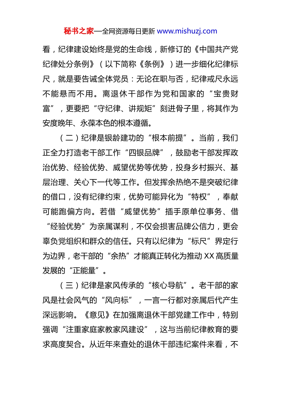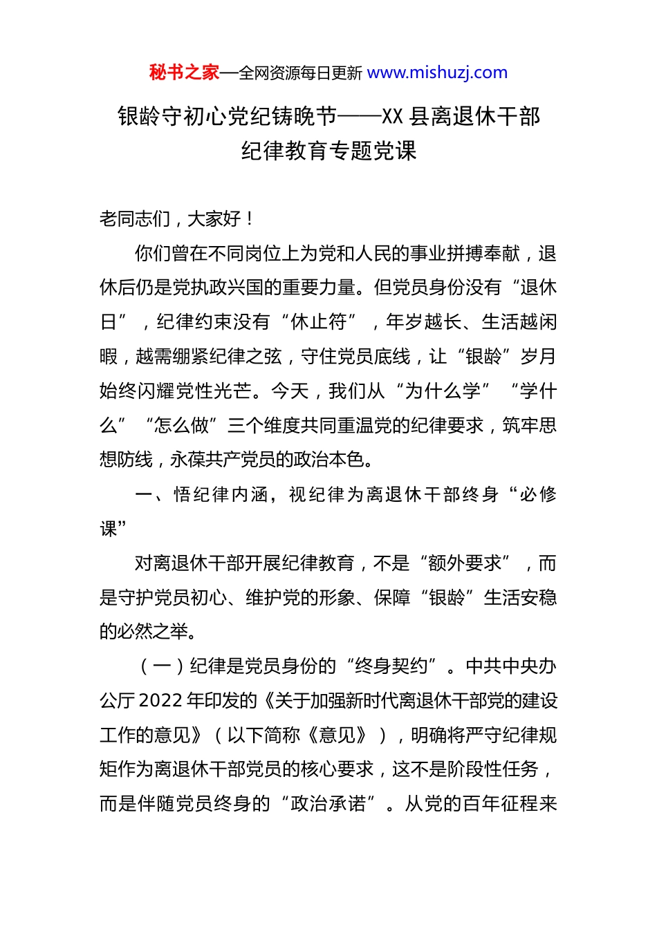 秘书之家—全网资源每日更新 www.mishuzj.com银龄守初心党纪铸晚节——XX 县离退休干部纪律教育专题党课 老同志们,大家好!你们曾在不同岗位上为党和人民的事业拼搏奉献,退休后仍是党执政兴国的重要力量。但党员身份没有“退休日”,纪律约束没有“休止符”,年岁越长、生活越闲暇,越需绷紧纪律之弦,守住党员底线,让“银龄”岁月始终闪耀党性光芒。今天,我们从“为什么学”“学什么”“怎么做”三个维度共同重温党的纪律要求,筑牢思想防线,永葆共产党员的政治本色。一、悟纪律内涵,视纪律为离退休干部终身“必修课”对离退休干部开展纪律教育,不是“额外要求”,而是守护党员初心、维护党的形象、保障“银龄”生活安稳的必然之举。(一)纪律是党员身份的“终身契约”。中共中央办公厅 2022 年印发的《关于加强新时代离退休干部党的建设工作的意见》(以下简称《意见》),明确将严守纪律规矩作为离退休干部党员的核心要求,这不是阶段性任务,而是伴随党员终身的“政治承诺”。从党的百年征程来秘书之家—全网资源每日更新 www.mishuzj.com看,纪律建设始终是党的生命线,新修订的《中国共产党纪律处分条例》(以下简称《条例》)进一步细化纪律标尺,就是要告诫全体党员:无论在职与否,纪律戒尺永远不能悬而不用。离退休干部作为党和国家的“宝贵财富”,更要把“守纪律、讲规矩”刻进骨子里,将其作为安度晚年、永葆本色的根本遵循。(二)纪律是银龄建功的“根本前提”。当前,我们正全力打造老干部工作“四银品牌”,鼓励老干部发挥政治优势、经验优势、威望优势等优势,投身乡村振兴、基层治理、关心下一代等工作。但发挥余热绝不是突破纪律的借口,没有纪律约束,优势可能异化为“特权”,奉献可能跑偏方向。若借“威望优势”插手原单位事务、借“经验优势”为亲属谋利,不仅会损害品牌公信力,更会辜负党组织和群众的信任。只有以纪律为“标尺”界定行为边界,老干部的“余热”才能真正转化为推动 XX 高质量发展的“正能量”。(三)纪律是家风传承的“核心导航”。老干部的家风是社会风气的“风向标”,一言一行都对亲属后代产生深远影响。《意见》在加强离退休干部党建工作中,特别强调“注重家庭家教家风建设”,这与当前纪律教育的要求高度契合。从近年来查处的退休干部违纪案件来看,不秘书之家—全网资源每日更新 www.mishuzj.com少问题根源在于“家风不正”——有的默许子女利用自己的职务影响经商谋利,有的纵容亲属违规获取利益,最终自己晚节不保,更带坏了家庭风气。反观“草鞋书记”杨善洲,退休后仍坚守“不占公家一分便宜”的纪律底线,不仅自己成为榜样,更让“公私分明、崇廉拒腐”的家风代代相传。这充分说明,管好家人、树好家风,既是纪律要求,更是老干部的责任担当。二、严守纪律底线,做遵守守纪的离退休干部全体离退休干部必须严守纪律规矩,做到知敬畏、存戒惧、守底线。(一)严守政治纪律,筑牢信仰“定盘星”政治纪律是最重要、最根本、最关键的纪律,核心是做到“两个坚决、一个自觉”。一是坚决同党中央保持高度一致。要始终恪守“五个必须”(必须维护党中央权威、必须维护党的团结、必须遵循组织程序、必须服从组织决定、必须管好亲属和身边工作人员),杜绝“人退休、思想滑坡”的错误倾向。要清醒认识到,“不在岗”不等于可以“不讲政治”。党员身份没有“退休日”,政治忠诚更无“休止符”。无论是否离开工作岗位,都必须始终牢记第一身份是共产党员,自觉在思想上政治上行动上同党中央保持高度一致,以实秘书之家—全网资源每日更新 www.mishuzj.com际行动践行对党的忠诚承诺。二是坚决杜绝政治偏差。《意见》明确规定,离退休干部党员“不得妄议党中央大政方针,不得传播政治性负面言论”。大家必须严格遵守《中国共产党党员网络行为规定》及自治区关于党组织和党员在网络空间的行为规范,不发布未经证实的信息、不转发来源不明的内容、不造谣传谣信谣,自觉维护清朗网络空间和良好政治生态。现实中,个别老同志对政治纪律的严肃性认识不足,把“随口议论”当成“无伤大雅”,有的在亲友聚会中随意评论党中央决...
