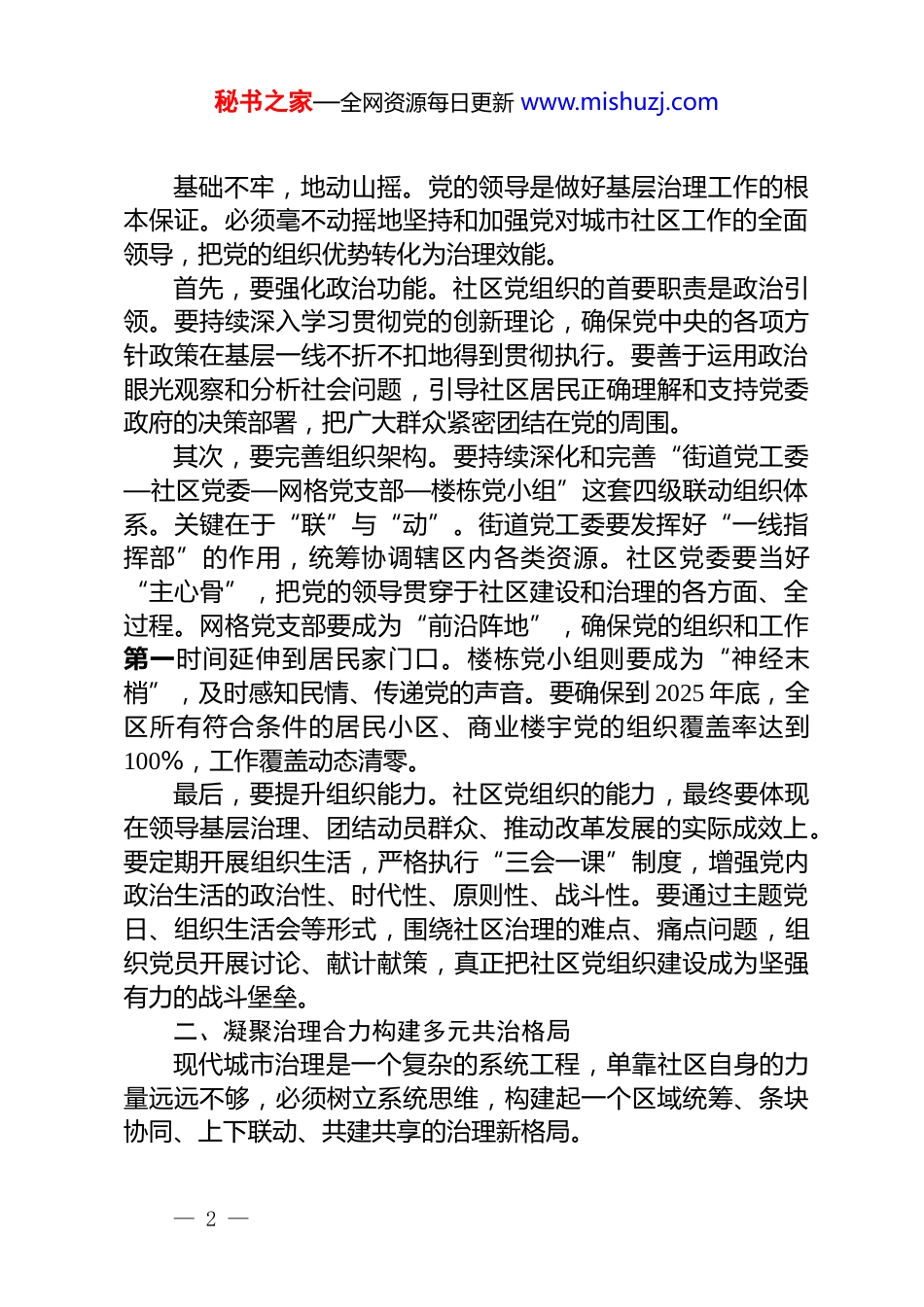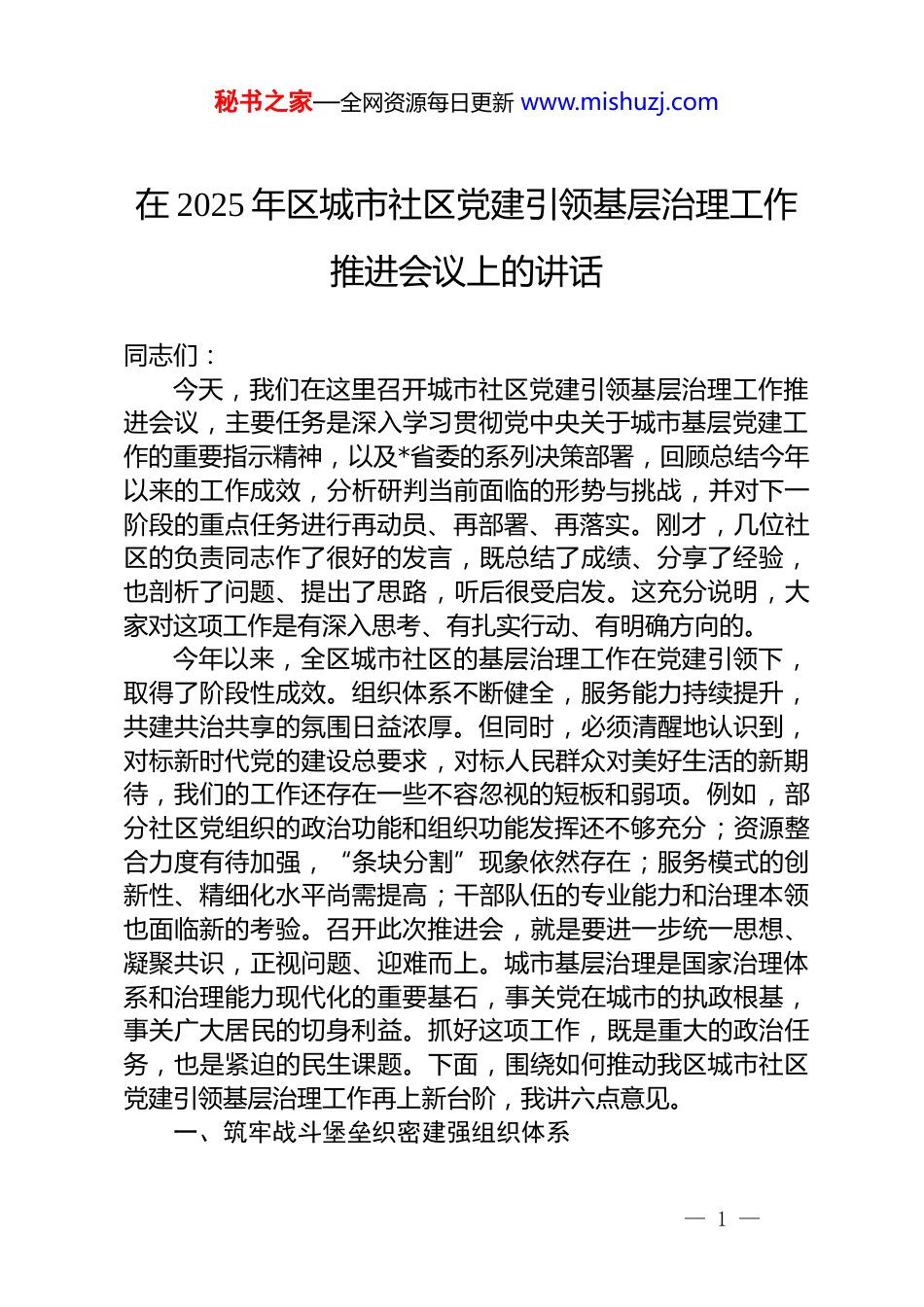 秘书之家—全网资源每日更新 www.mishuzj.com在 2025 年区城市社区党建引领基层治理工作推进会议上的讲话同志们:今天,我们在这里召开城市社区党建引领基层治理工作推进会议,主要任务是深入学习贯彻党中央关于城市基层党建工作的重要指示精神,以及*省委的系列决策部署,回顾总结今年以来的工作成效,分析研判当前面临的形势与挑战,并对下一阶段的重点任务进行再动员、再部署、再落实。刚才,几位社区的负责同志作了很好的发言,既总结了成绩、分享了经验,也剖析了问题、提出了思路,听后很受启发。这充分说明,大家对这项工作是有深入思考、有扎实行动、有明确方向的。今年以来,全区城市社区的基层治理工作在党建引领下,取得了阶段性成效。组织体系不断健全,服务能力持续提升,共建共治共享的氛围日益浓厚。但同时,必须清醒地认识到,对标新时代党的建设总要求,对标人民群众对美好生活的新期待,我们的工作还存在一些不容忽视的短板和弱项。例如,部分社区党组织的政治功能和组织功能发挥还不够充分;资源整合力度有待加强,“条块分割”现象依然存在;服务模式的创新性、精细化水平尚需提高;干部队伍的专业能力和治理本领也面临新的考验。召开此次推进会,就是要进一步统一思想、凝聚共识,正视问题、迎难而上。城市基层治理是国家治理体系和治理能力现代化的重要基石,事关党在城市的执政根基,事关广大居民的切身利益。抓好这项工作,既是重大的政治任务,也是紧迫的民生课题。下面,围绕如何推动我区城市社区党建引领基层治理工作再上新台阶,我讲六点意见。一、筑牢战斗堡垒织密建强组织体系— 1 —秘书之家—全网资源每日更新 www.mishuzj.com基础不牢,地动山摇。党的领导是做好基层治理工作的根本保证。必须毫不动摇地坚持和加强党对城市社区工作的全面领导,把党的组织优势转化为治理效能。首先,要强化政治功能。社区党组织的首要职责是政治引领。要持续深入学习贯彻党的创新理论,确保党中央的各项方针政策在基层一线不折不扣地得到贯彻执行。要善于运用政治眼光观察和分析社会问题,引导社区居民正确理解和支持党委政府的决策部署,把广大群众紧密团结在党的周围。其次,要完善组织架构。要持续深化和完善“街道党工委—社区党委—网格党支部—楼栋党小组”这套四级联动组织体系。关键在于“联”与“动”。街道党工委要发挥好“一线指挥部”的作用,统筹协调辖区内各类资源。社区党委要当好“主心骨”,把党的领导贯穿于社区建设和治理的各方面、全过程。网格党支部要成为“前沿阵地”,确保党的组织和工作第一时间延伸到居民家门口。楼栋党小组则要成为“神经末梢”,及时感知民情、传递党的声音。要确保到 2025 年底,全区所有符合条件的居民小区、商业楼宇党的组织覆盖率达到100%,工作覆盖动态清零。最后,要提升组织能力。社区党组织的能力,最终要体现在领导基层治理、团结动员群众、推动改革发展的实际成效上。要定期开展组织生活,严格执行“三会一课”制度,增强党内政治生活的政治性、时代性、原则性、战斗性。要通过主题党日、组织生活会等形式,围绕社区治理的难点、痛点问题,组织党员开展讨论、献计献策,真正把社区党组织建设成为坚强有力的战斗堡垒。二、凝聚治理合力构建多元共治格局现代城市治理是一个复杂的系统工程,单靠社区自身的力量远远不够,必须树立系统思维,构建起一个区域统筹、条块协同、上下联动、共建共享的治理新格局。— 2 —秘书之家—全网资源每日更新 www.mishuzj.com第一,要做实“大工委”“大党委”机制。这个机制不是挂个名、开个会,而是要实现实质性的融合联动。社区党组织要主动担当起“轴心”作用,积极与辖区内的机关、企事业单位、社会组织等建立常态化沟通协调机制。要推动驻区单位党组织切实履行“双报到”职责,不仅仅是党员个人来报到,更要推动单位的组织资源、服务资源、文化资源向社区开放共享。要探索建立需求、资源、项目“三张清单”,实现社区“点单”、单位“派单”、党员“接单”的精准对接,共同解决停车难、环境整治、扶老助残等一批群众急难愁盼问题。第二,要激发社会力量参与...