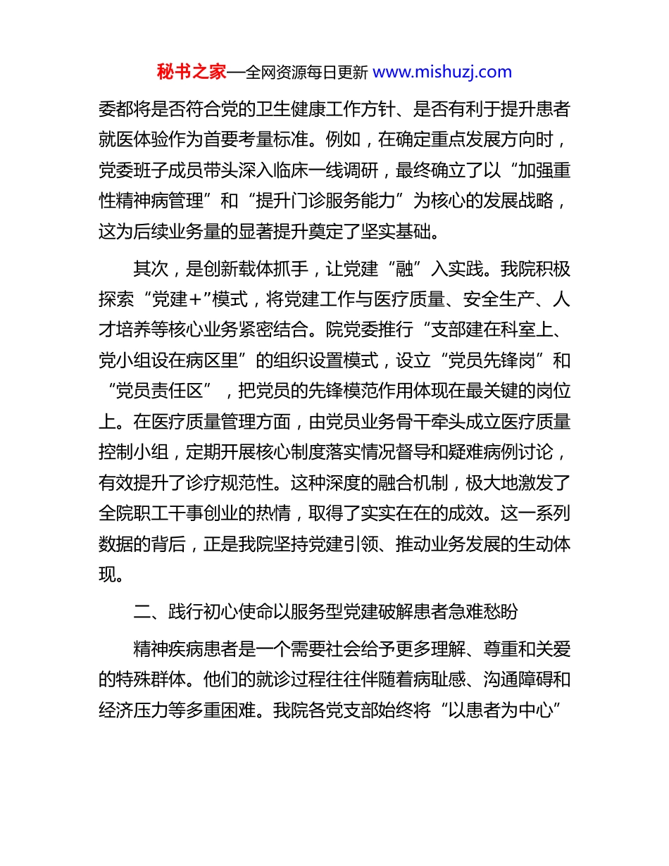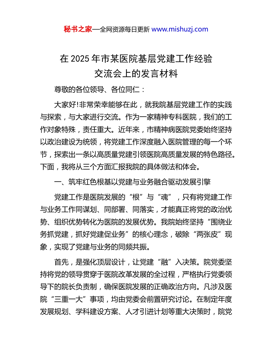 秘书之家—全网资源每日更新 www.mishuzj.com在 2025 年市某医院基层党建工作经验交流会上的发言材料尊敬的各位领导、各位同仁:大家好!非常荣幸能够在此,就我院基层党建工作的实践与探索,与大家进行交流。作为一家精神专科医院,我们的工作对象特殊,责任重大。近年来,市精神病医院党委始终坚持以政治建设为统领,将党建工作深度融入医院管理的每一个环节,探索出一条以高质量党建引领医院高质量发展的特色路径。下面,我将从三个方面汇报我院的具体做法和体会。一、筑牢红色根基以党建与业务融合驱动发展引擎党建工作是医院发展的“根”与“魂”,只有将党建工作与业务工作同谋划、同部署、同落实,才能真正将党的政治优势、组织优势转化为医院的发展优势。我院始终坚持“围绕业务抓党建,抓好党建促业务”的核心理念,破除“两张皮”现象,实现了党建与业务的同频共振。首先,是强化顶层设计,让党建“融”入决策。院党委坚持将党的领导贯穿于医院改革发展的全过程,严格执行党委领导下的院长负责制,确保医院发展的正确政治方向。凡涉及医院“三重一大”事项,均由党委会前置研究讨论。在制定年度发展规划、学科建设方案、人才引进计划等重大决策时,院党秘书之家—全网资源每日更新 www.mishuzj.com委都将是否符合党的卫生健康工作方针、是否有利于提升患者就医体验作为首要考量标准。例如,在确定重点发展方向时,党委班子成员带头深入临床一线调研,最终确立了以“加强重性精神病管理”和“提升门诊服务能力”为核心的发展战略,这为后续业务量的显著提升奠定了坚实基础。其次,是创新载体抓手,让党建“融”入实践。我院积极探索“党建+”模式,将党建工作与医疗质量、安全生产、人才培养等核心业务紧密结合。院党委推行“支部建在科室上、党小组设在病区里”的组织设置模式,设立“党员先锋岗”和“党员责任区”,把党员的先锋模范作用体现在最关键的岗位上。在医疗质量管理方面,由党员业务骨干牵头成立医疗质量控制小组,定期开展核心制度落实情况督导和疑难病例讨论,有效提升了诊疗规范性。这种深度的融合机制,极大地激发了全院职工干事创业的热情,取得了实实在在的成效。这一系列数据的背后,正是我院坚持党建引领、推动业务发展的生动体现。二、践行初心使命以服务型党建破解患者急难愁盼精神疾病患者是一个需要社会给予更多理解、尊重和关爱的特殊群体。他们的就诊过程往往伴随着病耻感、沟通障碍和经济压力等多重困难。我院各党支部始终将“以患者为中心”秘书之家—全网资源每日更新 www.mishuzj.com的服务理念内化于心、外化于行,努力将党建工作做到患者的心坎上,着力解决患者的“急难愁盼”问题。第一,聚焦就诊流程再造,打造有温度的医疗服务。精神疾病患者在就诊时可能表现出情绪不稳、表述不清等特点,传统的就诊流程会给他们带来额外的心理负担。为了解决这一痛点,门诊党支部牵头开展了“优化就诊流程,提升服务体验”专项行动。经过党员带头调研和多方论证,医院于 2024 年下半年正式开设了“方便门诊”。该门诊简化了挂号、缴费等环节,由经验丰富的党员医生坐诊,为复诊取药、病情咨询的患者提供一站式、人性化的便捷服务。此外,支部还在导诊台设立“党员咨询岗”,主动识别和引导那些看起来迷茫、焦虑的患者,全程陪同就诊,有效缓解了他们的紧张情绪。这些看似微小的举措,实则体现了党组织对患者需求的深刻洞察和真切关怀。第二,延伸院外服务链条,筑牢社会化康复防线。重性精神障碍患者的管理是精神卫生工作的重中之重,也是难点所在。为确保患者出院后能够得到持续、规范的治疗和康复指导,我院临床党支部联合医务社工,将服务触角从院内延伸至社区和家庭。支部定期组织党员医疗队,深入社区开展重性精神病患者的随访管理工作,评估患者病情、指导家属监护、进行心理疏导,确保患者不脱管、不漏管。同时,医院党委着力打造“心沐阳光”党建品牌活动,常态化开展“服务百姓健康”大秘书之家—全网资源每日更新 www.mishuzj.com型义诊活动,组织党员为经济困难的患者家庭进行爱心捐赠,帮助他们解决实际困难,重拾生活信心。这些...