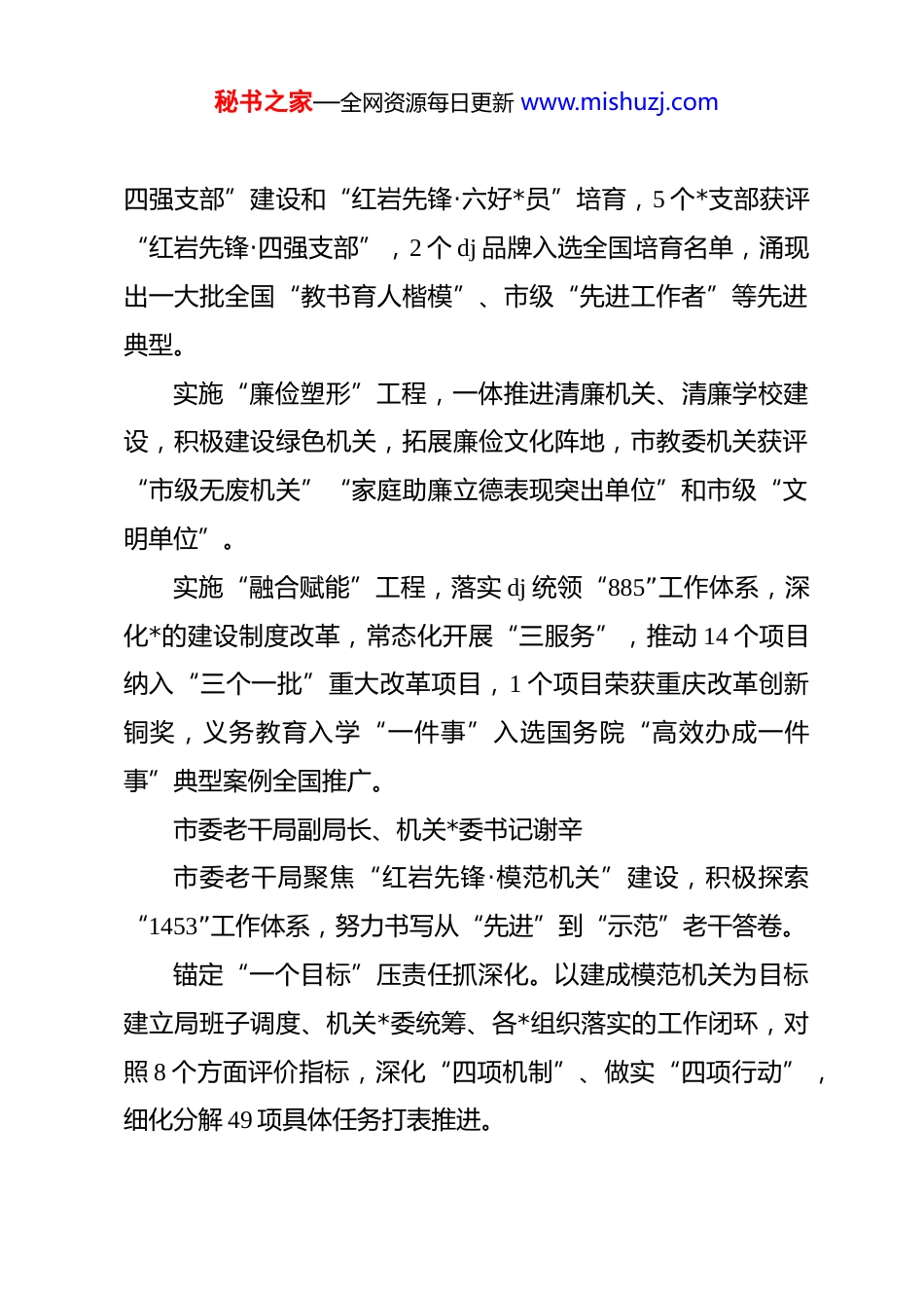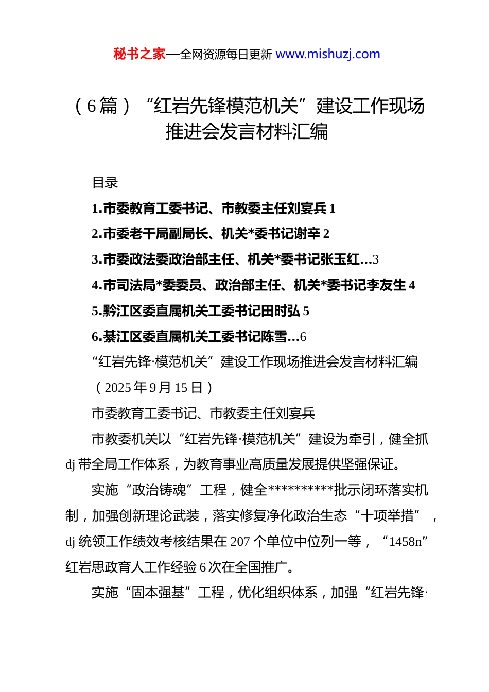 秘书之家—全网资源每日更新 www.mishuzj.com(6 篇)“红岩先锋模范机关”建设工作现场推进会发言材料汇编目录1.市委教育工委书记、市教委主任刘宴兵 12.市委老干局副局长、机关*委书记谢辛 23.市委政法委政治部主任、机关*委书记张玉红…34.市司法局*委委员、政治部主任、机关*委书记李友生 45.黔江区委直属机关工委书记田时弘 56.綦江区委直属机关工委书记陈雪…6“红岩先锋·模范机关”建设工作现场推进会发言材料汇编(2025 年 9 月 15 日)市委教育工委书记、市教委主任刘宴兵市教委机关以“红岩先锋·模范机关”建设为牵引,健全抓dj 带全局工作体系,为教育事业高质量发展提供坚强保证。实施“政治铸魂”工程,健全**********批示闭环落实机制,加强创新理论武装,落实修复净化政治生态“十项举措”,dj 统领工作绩效考核结果在 207 个单位中位列一等,“1458n”红岩思政育人工作经验 6 次在全国推广。实施“固本强基”工程,优化组织体系,加强“红岩先锋·秘书之家—全网资源每日更新 www.mishuzj.com四强支部”建设和“红岩先锋·六好*员”培育,5 个*支部获评“红岩先锋·四强支部”,2 个 dj 品牌入选全国培育名单,涌现出一大批全国“教书育人楷模”、市级“先进工作者”等先进典型。实施“廉俭塑形”工程,一体推进清廉机关、清廉学校建设,积极建设绿色机关,拓展廉俭文化阵地,市教委机关获评“市级无废机关”“家庭助廉立德表现突出单位”和市级“文明单位”。实施“融合赋能”工程,落实 dj 统领“885”工作体系,深化*的建设制度改革,常态化开展“三服务”,推动 14 个项目纳入“三个一批”重大改革项目,1 个项目荣获重庆改革创新铜奖,义务教育入学“一件事”入选国务院“高效办成一件事”典型案例全国推广。市委老干局副局长、机关*委书记谢辛市委老干局聚焦“红岩先锋·模范机关”建设,积极探索“1453”工作体系,努力书写从“先进”到“示范”老干答卷。锚定“一个目标”压责任抓深化。以建成模范机关为目标建立局班子调度、机关*委统筹、各*组织落实的工作闭环,对照 8 个方面评价指标,深化“四项机制”、做实“四项行动”,细化分解 49 项具体任务打表推进。秘书之家—全网资源每日更新 www.mishuzj.com加强“四维引领”铸忠诚强*性。政治引领促担当,开展贯彻落实******视察重庆重要讲话精神“回头看”,全面推进“五强五促”行动;思想引领增智慧,深化落实“四个五”学习机制,完善“第一议题”跟进学等“六学联动”机制,推动常学常新、常悟常进。组织引领提活力,一体推进“红岩先锋·四强支部”“红岩先锋·六好*员”培树,贯通基层组织经脉血气。作风引领树形象,延伸清廉细胞,深化“四个一”建设,完善作风建设制度机制 16 项。运用“五项抓手”促变革激动能。调研攻关破难题,开展全市大调研活动,确定形成 21 个调研课题。创新项目求突破,谋划生成重点改革项目 9 个,培育实施“创新项目”2 个。迭代品牌聚势能,持续优化“红岩青松”dj 品牌,总结提炼“支部工作法”。塑造队伍强能力,举办 dj*务、调研信息等“训练营”,搭建“书记讲坛”“青年讲堂”等平台载体。数字赋能建平台,建设“红岩青松”应用平台,构建五个实战场景,获评 2024 年度数字重庆建设优秀成果银奖。转化“三类成果”助发展重质效。“巴渝夕阳红”底色亮推出“榜样在身边”系列展播,阅读量近 3000 万人次。“渝老有福”管理优,迭代完善服务管理“五送”“五心”工作机制,走访慰问和帮扶困难老同志 21.6 万余人次。“山城银辉”作用秘书之家—全网资源每日更新 www.mishuzj.com好,组建 3 支银发人才示范团,吸引登记离退休干部志愿组织420 个、志愿者 7800 余名。市委政法委政治部主任、机关*委书记张玉红市委政法委坚持以建设“红岩先锋·模范机关”为目标,健全“六项机制”,深入实施“八项行动”,促进各项工作有序开展。健全政治铸魂机制,进一步筑牢政治忠诚。健全**********批示精神和*中央决策部署闭环落实机制、完善请示报告制度落实机制、修复净化政治生态工作举措,切实营造风清气正的政治...