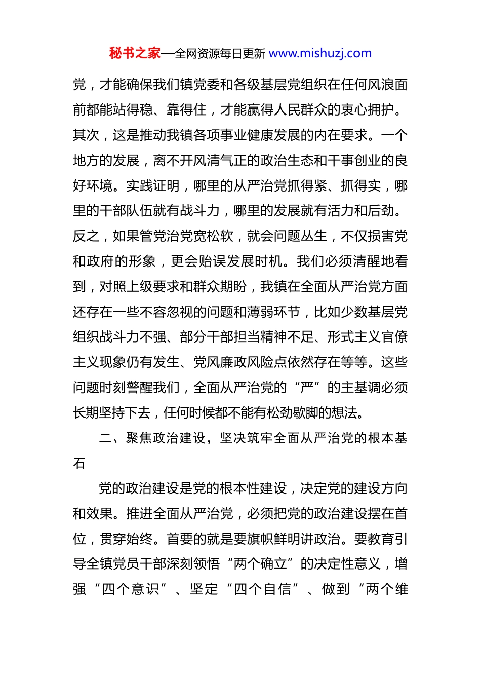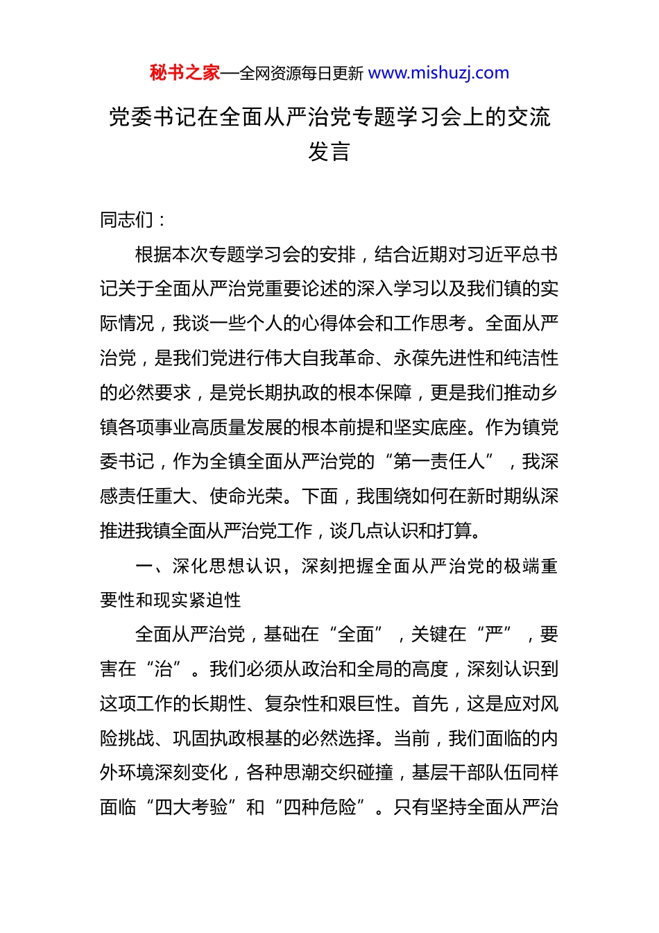 秘书之家—全网资源每日更新 www.mishuzj.com党委书记在全面从严治党专题学习会上的交流发言 同志们:根据本次专题学习会的安排,结合近期对习近平总书记关于全面从严治党重要论述的深入学习以及我们镇的实际情况,我谈一些个人的心得体会和工作思考。全面从严治党,是我们党进行伟大自我革命、永葆先进性和纯洁性的必然要求,是党长期执政的根本保障,更是我们推动乡镇各项事业高质量发展的根本前提和坚实底座。作为镇党委书记,作为全镇全面从严治党的“第一责任人”,我深感责任重大、使命光荣。下面,我围绕如何在新时期纵深推进我镇全面从严治党工作,谈几点认识和打算。一、深化思想认识,深刻把握全面从严治党的极端重要性和现实紧迫性全面从严治党,基础在“全面”,关键在“严”,要害在“治”。我们必须从政治和全局的高度,深刻认识到这项工作的长期性、复杂性和艰巨性。首先,这是应对风险挑战、巩固执政根基的必然选择。当前,我们面临的内外环境深刻变化,各种思潮交织碰撞,基层干部队伍同样面临“四大考验”和“四种危险”。只有坚持全面从严治秘书之家—全网资源每日更新 www.mishuzj.com党,才能确保我们镇党委和各级基层党组织在任何风浪面前都能站得稳、靠得住,才能赢得人民群众的衷心拥护。其次,这是推动我镇各项事业健康发展的内在要求。一个地方的发展,离不开风清气正的政治生态和干事创业的良好环境。实践证明,哪里的从严治党抓得紧、抓得实,哪里的干部队伍就有战斗力,哪里的发展就有活力和后劲。反之,如果管党治党宽松软,就会问题丛生,不仅损害党和政府的形象,更会贻误发展时机。我们必须清醒地看到,对照上级要求和群众期盼,我镇在全面从严治党方面还存在一些不容忽视的问题和薄弱环节,比如少数基层党组织战斗力不强、部分干部担当精神不足、形式主义官僚主义现象仍有发生、党风廉政风险点依然存在等等。这些问题时刻警醒我们,全面从严治党的“严”的主基调必须长期坚持下去,任何时候都不能有松劲歇脚的想法。二、聚焦政治建设,坚决筑牢全面从严治党的根本基石党的政治建设是党的根本性建设,决定党的建设方向和效果。推进全面从严治党,必须把党的政治建设摆在首位,贯穿始终。首要的就是要旗帜鲜明讲政治。要教育引导全镇党员干部深刻领悟“两个确立”的决定性意义,增强“四个意识”、坚定“四个自信”、做到“两个维秘书之家—全网资源每日更新 www.mishuzj.com护”。这不是抽象的口号,而是要具体落实到我们工作的各方面和全过程。要确保党中央的各项决策部署,以及省委、市委、区委的工作要求,在我们镇不折不扣地落地生根、开花结果。决不允许在执行中出现“温差”“落差”和“偏差”。要严明政治纪律和政治规矩。在重大原则问题上,必须头脑特别清醒、立场特别坚定。要严格执行《关于新形势下党内政治生活的若干准则》,着力增强党内政治生活的政治性、时代性、原则性、战斗性。要提高党员干部的政治能力,善于从政治上看问题,善于把握政治大局,不断提高政治判断力、政治领悟力、政治执行力。镇党委班子要率先垂范,带头维护党中央权威和集中统一领导,带头营造风清气正的政治生态,形成“头雁效应”。三、强化思想引领,持续夯实全面从严治党的思想根基思想是行动的先导。全面从严治党,必须坚持思想建党和制度治党同向发力。要持之以恒用党的创新理论武装头脑。把深入学习贯彻习近平新时代中国特色社会主义思想作为长期政治任务,完善党委理论学习中心组学习制度,带动各支部和全体党员读原著、学原文、悟原理,真正做到学思用贯通、知信行统一。要精心组织开展好各类秘书之家—全网资源每日更新 www.mishuzj.com主题教育活动,不仅要完成“规定动作”,更要结合我镇实际,设计“自选动作”,确保学习入脑入心、见行见效。要牢牢掌握意识形态工作领导权。严格落实意识形态工作责任制,守好各类阵地,特别是要管好用好网络平台,加强对社会思潮的辨析引导,敢于发声亮剑,坚决抵制各种错误言论。要加强理想信念教育和党性教育。充分挖掘和利用好本地的红色资源,讲好党的故事、革命的故事,引导党员干部传承红色基因,赓...
