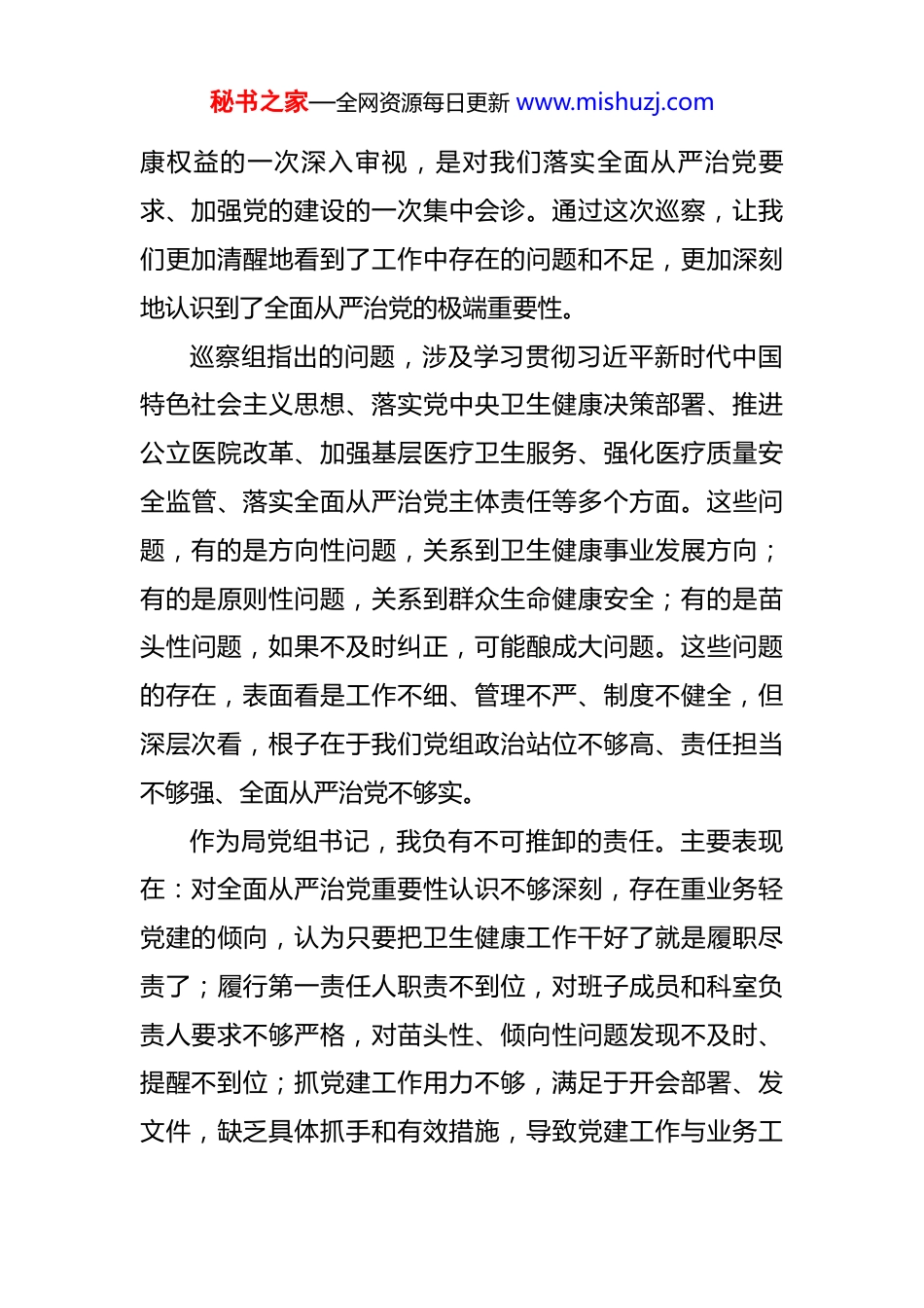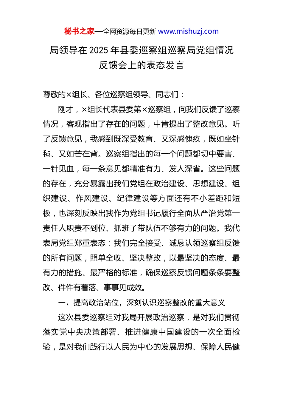 秘书之家—全网资源每日更新 www.mishuzj.com局领导在 2025 年县委巡察组巡察局党组情况反馈会上的表态发言 尊敬的×组长、各位巡察组领导、同志们:刚才,×组长代表县委第×巡察组,向我们反馈了巡察情况,客观指出了存在的问题,中肯提出了整改意见。听了反馈意见,我感到既深受教育、又深感愧疚,既如坐针毡、又如芒在背。巡察组指出的每一个问题都切中要害、一针见血,每一条意见都精准有力、发人深省。这些问题的存在,充分暴露出我们党组在政治建设、思想建设、组织建设、作风建设、纪律建设等方面还有不小差距和短板,也深刻反映出我作为党组书记履行全面从严治党第一责任人职责不到位、抓班子带队伍不够有力的问题。我代表局党组郑重表态:我们完全接受、诚恳认领巡察组反馈的所有问题,照单全收、坚决整改,以最坚决的态度、最有力的措施、最严格的标准,确保巡察反馈问题条条要整改、件件有着落、事事见成效。一、提高政治站位,深刻认识巡察整改的重大意义这次县委巡察组对我局开展政治巡察,是对我们贯彻落实党中央决策部署、推进健康中国建设的一次全面检验,是对我们践行以人民为中心的发展思想、保障人民健秘书之家—全网资源每日更新 www.mishuzj.com康权益的一次深入审视,是对我们落实全面从严治党要求、加强党的建设的一次集中会诊。通过这次巡察,让我们更加清醒地看到了工作中存在的问题和不足,更加深刻地认识到了全面从严治党的极端重要性。巡察组指出的问题,涉及学习贯彻习近平新时代中国特色社会主义思想、落实党中央卫生健康决策部署、推进公立医院改革、加强基层医疗卫生服务、强化医疗质量安全监管、落实全面从严治党主体责任等多个方面。这些问题,有的是方向性问题,关系到卫生健康事业发展方向;有的是原则性问题,关系到群众生命健康安全;有的是苗头性问题,如果不及时纠正,可能酿成大问题。这些问题的存在,表面看是工作不细、管理不严、制度不健全,但深层次看,根子在于我们党组政治站位不够高、责任担当不够强、全面从严治党不够实。作为局党组书记,我负有不可推卸的责任。主要表现在:对全面从严治党重要性认识不够深刻,存在重业务轻党建的倾向,认为只要把卫生健康工作干好了就是履职尽责了;履行第一责任人职责不到位,对班子成员和科室负责人要求不够严格,对苗头性、倾向性问题发现不及时、提醒不到位;抓党建工作用力不够,满足于开会部署、发文件,缺乏具体抓手和有效措施,导致党建工作与业务工秘书之家—全网资源每日更新 www.mishuzj.com作"两张皮"。我们必须从讲政治的高度,从对党负责、对人民负责、对生命健康负责的高度,充分认识巡察整改的重大意义,把巡察整改作为当前和今后一个时期的重大政治任务,作为检验"四个意识"强不强、"两个维护"坚决不坚决的重要标尺,以高度的政治自觉、思想自觉、行动自觉抓好整改落实,推动卫生健康事业高质量发展,切实保障人民群众生命安全和身体健康。二、聚焦问题根源,坚决把巡察反馈问题改彻底改到位针对巡察组反馈的问题,我们将坚持问题导向、目标导向、结果导向,深挖问题根源,对症下药、精准施策,确保整改工作取得实实在在的成效。强化政治建设,提高政治站位。巡察组指出,我局党组在学习贯彻习近平新时代中国特色社会主义思想上还有差距,对习近平总书记关于卫生健康工作的重要论述学习不够深入。这个问题击中了要害。我们将把政治建设摆在首位,完善党组理论学习中心组学习制度,每月至少组织一次集中学习,深入学习习近平新时代中国特色社会主义思想,特别是习近平总书记关于卫生健康工作的重要论述,学习领会党的二十大精神、党的二十届三中全会精秘书之家—全网资源每日更新 www.mishuzj.com神。创新学习方式,采取专题辅导、集中研讨、现场教学等多种形式,邀请专家学者作专题辅导,组织党员干部到红色教育基地接受革命传统教育。坚持学以致用,把学习成果转化为推进健康中国建设的思路举措,转化为保障人民健康的能力本领,确保党中央决策部署在卫生健康领域不折不扣落地见效。压实主体责任,加强党的建设。巡察组指出,我局党组落实全面从严治党主体责任不到...