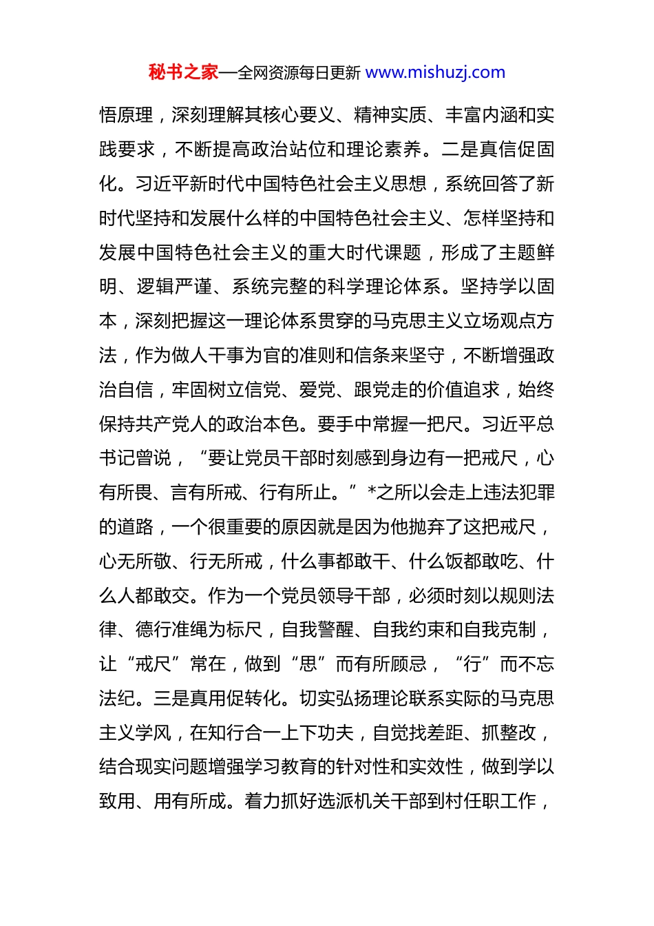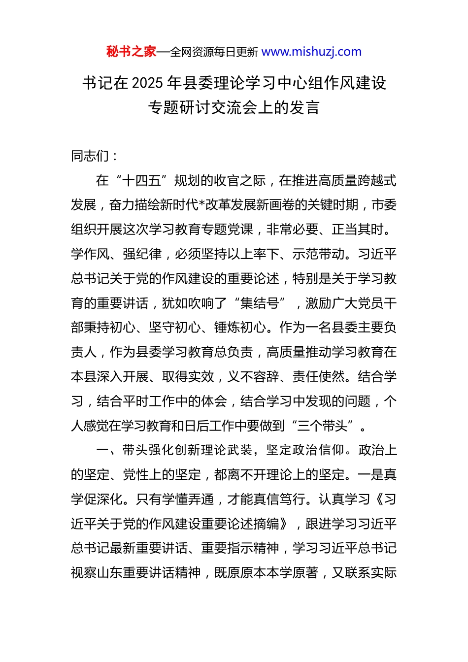 秘书之家—全网资源每日更新 www.mishuzj.com书记在 2025 年县委理论学习中心组作风建设专题研讨交流会上的发言 同志们:在“十四五”规划的收官之际,在推进高质量跨越式发展,奋力描绘新时代*改革发展新画卷的关键时期,市委组织开展这次学习教育专题党课,非常必要、正当其时。学作风、强纪律,必须坚持以上率下、示范带动。习近平总书记关于党的作风建设的重要论述,特别是关于学习教育的重要讲话,犹如吹响了“集结号”,激励广大党员干部秉持初心、坚守初心、锤炼初心。作为一名县委主要负责人,作为县委学习教育总负责,高质量推动学习教育在本县深入开展、取得实效,义不容辞、责任使然。结合学习,结合平时工作中的体会,结合学习中发现的问题,个人感觉在学习教育和日后工作中要做到“三个带头”。一、带头强化创新理论武装,坚定政治信仰。政治上的坚定、党性上的坚定,都离不开理论上的坚定。一是真学促深化。只有学懂弄通,才能真信笃行。认真学习《习近平关于党的作风建设重要论述摘编》,跟进学习习近平总书记最新重要讲话、重要指示精神,学习习近平总书记视察山东重要讲话精神,既原原本本学原著,又联系实际秘书之家—全网资源每日更新 www.mishuzj.com悟原理,深刻理解其核心要义、精神实质、丰富内涵和实践要求,不断提高政治站位和理论素养。二是真信促固化。习近平新时代中国特色社会主义思想,系统回答了新时代坚持和发展什么样的中国特色社会主义、怎样坚持和发展中国特色社会主义的重大时代课题,形成了主题鲜明、逻辑严谨、系统完整的科学理论体系。坚持学以固本,深刻把握这一理论体系贯穿的马克思主义立场观点方法,作为做人干事为官的准则和信条来坚守,不断增强政治自信,牢固树立信党、爱党、跟党走的价值追求,始终保持共产党人的政治本色。要手中常握一把尺。习近平总书记曾说,“要让党员干部时刻感到身边有一把戒尺,心有所畏、言有所戒、行有所止。”*之所以会走上违法犯罪的道路,一个很重要的原因就是因为他抛弃了这把戒尺,心无所敬、行无所戒,什么事都敢干、什么饭都敢吃、什么人都敢交。作为一个党员领导干部,必须时刻以规则法律、德行准绳为标尺,自我警醒、自我约束和自我克制,让“戒尺”常在,做到“思”而有所顾忌,“行”而不忘法纪。三是真用促转化。切实弘扬理论联系实际的马克思主义学风,在知行合一上下功夫,自觉找差距、抓整改,结合现实问题增强学习教育的针对性和实效性,做到学以致用、用有所成。着力抓好选派机关干部到村任职工作,秘书之家—全网资源每日更新 www.mishuzj.com指导村级党组织推行“四议两公开”工作法,着力提高村级民主管理的科学化、制度化、规范化水平;要灵活发挥党员干部示范、引领作用,妥善处理和解决好新时期人民内部矛盾,维护农村社会和谐稳定。要通过“践诺解忧”活动,把包扶基层党组织建设成为“推动发展、服务群众、凝聚人心、促进和谐”的坚强战斗堡垒,把基层党组织书记培养成为“守信念、讲奉献、有本领、重品行”的带头人,把广大党员干部锻造成为引领群众创业致富的贴心人。二、带头领导加强党的建设,扛起政治责任。抓好党建是本职、不抓党建是失职、抓不好党建是不称职。自己作为县委主要负责人,要坚决扛起主责、抓好主业、当好主角,争做“党建专家”。一是稳住安身立命的“压舱石”。在所有党的纪律中,政治纪律和政治规矩是最重要、最根本的。把严格遵守政治纪律和政治规矩作为安身立命的“压舱石”,培养和树立执行高于一切的意识和态度,自觉尊崇党章、严格执行新形势下党内政治生活若干准则,严格落实“五个必须”要求,在思想上政治上行动上同党中央和省、市委保持高度一致,不讲条件地执行每一项部署,不打折扣地落实好每一项工作。二是增强敢于斗争的“精气神”。习近平总书记强调,我们比历史上任秘书之家—全网资源每日更新 www.mishuzj.com何时期都更接近、更有信心和能力实现中华民族伟大复兴的目标。这意味着我们到了最艰巨的攻坚阶段,不可避免地会遇到许多重大挑战、重大风险、重大阻力、重大矛盾。必须坚持制度治党、依规治党.进一步深化党的建设制度...