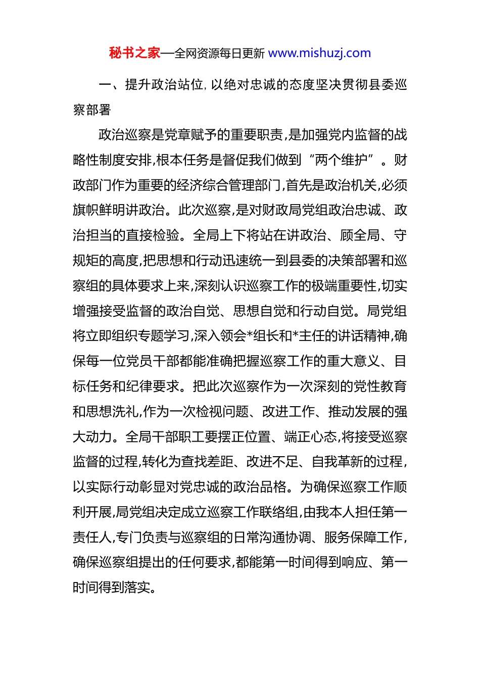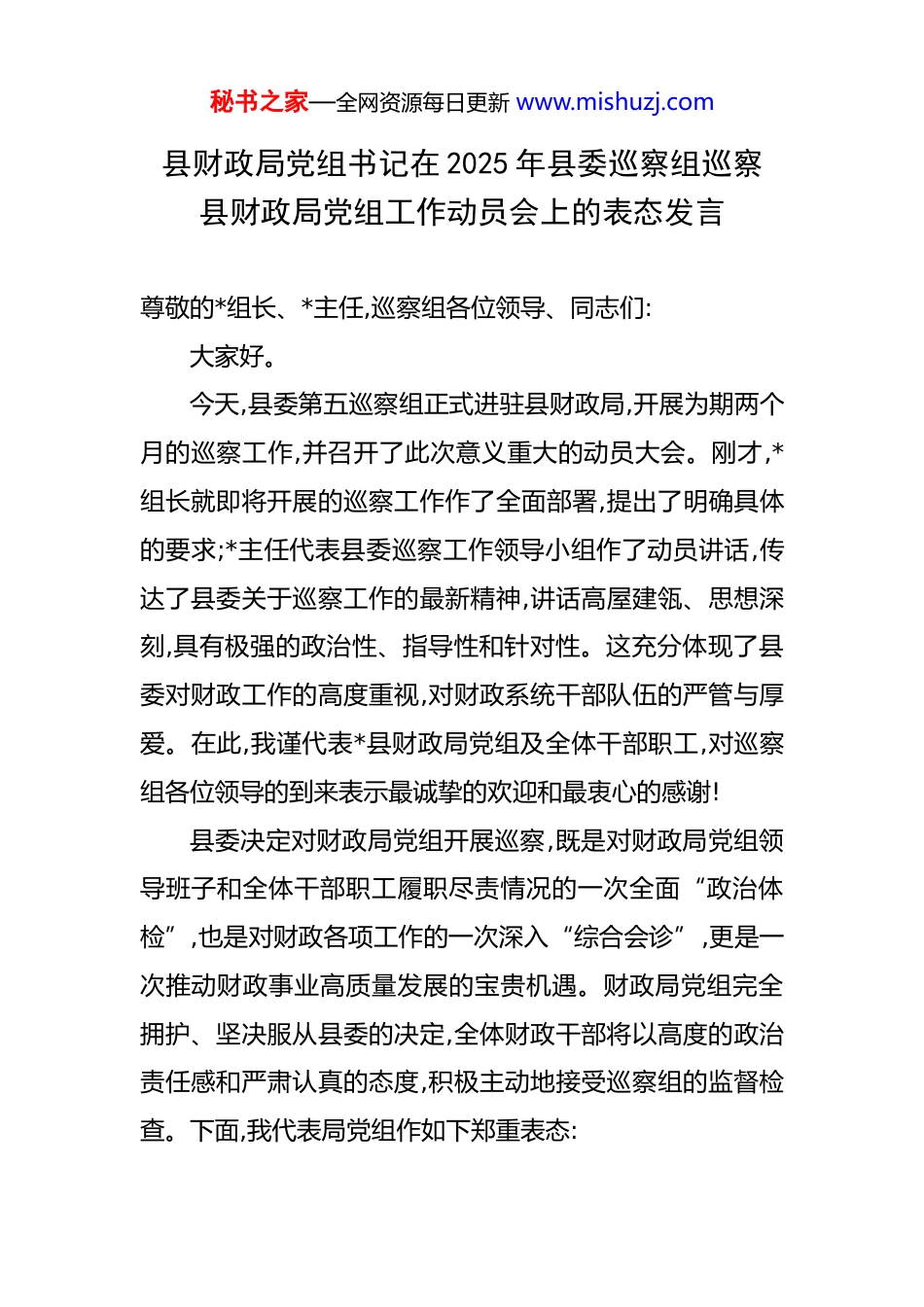 秘书之家—全网资源每日更新 www.mishuzj.com县财政局党组书记在 2025 年县委巡察组巡察县财政局党组工作动员会上的表态发言 尊敬的*组长、*主任,巡察组各位领导、同志们:大家好。今天,县委第五巡察组正式进驻县财政局,开展为期两个月的巡察工作,并召开了此次意义重大的动员大会。刚才,*组长就即将开展的巡察工作作了全面部署,提出了明确具体的要求;*主任代表县委巡察工作领导小组作了动员讲话,传达了县委关于巡察工作的最新精神,讲话高屋建瓴、思想深刻,具有极强的政治性、指导性和针对性。这充分体现了县委对财政工作的高度重视,对财政系统干部队伍的严管与厚爱。在此,我谨代表*县财政局党组及全体干部职工,对巡察组各位领导的到来表示最诚挚的欢迎和最衷心的感谢!县委决定对财政局党组开展巡察,既是对财政局党组领导班子和全体干部职工履职尽责情况的一次全面“政治体检”,也是对财政各项工作的一次深入“综合会诊”,更是一次推动财政事业高质量发展的宝贵机遇。财政局党组完全拥护、坚决服从县委的决定,全体财政干部将以高度的政治责任感和严肃认真的态度,积极主动地接受巡察组的监督检查。下面,我代表局党组作如下郑重表态:秘书之家—全网资源每日更新 www.mishuzj.com一、提升政治站位,以绝对忠诚的态度坚决贯彻县委巡察部署政治巡察是党章赋予的重要职责,是加强党内监督的战略性制度安排,根本任务是督促我们做到“两个维护”。财政部门作为重要的经济综合管理部门,首先是政治机关,必须旗帜鲜明讲政治。此次巡察,是对财政局党组政治忠诚、政治担当的直接检验。全局上下将站在讲政治、顾全局、守规矩的高度,把思想和行动迅速统一到县委的决策部署和巡察组的具体要求上来,深刻认识巡察工作的极端重要性,切实增强接受监督的政治自觉、思想自觉和行动自觉。局党组将立即组织专题学习,深入领会*组长和*主任的讲话精神,确保每一位党员干部都能准确把握巡察工作的重大意义、目标任务和纪律要求。把此次巡察作为一次深刻的党性教育和思想洗礼,作为一次检视问题、改进工作、推动发展的强大动力。全局干部职工要摆正位置、端正心态,将接受巡察监督的过程,转化为查找差距、改进不足、自我革新的过程,以实际行动彰显对党忠诚的政治品格。为确保巡察工作顺利开展,局党组决定成立巡察工作联络组,由我本人担任第一责任人,专门负责与巡察组的日常沟通协调、服务保障工作,确保巡察组提出的任何要求,都能第一时间得到响应、第一时间得到落实。秘书之家—全网资源每日更新 www.mishuzj.com二、严守纪律规矩,以实事求是的作风全力支持配合巡察工作支持配合巡察组开展工作,是我们的政治责任和应尽义务。财政局党组及全体干部职工将严格遵守巡察工作的各项纪律规定,全力为巡察组开展工作创造最优良的环境和最便利的条件。一是坚持信息畅通,做到汇报工作不遮不掩。凡是巡察组要求了解的情况,必将详尽客观地汇报;凡是巡察组需要调阅的资料,包括各类会议记录、财务账目、项目档案、工作台账等,必将毫无保留、及时准确地提供。确保巡察组能够全面、真实、深入地了解财政局党组在党的领导、党的建设、全面从严治党以及党风廉政建设和反腐败斗争等方面的实际情况。二是坚持服务保障,做到协调联络周到细致。将严格按照巡察组的要求,妥善安排个别谈话、座谈访谈、实地调研等各项活动。局办公室、人事、财务等相关股室将指定专人负责,全力做好后勤保障,合理安排工作场所,确保巡察组能够心无旁骛、高效顺畅地开展工作。三是坚持纪律严明,做到接受监督诚恳主动。全局干部职工,特别是领导班子成员,要以身作则,带头学习领会巡察工作纪律,带头查摆自身问题,带头如实向巡察组反映情况。严禁任何人以任何形式、任何理由干扰、阻挠巡察工作的正常进行。对于巡察组指出的问题、提出的意见,要虚心倾听、认秘书之家—全网资源每日更新 www.mishuzj.com真记录,绝不回避、绝不推诿。三、强化问题导向,以动真碰硬的决心坚决抓好问题整改落实巡察的根本目的在于发现问题、解决问题,推动工作。财政局党组将牢固树立“有问题不是坏事,有问题不改才是大事”的观念,把发现问题、剖析问题、整改问题作为贯穿巡察全过程的核...