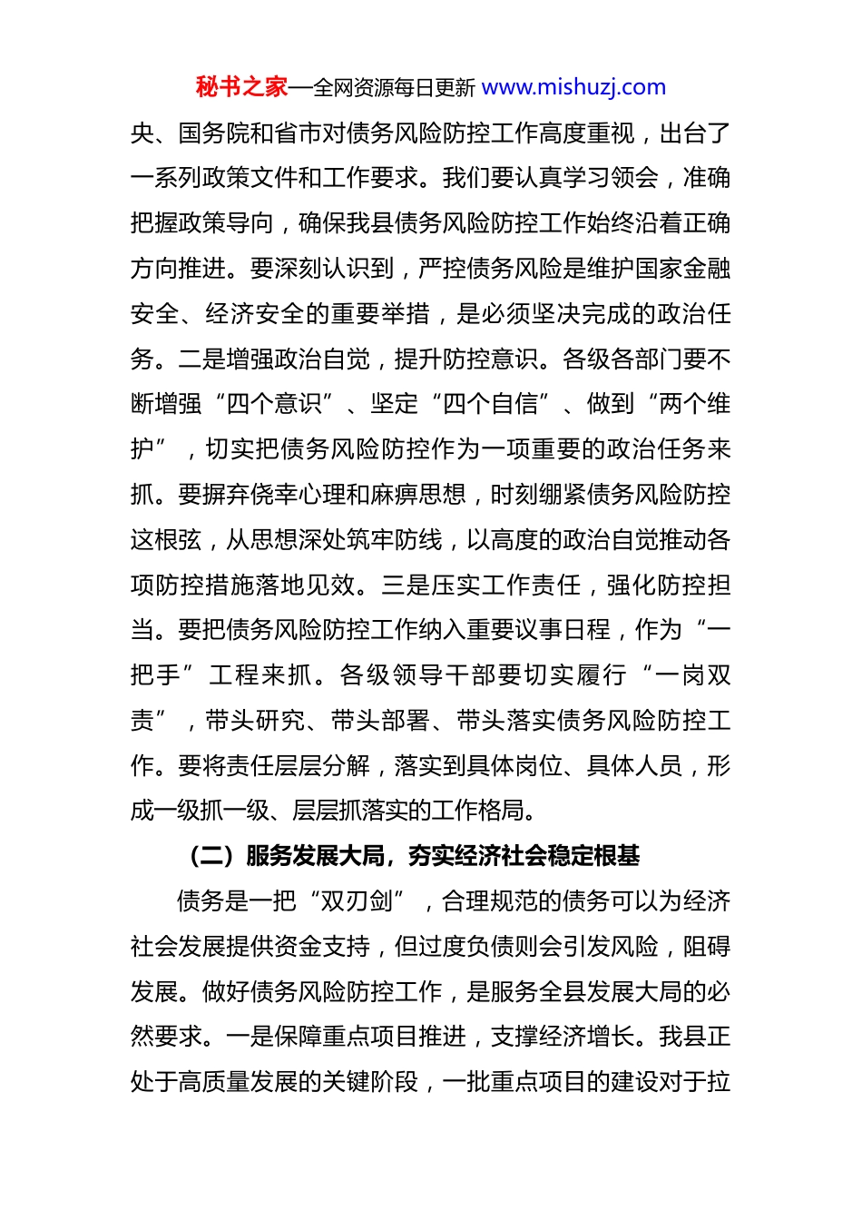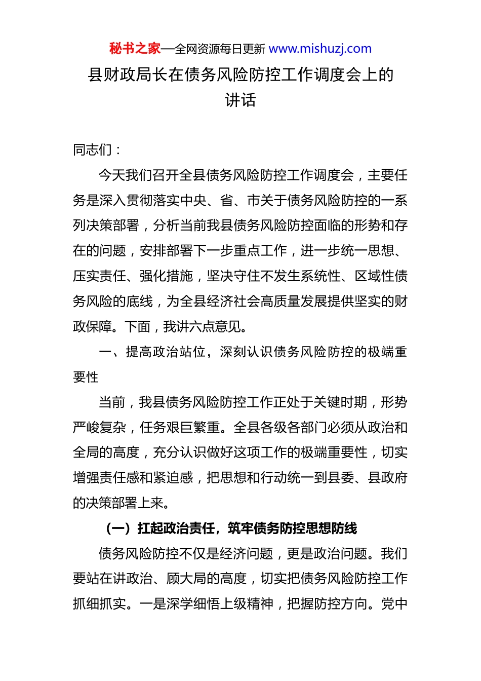 秘书之家—全网资源每日更新 www.mishuzj.com县财政局长在债务风险防控工作调度会上的讲话 同志们:今天我们召开全县债务风险防控工作调度会,主要任务是深入贯彻落实中央、省、市关于债务风险防控的一系列决策部署,分析当前我县债务风险防控面临的形势和存在的问题,安排部署下一步重点工作,进一步统一思想、压实责任、强化措施,坚决守住不发生系统性、区域性债务风险的底线,为全县经济社会高质量发展提供坚实的财政保障。下面,我讲六点意见。一、提高政治站位,深刻认识债务风险防控的极端重要性当前,我县债务风险防控工作正处于关键时期,形势严峻复杂,任务艰巨繁重。全县各级各部门必须从政治和全局的高度,充分认识做好这项工作的极端重要性,切实增强责任感和紧迫感,把思想和行动统一到县委、县政府的决策部署上来。(一)扛起政治责任,筑牢债务防控思想防线债务风险防控不仅是经济问题,更是政治问题。我们要站在讲政治、顾大局的高度,切实把债务风险防控工作抓细抓实。一是深学细悟上级精神,把握防控方向。党中秘书之家—全网资源每日更新 www.mishuzj.com央、国务院和省市对债务风险防控工作高度重视,出台了一系列政策文件和工作要求。我们要认真学习领会,准确把握政策导向,确保我县债务风险防控工作始终沿着正确方向推进。要深刻认识到,严控债务风险是维护国家金融安全、经济安全的重要举措,是必须坚决完成的政治任务。二是增强政治自觉,提升防控意识。各级各部门要不断增强“四个意识”、坚定“四个自信”、做到“两个维护”,切实把债务风险防控作为一项重要的政治任务来抓。要摒弃侥幸心理和麻痹思想,时刻绷紧债务风险防控这根弦,从思想深处筑牢防线,以高度的政治自觉推动各项防控措施落地见效。三是压实工作责任,强化防控担当。要把债务风险防控工作纳入重要议事日程,作为“一把手”工程来抓。各级领导干部要切实履行“一岗双责”,带头研究、带头部署、带头落实债务风险防控工作。要将责任层层分解,落实到具体岗位、具体人员,形成一级抓一级、层层抓落实的工作格局。(二)服务发展大局,夯实经济社会稳定根基债务是一把“双刃剑”,合理规范的债务可以为经济社会发展提供资金支持,但过度负债则会引发风险,阻碍发展。做好债务风险防控工作,是服务全县发展大局的必然要求。一是保障重点项目推进,支撑经济增长。我县正处于高质量发展的关键阶段,一批重点项目的建设对于拉秘书之家—全网资源每日更新 www.mishuzj.com动经济增长、改善基础设施条件具有重要意义。通过有效的债务风险防控,可以合理调配资金,确保重点项目顺利推进,为经济持续健康发展注入动力。要优先保障产业升级、基础设施补短板等重点领域项目的资金需求,避免因资金问题影响项目进度。二是优化资源配置效率,提升发展质量。债务风险防控不是简单地压缩债务规模,而是要通过科学管理,优化债务资金的投向和结构,提高资金使用效益。要引导债务资金向回报率高、社会效益好的领域倾斜,避免盲目投资和重复建设,促进资源优化配置,推动全县经济发展质量不断提升。三是营造良好发展环境,吸引外来投资。一个地区的债务风险状况直接影响其发展环境和投资吸引力。如果债务风险过高,会导致金融机构谨慎放贷,投资者望而却步。做好债务风险防控工作,保持合理的债务水平,能够营造稳定、健康的发展环境,增强外来投资者的信心,为全县招商引资工作创造有利条件。(三)坚守民生底线,保障群众根本利益实现财政资金取之于民、用之于民,债务资金的使用和管理与群众的切身利益息息相关。做好债务风险防控工作,是坚守民生底线、保障群众根本利益的重要举措。一是确保民生资金到位,改善群众生活。教育、医疗、养老、住房等民生领域的支出是群众最关心、最直接、最现实的利秘书之家—全网资源每日更新 www.mishuzj.com益问题。通过债务风险防控,合理安排债务资金,确保民生领域资金及时足额到位,能够不断改善群众的生活条件,提高群众的幸福感和获得感。要优先保障民生支出,坚决杜绝因债务问题挤占挪用民生资金。二是维护社会稳定和谐,提升群众安全感。债务风险一旦爆...