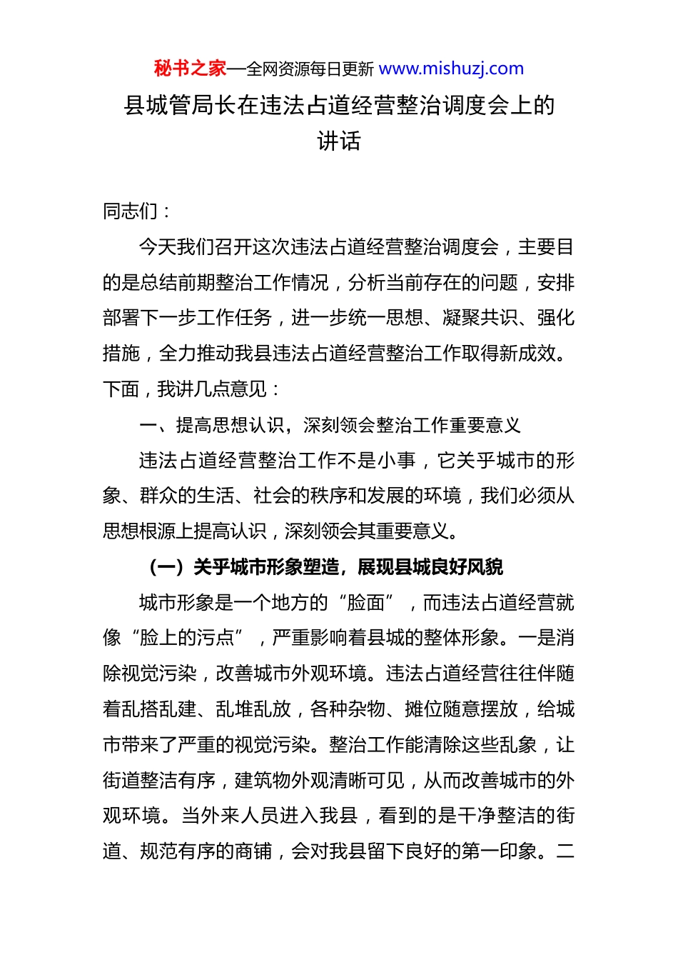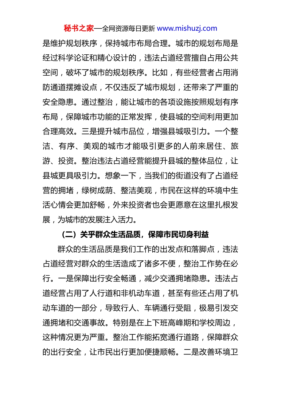 秘书之家—全网资源每日更新 www.mishuzj.com县城管局长在违法占道经营整治调度会上的讲话 同志们:今天我们召开这次违法占道经营整治调度会,主要目的是总结前期整治工作情况,分析当前存在的问题,安排部署下一步工作任务,进一步统一思想、凝聚共识、强化措施,全力推动我县违法占道经营整治工作取得新成效。下面,我讲几点意见:一、提高思想认识,深刻领会整治工作重要意义违法占道经营整治工作不是小事,它关乎城市的形象、群众的生活、社会的秩序和发展的环境,我们必须从思想根源上提高认识,深刻领会其重要意义。(一)关乎城市形象塑造,展现县城良好风貌城市形象是一个地方的“脸面”,而违法占道经营就像“脸上的污点”,严重影响着县城的整体形象。一是消除视觉污染,改善城市外观环境。违法占道经营往往伴随着乱搭乱建、乱堆乱放,各种杂物、摊位随意摆放,给城市带来了严重的视觉污染。整治工作能清除这些乱象,让街道整洁有序,建筑物外观清晰可见,从而改善城市的外观环境。当外来人员进入我县,看到的是干净整洁的街道、规范有序的商铺,会对我县留下良好的第一印象。二秘书之家—全网资源每日更新 www.mishuzj.com是维护规划秩序,保持城市布局合理。城市的规划布局是经过科学论证和精心设计的,违法占道经营擅自占用公共空间,破坏了城市的规划秩序。比如,有些经营者占用消防通道摆摊设点,不仅违反了城市规划,还带来了严重的安全隐患。通过整治,能让城市的各项设施按照规划有序布局,保障城市功能的正常发挥,使县城的空间利用更加合理高效。三是提升城市品位,增强县城吸引力。一个整洁、有序、美观的城市才能吸引更多的人前来居住、旅游、投资。整治违法占道经营能提升县城的整体品位,让县城更具吸引力。想象一下,当我们的街道没有了占道经营的拥堵,绿树成荫、整洁美观,市民在这样的环境中生活心情会更加舒畅,外来投资者也会更愿意在这里扎根发展,为城市的发展注入活力。(二)关乎群众生活品质,保障市民切身利益群众的生活品质是我们工作的出发点和落脚点,违法占道经营对群众的生活造成了诸多不便,整治工作势在必行。一是保障出行安全畅通,减少交通拥堵隐患。违法占道经营占用了人行道和非机动车道,甚至有些还占用了机动车道的一部分,导致行人、车辆通行受阻,极易引发交通拥堵和交通事故。特别是在上下班高峰期和学校周边,这种情况更为严重。整治工作能拓宽通行道路,保障群众的出行安全,让市民出行更加便捷顺畅。二是改善环境卫秘书之家—全网资源每日更新 www.mishuzj.com生状况,减少疾病传播风险。占道经营的摊点往往会产生大量的垃圾,而且这些垃圾得不到及时清理,不仅影响了街道的整洁,还容易滋生细菌、病毒,增加了疾病传播的风险。比如,一些小吃摊点产生的油污、废弃物,对周边环境造成了严重污染。通过整治,能及时清理这些垃圾,改善环境卫生状况,为群众创造一个健康的生活环境。三是规范市场经营秩序,维护消费者权益。一些违法占道经营的商家没有营业执照和卫生许可证,所销售的商品质量无法得到保障,很容易出现假冒伪劣、过期变质等问题,损害消费者的合法权益。整治工作能规范市场经营秩序,将这些不规范的摊点纳入正规管理,让群众能够放心消费,维护消费者的切身利益。四是营造安静生活环境,降低噪音污染影响。很多占道经营的摊点为了吸引顾客,会使用高音喇叭进行宣传,尤其是在居民区周边,严重影响了居民的正常休息和生活。整治工作能制止这种噪音污染行为,为群众营造一个安静、舒适的生活环境,提高群众的生活满意度。(三)关乎社会秩序稳定,维护公共空间秩序公共空间是全体市民共同享有的资源,违法占道经营擅自占用公共空间,破坏了社会秩序的稳定,必须加以整治。一是维护公共空间公平,保障市民平等使用权。公共空间属于全体市民,任何个人和单位都不能擅自占用。违秘书之家—全网资源每日更新 www.mishuzj.com法占道经营的经营者通过占用公共空间获取利益,侵犯了其他市民平等使用公共空间的权利。整治工作能收回被占用的公共空间,让全体市民都能平等地享受公共空间带来的便利,维护社会的公平...