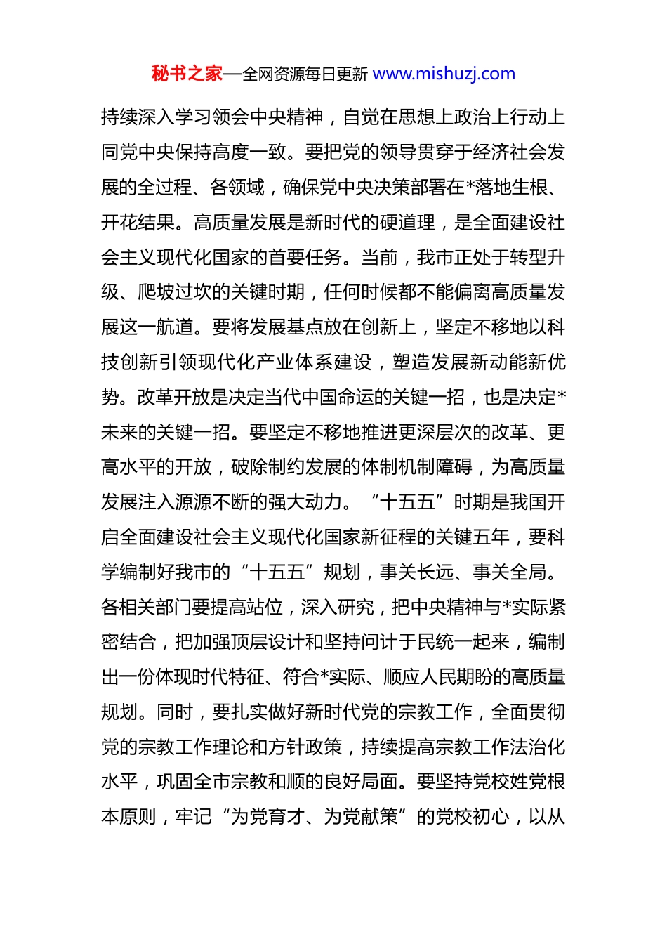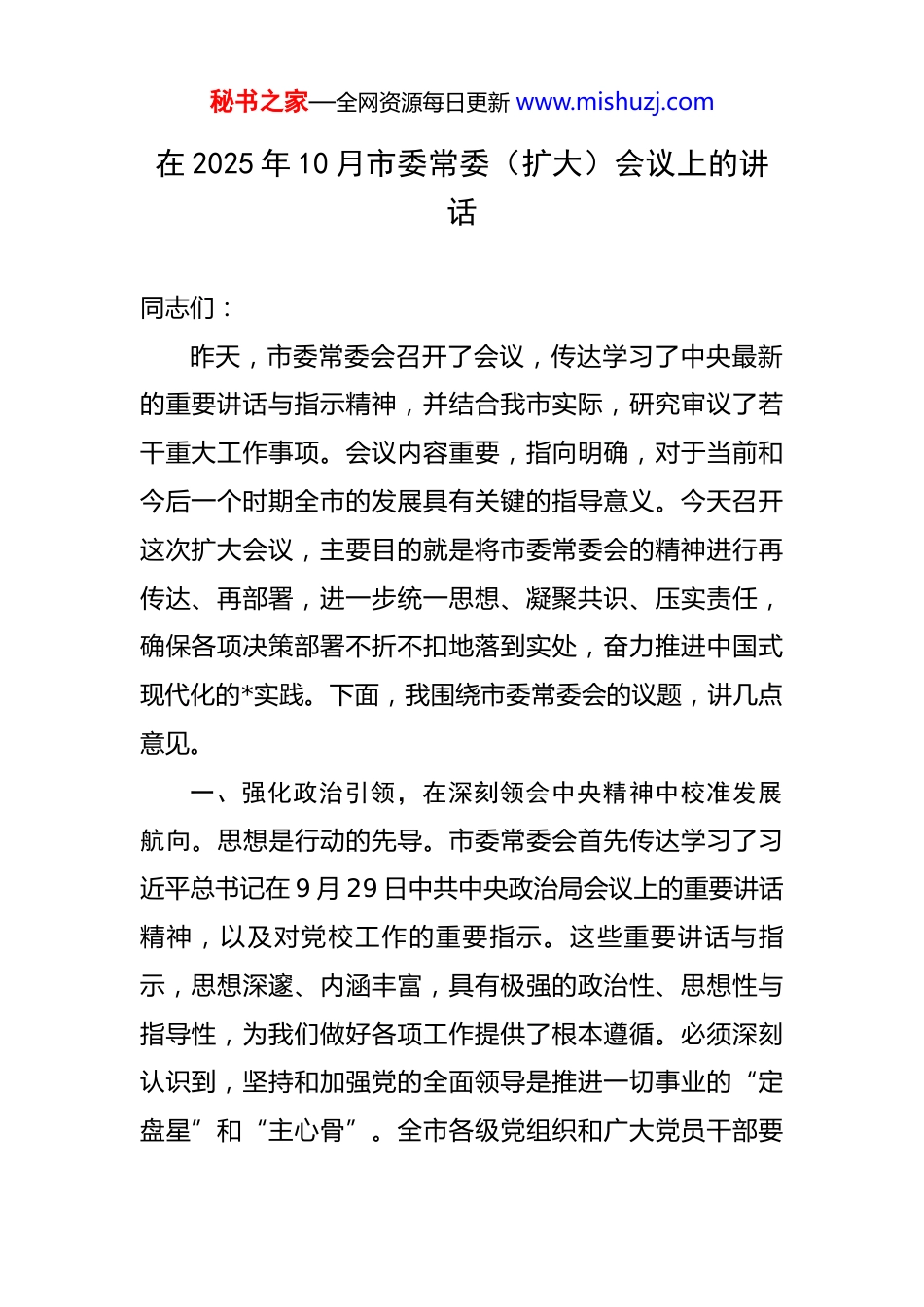 秘书之家—全网资源每日更新 www.mishuzj.com在 2025 年 10 月市委常委(扩大)会议上的讲话 同志们:昨天,市委常委会召开了会议,传达学习了中央最新的重要讲话与指示精神,并结合我市实际,研究审议了若干重大工作事项。会议内容重要,指向明确,对于当前和今后一个时期全市的发展具有关键的指导意义。今天召开这次扩大会议,主要目的就是将市委常委会的精神进行再传达、再部署,进一步统一思想、凝聚共识、压实责任,确保各项决策部署不折不扣地落到实处,奋力推进中国式现代化的*实践。下面,我围绕市委常委会的议题,讲几点意见。一、强化政治引领,在深刻领会中央精神中校准发展航向。思想是行动的先导。市委常委会首先传达学习了习近平总书记在 9 月 29 日中共中央政治局会议上的重要讲话精神,以及对党校工作的重要指示。这些重要讲话与指示,思想深邃、内涵丰富,具有极强的政治性、思想性与指导性,为我们做好各项工作提供了根本遵循。必须深刻认识到,坚持和加强党的全面领导是推进一切事业的“定盘星”和“主心骨”。全市各级党组织和广大党员干部要秘书之家—全网资源每日更新 www.mishuzj.com持续深入学习领会中央精神,自觉在思想上政治上行动上同党中央保持高度一致。要把党的领导贯穿于经济社会发展的全过程、各领域,确保党中央决策部署在*落地生根、开花结果。高质量发展是新时代的硬道理,是全面建设社会主义现代化国家的首要任务。当前,我市正处于转型升级、爬坡过坎的关键时期,任何时候都不能偏离高质量发展这一航道。要将发展基点放在创新上,坚定不移地以科技创新引领现代化产业体系建设,塑造发展新动能新优势。改革开放是决定当代中国命运的关键一招,也是决定*未来的关键一招。要坚定不移地推进更深层次的改革、更高水平的开放,破除制约发展的体制机制障碍,为高质量发展注入源源不断的强大动力。“十五五”时期是我国开启全面建设社会主义现代化国家新征程的关键五年,要科学编制好我市的“十五五”规划,事关长远、事关全局。各相关部门要提高站位,深入研究,把中央精神与*实际紧密结合,把加强顶层设计和坚持问计于民统一起来,编制出一份体现时代特征、符合*实际、顺应人民期盼的高质量规划。同时,要扎实做好新时代党的宗教工作,全面贯彻党的宗教工作理论和方针政策,持续提高宗教工作法治化水平,巩固全市宗教和顺的良好局面。要坚持党校姓党根本原则,牢记“为党育才、为党献策”的党校初心,以从秘书之家—全网资源每日更新 www.mishuzj.com严治校、质量立校为抓手,全面提升办学治校水平,为*发展培养更多忠诚干净担当的高素质干部队伍。二、聚焦实体经济,在构建现代化产业体系上实现新突破。经济是发展的根基,实体经济是根基中的根基。昨天会议听取了近期经济运行情况的汇报,总体来看,势头是好的,但压力依然不小。确保完成全年目标任务,关键在于抓好实体经济,尤其是制造业这个“顶梁柱”。回顾过 去 一 年 的 发 展 , 我 市 经 济 展 现 出 强 大 的 韧 性 与 活力。2024 年,全市地区生产总值达到了 1.67 万亿元,三次产业结构持续优化,调整为 3:34.2:62.8,服务业的主引 擎 作 用 更 加 凸 显 , 但 工 业 的 压 舱 石 地 位 绝 不 能 动摇。2024 年,全市工业增加值增长 7.7%,其中规模以上工业增加值更是实现了 9.4%的较快增长,这个成绩来之不易。进入 2025 年,我市经济延续了稳中向好的发展态势,根据初步统计,一季度规模以上工业增加值同比增长8.7%,这为我们完成全年目标打下了坚实基础。成绩面前要保持清醒,更要看到结构性问题。发展的关键在于向创新要动力,向结构优化要效益。要坚定不移地推进新型工业化,以科技创新推动产业创新。2024 年,我市高技术制造业增加值增长了 12.8%,占规模以上工业增加值的比重达到 12.1%,装备制造业增加值也增长了 11.0%。这些数秘书之家—全网资源每日更新 www.mishuzj.com据说明,我市的创新驱动发展战略已经初见成效,新质生产力正在加速形成。下一步,要继续加大对战略性新兴产业和未来产业的布局与...