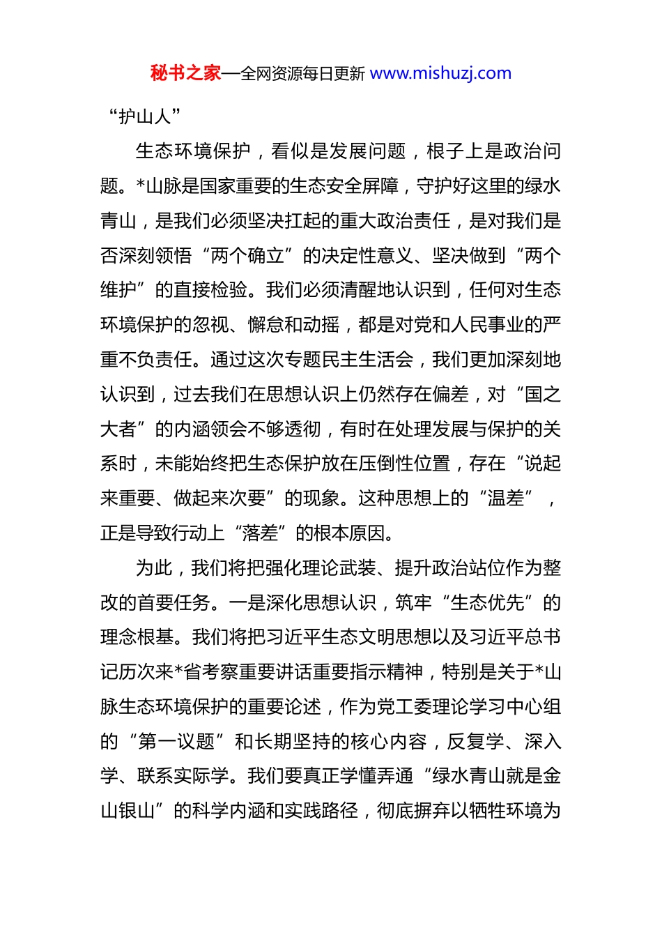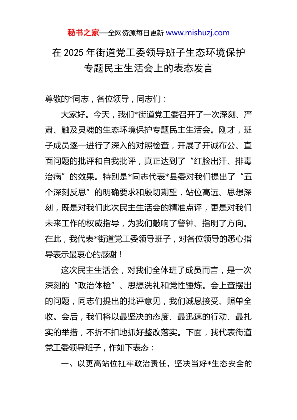 秘书之家—全网资源每日更新 www.mishuzj.com在 2025 年街道党工委领导班子生态环境保护专题民主生活会上的表态发言 尊敬的*同志,各位领导,同志们:大家好。今天,我们*街道党工委召开了一次深刻、严肃、触及灵魂的生态环境保护专题民主生活会。刚才,班子成员逐一进行了深入的对照检查,开展了开诚布公、直面问题的批评和自我批评,真正达到了“红脸出汗、排毒治病”的效果。特别是*同志代表*县委对我们提出了“五个深刻反思”的明确要求和殷切期望,站位高远、思想深刻,既是对我们此次民主生活会的精准点评,更是对我们未来工作的权威指导,为我们敲响了警钟、指明了方向。在此,我代表*街道党工委领导班子,对各位领导的悉心指导表示最衷心的感谢!这次民主生活会,对我们全体班子成员而言,是一次深刻的“政治体检”、思想洗礼和党性锤炼。会上查摆出的问题,同志们提出的批评意见,我们诚恳接受、照单全收。会后,我们将以最坚决的态度、最迅速的行动、最扎实的举措,不折不扣地抓好整改落实。下面,我代表街道党工委领导班子,作如下表态:一、以更高站位扛牢政治责任,坚决当好*生态安全的秘书之家—全网资源每日更新 www.mishuzj.com“护山人”生态环境保护,看似是发展问题,根子上是政治问题。*山脉是国家重要的生态安全屏障,守护好这里的绿水青山,是我们必须坚决扛起的重大政治责任,是对我们是否深刻领悟“两个确立”的决定性意义、坚决做到“两个维护”的直接检验。我们必须清醒地认识到,任何对生态环境保护的忽视、懈怠和动摇,都是对党和人民事业的严重不负责任。通过这次专题民主生活会,我们更加深刻地认识到,过去我们在思想认识上仍然存在偏差,对“国之大者”的内涵领会不够透彻,有时在处理发展与保护的关系时,未能始终把生态保护放在压倒性位置,存在“说起来重要、做起来次要”的现象。这种思想上的“温差”,正是导致行动上“落差”的根本原因。为此,我们将把强化理论武装、提升政治站位作为整改的首要任务。一是深化思想认识,筑牢“生态优先”的理念根基。我们将把习近平生态文明思想以及习近平总书记历次来*省考察重要讲话重要指示精神,特别是关于*山脉生态环境保护的重要论述,作为党工委理论学习中心组的“第一议题”和长期坚持的核心内容,反复学、深入学、联系实际学。我们要真正学懂弄通“绿水青山就是金山银山”的科学内涵和实践路径,彻底摒弃以牺牲环境为秘书之家—全网资源每日更新 www.mishuzj.com代价换取一时经济增长的错误观念,牢固树立正确的政绩观,确保街道一切工作部署和发展决策都以不破坏生态环境为前提,让绿色发展理念内化于心、外化于行。二是强化政治担当,扛起“守土有责”的时代使命。我们将坚决贯彻落实上级党委关于生态环境保护的各项决策部署,特别是*同志今天传达的*县委五点要求,确保政令畅通、令行禁止。班子成员将带头履行“党政同责、‘一岗双责’”,把生态环境保护责任压实到每个岗位、每个环节、每个人头。我们将建立健全生态环境保护责任清单,定期听取分管领域生态环保工作汇报,将生态文明建设成效作为评价干部能力、衡量工作实绩的“硬杠杠”,形成一级抓一级、层层抓落实的严密责任体系,坚决杜绝推诿扯皮、失职渎职现象。三是保持敬畏之心,守住“不可逾越”的生态红线。*山脉的生态环境具有国家代表性和全球意义,其保护的极端重要性不言而喻。我们将始终心怀对自然的敬畏、对历史的敬畏、对未来的敬畏,严格执行《*省*山脉生态环境保护条例》等法律法规,以最坚决的态度向一切破坏生态环境的行为作斗争。我们将把生态保护红线、环境质量底线、资源利用上线作为高压线,任何项目、任何活动,一旦触碰,坚决一票否决,绝不姑息,确保*街道的每一寸土地都在严格的生态保护制度下得到有效秘书之家—全网资源每日更新 www.mishuzj.com呵护。二、以更实举措推进问题整改,奋力绘就*绿水青山“新画卷”知耻而后勇,知不足而奋进。对于这次民主生活会上查摆出的问题,无论是班子集体的,还是个人身上的,我们都将以钉钉子精神,逐项分析、逐条研究,制定详尽的整改方案,确保问题整改见底清零。...