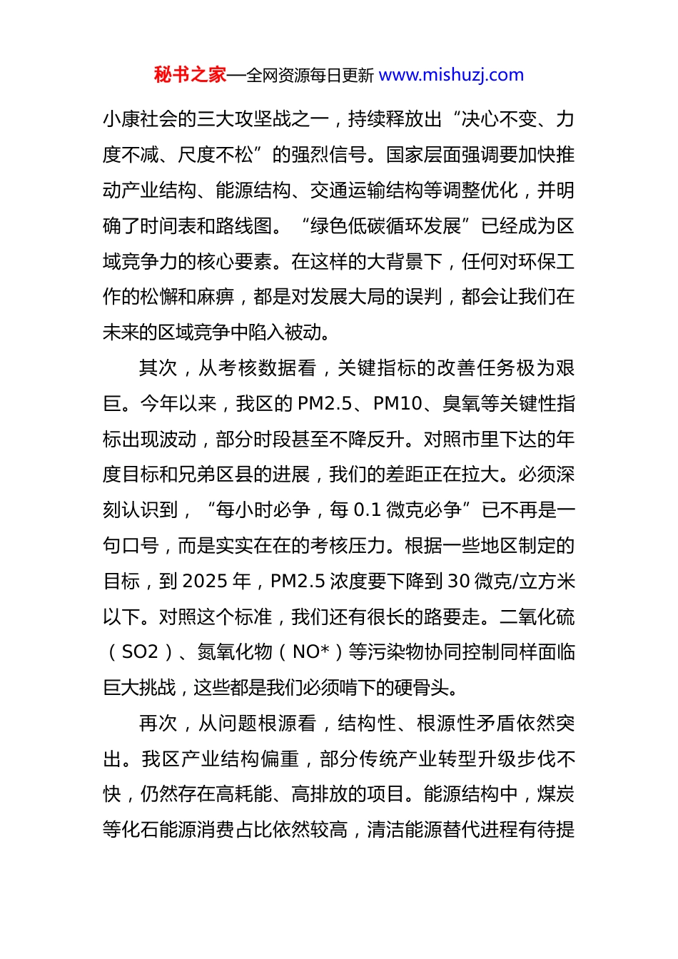 秘书之家—全网资源每日更新 www.mishuzj.com在 2025 年全区环境质量攻坚提升行动动员部署大会上的讲话 同志们:今天,区委、区政府在这里召开全区环境质量攻坚提升行动动员部署大会,主要任务是深入分析当前我区生态环境面临的严峻形势,全面部署下一阶段的大气污染防治攻坚任务。刚才,相关部门和镇街的负责同志作了很好的发言,态度坚决,措施具体,展现了打赢这场硬仗的决心和信心。下面,我讲三点意见。一、正视严峻形势,切实增强攻坚克难的责任感与紧迫感生态文明建设是关系人民福祉、关乎民族未来的长远大计。近年来,全区上下在生态环境保护方面做了大量工作,取得了一定成效,环境质量总体保持稳定。但是,必须清醒地看到,当前我区环境质量,特别是大气环境质量,与高质量发展的要求相比,与人民群众对美好生态环境的期盼相比,还存在相当大的差距。问题不容忽视,形势依然严峻。首先,从宏观形势看,生态环境保护的压力只增不减。党中央、国务院将污染防治攻坚战作为决胜全面建成秘书之家—全网资源每日更新 www.mishuzj.com小康社会的三大攻坚战之一,持续释放出“决心不变、力度不减、尺度不松”的强烈信号。国家层面强调要加快推动产业结构、能源结构、交通运输结构等调整优化,并明确了时间表和路线图。“绿色低碳循环发展”已经成为区域竞争力的核心要素。在这样的大背景下,任何对环保工作的松懈和麻痹,都是对发展大局的误判,都会让我们在未来的区域竞争中陷入被动。其次,从考核数据看,关键指标的改善任务极为艰巨。今年以来,我区的 PM2.5、PM10、臭氧等关键性指标出现波动,部分时段甚至不降反升。对照市里下达的年度目标和兄弟区县的进展,我们的差距正在拉大。必须深刻认识到,“每小时必争,每 0.1 微克必争”已不再是一句口号,而是实实在在的考核压力。根据一些地区制定的目标,到 2025 年,PM2.5 浓度要下降到 30 微克/立方米以下。对照这个标准,我们还有很长的路要走。二氧化硫(SO2)、氮氧化物(NO*)等污染物协同控制同样面临巨大挑战,这些都是我们必须啃下的硬骨头。再次,从问题根源看,结构性、根源性矛盾依然突出。我区产业结构偏重,部分传统产业转型升级步伐不快,仍然存在高耗能、高排放的项目。能源结构中,煤炭等化石能源消费占比依然较高,清洁能源替代进程有待提秘书之家—全网资源每日更新 www.mishuzj.com速。交通运输结构上,公路货运量大、柴油货车污染等问题长期存在,铁路和水路运输的潜力尚未充分挖掘。此外,建筑工地扬尘、城乡面源污染、餐饮油烟等问题屡禁不止,精细化管理水平亟待提升。这些问题相互交织,治理难度大,决定了我们的攻坚战必须是系统性、综合性的持久战。全区各级各部门必须牢固树立“抓生态建设就是抓高质量发展”的意识,深刻认识抓好治气工作的极端重要性和现实紧迫性。要把思想和行动统一到区委、区政府的决策部署上来,以“坐不住等不起、慢不得”的姿态,坚决扛起生态文明建设的政治责任,以壮士断腕的决心和背水一战的勇气,全力以赴打好这场大气污染防治的攻坚战。二、明确目标任务,聚焦重点领域打赢治气攻坚战打好攻坚战,必须有明确的“作战图”和精准的“弹药库”。此次攻坚行动的总体目标是:通过一年的集中攻坚,实现全区空气质量的根本性好转,确保各项关键指标达到市级考核要求,力争在全市排名中争先进位。为实现这一目标,必须紧盯重点领域,优化攻坚打法,实施靶向治疗。(一)锚定精准量化的攻坚目标。目标是行动的指南针,是引领我们前进的方向标。此次攻坚行动,不仅要有秘书之家—全网资源每日更新 www.mishuzj.com明确的定性要求,更要设定具体的定量指标,确保目标可衡量、可考核,从而为行动提供坚实的依据。在空气质量改善方面,我们设定了明确的目标:到 2026 年 9 月底,全区的 PM2.5 年均浓度要在 2025 年的基础上力争下降8%,并且稳定控制在 30 微克/立方米以下;同时,PM10浓度也要持续下降,确保空气质量得到显著改善。此外,空气质量优良天数比率力争达到 90%以上,彻底消除重污染天气,为广大市民创造一个更加清新、健康的生活环境。特别...