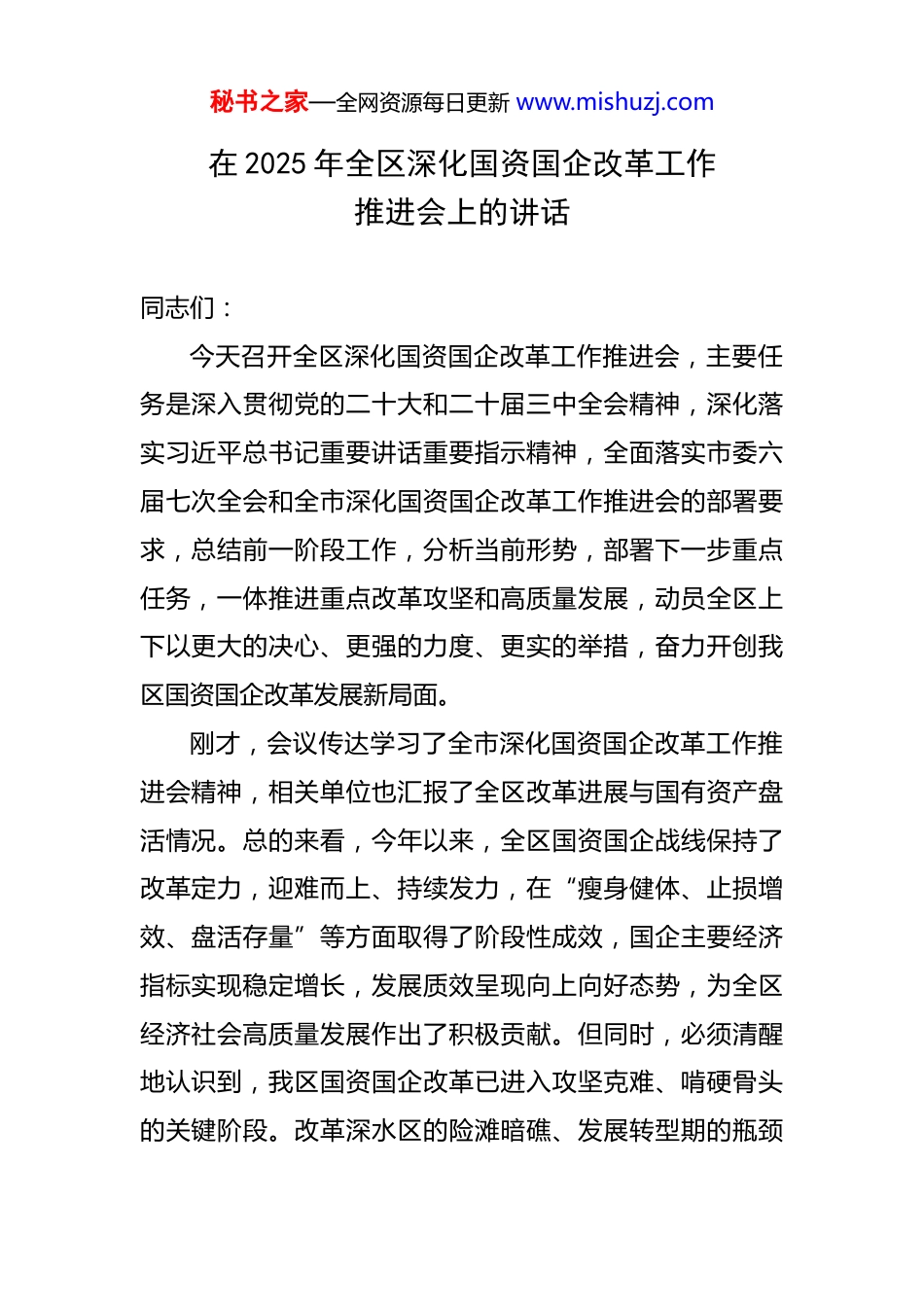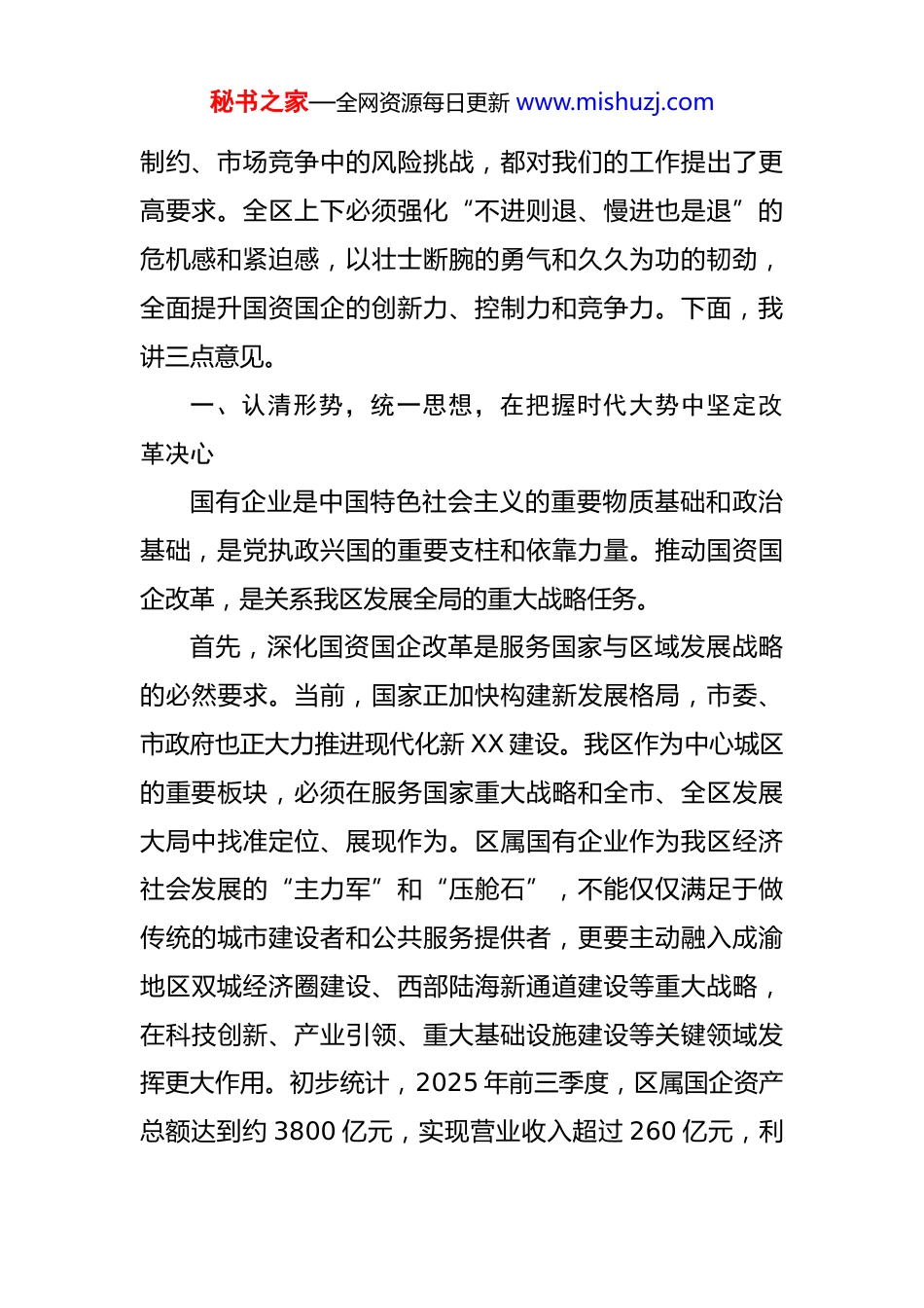秘书之家—全网资源每日更新 www.mishuzj.com在 2025 年全区深化国资国企改革工作推进会上的讲话 同志们:今天召开全区深化国资国企改革工作推进会,主要任务是深入贯彻党的二十大和二十届三中全会精神,深化落实习近平总书记重要讲话重要指示精神,全面落实市委六届七次全会和全市深化国资国企改革工作推进会的部署要求,总结前一阶段工作,分析当前形势,部署下一步重点任务,一体推进重点改革攻坚和高质量发展,动员全区上下以更大的决心、更强的力度、更实的举措,奋力开创我区国资国企改革发展新局面。刚才,会议传达学习了全市深化国资国企改革工作推进会精神,相关单位也汇报了全区改革进展与国有资产盘活情况。总的来看,今年以来,全区国资国企战线保持了改革定力,迎难而上、持续发力,在“瘦身健体、止损增效、盘活存量”等方面取得了阶段性成效,国企主要经济指标实现稳定增长,发展质效呈现向上向好态势,为全区经济社会高质量发展作出了积极贡献。但同时,必须清醒地认识到,我区国资国企改革已进入攻坚克难、啃硬骨头的关键阶段。改革深水区的险滩暗礁、发展转型期的瓶颈秘书之家—全网资源每日更新 www.mishuzj.com制约、市场竞争中的风险挑战,都对我们的工作提出了更高要求。全区上下必须强化“不进则退、慢进也是退”的危机感和紧迫感,以壮士断腕的勇气和久久为功的韧劲,全面提升国资国企的创新力、控制力和竞争力。下面,我讲三点意见。一、认清形势,统一思想,在把握时代大势中坚定改革决心国有企业是中国特色社会主义的重要物质基础和政治基础,是党执政兴国的重要支柱和依靠力量。推动国资国企改革,是关系我区发展全局的重大战略任务。首先,深化国资国企改革是服务国家与区域发展战略的必然要求。当前,国家正加快构建新发展格局,市委、市政府也正大力推进现代化新 XX 建设。我区作为中心城区的重要板块,必须在服务国家重大战略和全市、全区发展大局中找准定位、展现作为。区属国有企业作为我区经济社会发展的“主力军”和“压舱石”,不能仅仅满足于做传统的城市建设者和公共服务提供者,更要主动融入成渝地区双城经济圈建设、西部陆海新通道建设等重大战略,在科技创新、产业引领、重大基础设施建设等关键领域发挥更大作用。初步统计,2025 年前三季度,区属国企资产总额达到约 3800 亿元,实现营业收入超过 260 亿元,利秘书之家—全网资源每日更新 www.mishuzj.com润总额同比增长 8.2%。这些成绩来之不易,但与新形势新任务的要求相比,我们的国企在产业能级、创新能力、市场化水平上仍有不小差距。不深化改革,就无法有效承接重大战略任务;不加快转型,就难以在未来的区域竞争中抢占先机。其次,深化国资国企改革是应对激烈市场竞争的迫切需要。随着市场化改革的深入,政策性保护和区域性垄断正在逐步减弱,所有企业都被推向了统一、开放、竞争、有序的市场。我们的区属国企,长期以来习惯于在政府主导的框架内开展业务,市场意识、竞争意识、风险意识相对薄弱。一些企业主业不突出、核心竞争力不强的问题依然存在;一些企业法人治理结构不完善,“三重一大”决策制度执行不到位;一些企业历史包袱沉重,资产负债率依然偏高,持续“造血”能力不足。这些问题如果不能通过深化改革得到根本解决,我们的国有企业就可能在激烈的市场竞争中被边缘化,甚至被淘汰。必须通过改革,推动国有企业真正成为依法自主经营、自负盈亏、自担风险、自我约束、自我发展的独立市场主体。再次,深化国资国企改革是提升国有资产监管效能的内在要求。国有资产是全体人民的共同财富,确保其保值增值是国资监管部门和国有企业的共同责任。过去,我们秘书之家—全网资源每日更新 www.mishuzj.com的监管方式相对传统,存在“重审批、轻监管”“重事前、轻事后”等问题,监管的穿透性、及时性和有效性有待加强。进入数字时代,传统的监管模式已经难以适应现代企业快速多变的经营活动。例如,一些企业在项目投资、资金使用、供应链管理等环节存在潜在风险,如果不能通过数字化手段实现实时监控和预警,就可能造成国有资产的流失。因此,必须加快构建以管...
