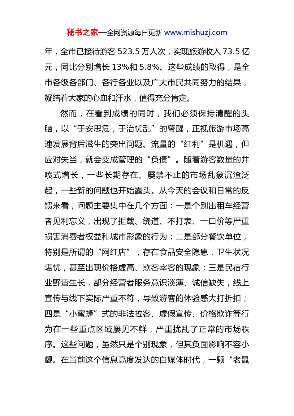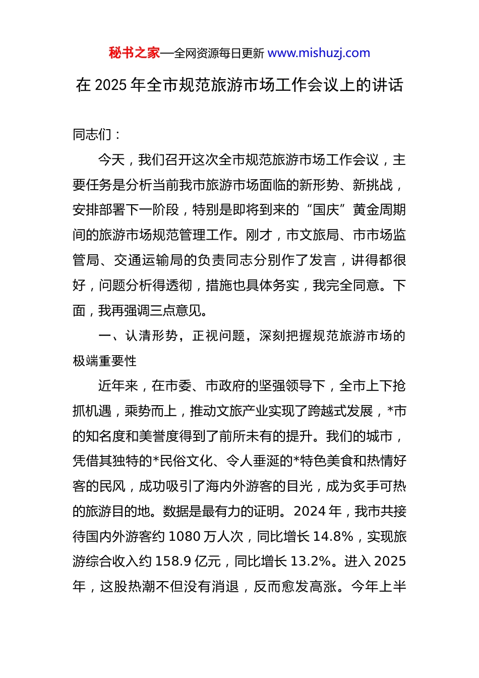 秘书之家—全网资源每日更新 www.mishuzj.com在 2025 年全市规范旅游市场工作会议上的讲话 同志们:今天,我们召开这次全市规范旅游市场工作会议,主要任务是分析当前我市旅游市场面临的新形势、新挑战,安排部署下一阶段,特别是即将到来的“国庆”黄金周期间的旅游市场规范管理工作。刚才,市文旅局、市市场监管局、交通运输局的负责同志分别作了发言,讲得都很好,问题分析得透彻,措施也具体务实,我完全同意。下面,我再强调三点意见。一、认清形势,正视问题,深刻把握规范旅游市场的极端重要性近年来,在市委、市政府的坚强领导下,全市上下抢抓机遇,乘势而上,推动文旅产业实现了跨越式发展,*市的知名度和美誉度得到了前所未有的提升。我们的城市,凭借其独特的*民俗文化、令人垂涎的*特色美食和热情好客的民风,成功吸引了海内外游客的目光,成为炙手可热的旅游目的地。数据是最有力的证明。2024 年,我市共接待国内外游客约 1080 万人次,同比增长 14.8%,实现旅游综合收入约 158.9 亿元,同比增长 13.2%。进入 2025年,这股热潮不但没有消退,反而愈发高涨。今年上半秘书之家—全网资源每日更新 www.mishuzj.com年,全市已接待游客 523.5 万人次,实现旅游收入 73.5 亿元,同比分别增长 13%和 5.8%。这些成绩的取得,是全市各级各部门、各行各业以及广大市民共同努力的结果,凝结着大家的心血和汗水,值得充分肯定。然而,在看到成绩的同时,我们必须保持清醒的头脑,以“于安思危,于治忧乱”的警醒,正视旅游市场高速发展背后滋生的突出问题。流量的“红利”是机遇,但应对失当,就会变成管理的“负债”。随着游客数量的井喷式增长,一些长期存在、屡禁不止的市场乱象沉渣泛起,一些新的问题也开始露头。从今天的会议和日常的反馈来看,问题主要集中在几个方面:一是个别出租车经营者见利忘义,出现了拒载、绕道、不打表、一口价等严重损害消费者权益和城市形象的行为;二是部分餐饮单位,特别是所谓的“网红店”,存在食品安全隐患,卫生状况堪忧,甚至出现价格虚高、欺客宰客的现象;三是民宿行业野蛮生长,部分经营者服务意识淡薄、诚信缺失,线上宣传与线下实际严重不符,导致游客的体验感大打折扣;四是“小蜜蜂”式的非法拉客、虚假宣传、价格欺诈等行为在一些重点区域屡见不鲜,严重扰乱了正常的市场秩序。这些问题,虽然只是个别现象,但其负面影响不容小觑。在当前这个信息高度发达的自媒体时代,一颗“老鼠秘书之家—全网资源每日更新 www.mishuzj.com屎”就可能坏了一锅“汤”。任何一个负面事件,都可能通过网络迅速发酵、放大,让我们长期以来精心塑造的“网红城市”形象毁于一旦。这绝不是危言耸听。旅游业是典型的“眼球经济”,也是脆弱的“口碑经济”。游客的满意度是衡量我们工作的唯一标准,市场的口碑是我们最宝贵的无形资产。因此,规范旅游市场秩序,提升旅游服务质量,已经不是一道“选择题”,而是一道必须答好、没有任何退路的“必答题”。全市上下必须从战略和全局的高度,深刻认识到规范旅游市场秩序的极端重要性和现实紧迫性,将其作为一项关系*市长远发展、关系群众切身利益的重大政治任务来抓,下猛药、出重拳,坚决打赢这场旅游市场秩序整治的攻坚战。二、聚焦关键,精准发力,全面提升旅游市场综合治理能力治理旅游市场乱象,需要系统思维,需要标本兼治。各相关部门要摒弃“头痛医头、脚痛医脚”的局部思维,树立“全域一体、综合施策”的全局观念,聚焦游客反映最强烈、市场秩序中最突出的问题,拿出切实管用的硬招实招,构建起覆盖事前、事中、事后的全链条监管体系。第一,必须以雷霆之势严打违法违规行为,重塑诚信有序的市场环境。良好的市场秩序是旅游业健康发展的基秘书之家—全网资源每日更新 www.mishuzj.com石。对于扰乱市场的害群之马,必须坚持“零容忍”的态度,露头就打,绝不姑息。一要实施最严格的执法监管。市场监管、交通运输、公安等部门要组建联合执法专班,在“国庆”黄金周等重点时段,对景区景点、餐饮酒店、购物场所、交通枢纽等重点区域进行不间断、拉网式的巡查和暗访。要聚焦出...