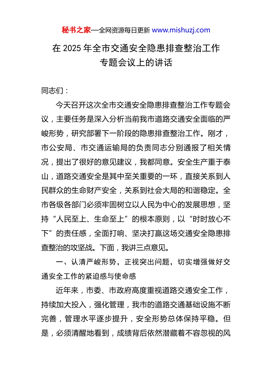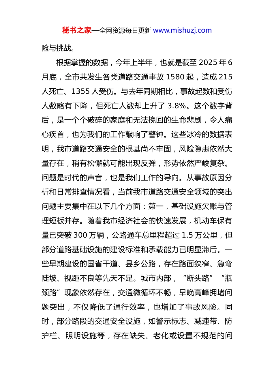 秘书之家—全网资源每日更新 www.mishuzj.com在 2025 年全市交通安全隐患排查整治工作专题会议上的讲话 同志们:今天召开这次全市交通安全隐患排查整治工作专题会议,主要任务是深入分析当前我市道路交通安全面临的严峻形势,研究部署下一阶段的隐患排查整治工作。刚才,市公安局、市交通运输局的负责同志分别通报了相关情况,提出了很好的意见建议,我都同意。安全生产重于泰山,道路交通安全是其中至关重要的一环,直接关系到人民群众的生命财产安全,关系到社会大局的和谐稳定。全市各级各部门必须牢固树立以人民为中心的发展思想,坚持“人民至上、生命至上”的根本原则,以“时时放心不下”的责任感,全面打响、坚决打赢这场交通安全隐患排查整治的攻坚战。下面,我讲三点意见。一、认清严峻形势,正视突出问题,切实增强做好交通安全工作的紧迫感与使命感近年来,市委、市政府高度重视道路交通安全工作,持续加大投入,强化管理,我市的道路交通基础设施不断完善,管理水平逐步提升,安全形势总体保持平稳。但是,必须清醒地看到,成绩背后依然潜藏着不容忽视的风秘书之家—全网资源每日更新 www.mishuzj.com险与挑战。根据掌握的数据,今年上半年,也就是截至 2025 年 6月底,全市共发生各类道路交通事故 1580 起,造成 215人死亡、1355 人受伤。与去年同期相比,事故起数和受伤人数略有下降,但死亡人数却上升了 3.8%。这个数字背后,是一个个破碎的家庭和无法挽回的生命悲剧,令人痛心疾首,也为我们的工作敲响了警钟。这些冰冷的数据表明,我市道路交通安全的根基尚不牢固,风险隐患依然大量存在,稍有松懈就可能出现反弹,形势依然严峻复杂。问题是时代的声音,也是我们工作的导向。从事故原因分析和日常排查情况看,当前我市道路交通安全领域的突出问题主要集中在以下几个方面:第一,基础设施欠账与管理短板并存。随着我市经济社会的快速发展,机动车保有量已突破 300 万辆,公路通车总里程超过 1.5 万公里,但部分道路基础设施的建设标准和承载能力已明显滞后。一些早期建设的国省干道、县乡公路,存在路面狭窄、急弯陡坡、视距不良等先天不足。城市内部,“断头路”“瓶颈路”现象依然存在,交通微循环不畅,早晚高峰拥堵问题突出,不仅降低了通行效率,也增加了事故风险。同时,部分路段的交通安全设施,如警示标志、减速带、防护栏、照明设施等,存在缺失、老化或设置不规范的问秘书之家—全网资源每日更新 www.mishuzj.com题,尤其是在农村地区和城乡接合部,这个问题尤为突出。第二,重点领域风险与薄弱环节交织。从事故高发路段来看,连接城区的*快速路、*国道*段以及通往南部山区的*山区公路,是事故多发、高发的重灾区。这些路段车流量大、车速快,重型货车与小型客车混行现象普遍,一旦发生事故,极易造成严重后果。从事故高发群体来看,“一老一小”以及外来务工人员的交通安全意识相对薄弱,是事故伤亡的高危人群。从重点车辆来看,重型货车、工程运输车、“两客一危”车辆以及近年来数量激增的电动自行车,源头管理和动态监管仍存在漏洞,超速、超载、疲劳驾驶、不按规定车道行驶等违法行为屡禁不止,构成了道路交通的主要风险源。第三,源头治理与综合施策力度不足。道路交通安全是一项复杂的系统工程,需要多部门协同、全社会参与。但在实际工作中,齐抓共管、协同共治的格局尚未完全形成。例如,一些地方对“马路市场”占道经营现象整治不力,导致人车混行,安全隐患极大。部分运输企业安全生产主体责任落实不到位,对驾驶员的安全教育和车辆的日常维护保养流于形式。交通安全宣传教育的方式方法较为传统,精准性、趣味性和覆盖面有待提升,未能真正深入人心,形成全民自觉遵守交通法规的良好社会风尚。这些问题,既有历史积秘书之家—全网资源每日更新 www.mishuzj.com累的沉疴,也有发展过程中出现的新情况。我们必须坚持问题导向,敢于正视、善于分析、勇于解决,以刮骨疗毒的决心和久久为功的韧劲,把每一个隐患都当作事故来对待,坚决遏制事故多发频发势头,全力保障人民群众出行安全。二、聚焦关键环节,采取超常举措,坚决...
