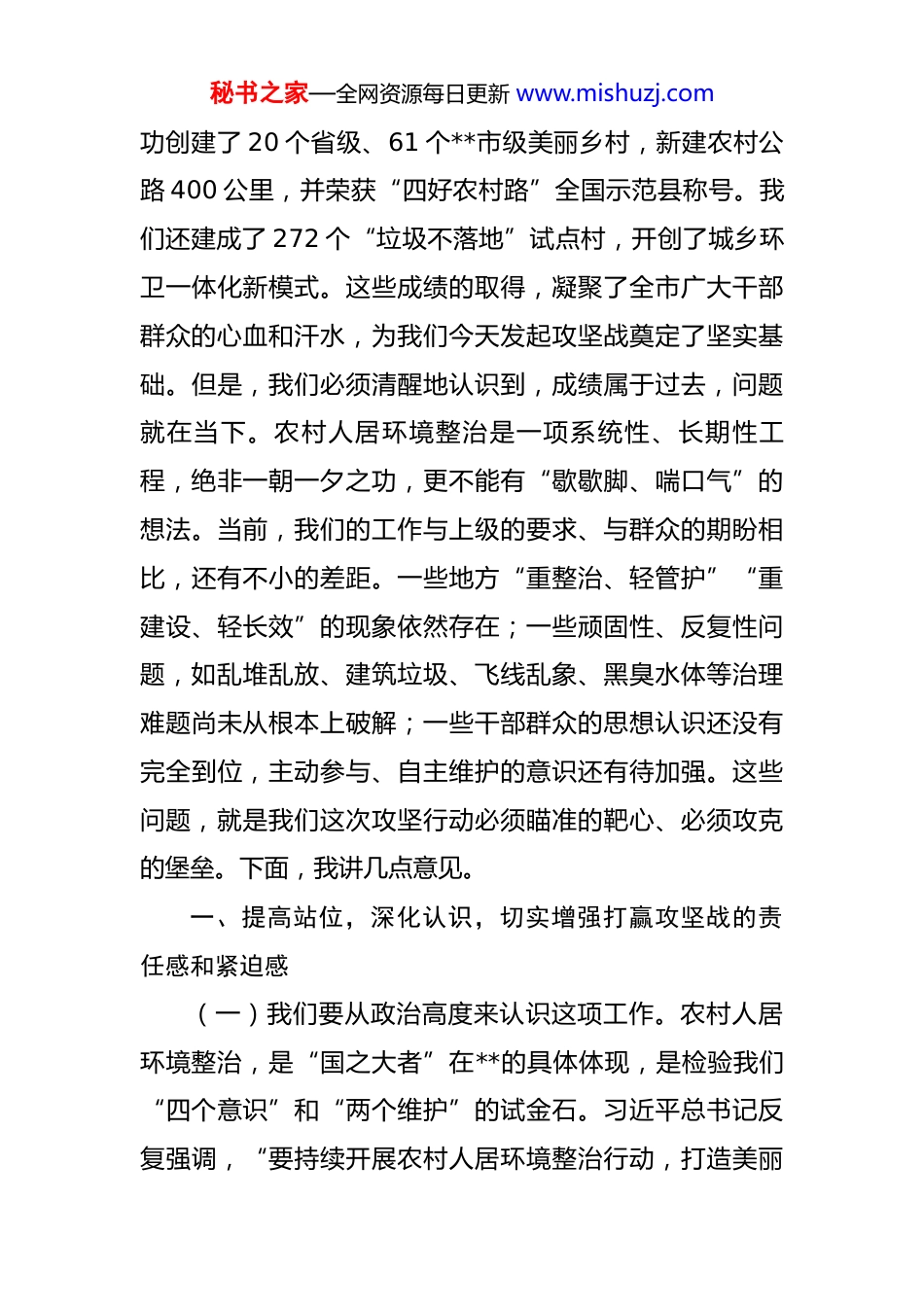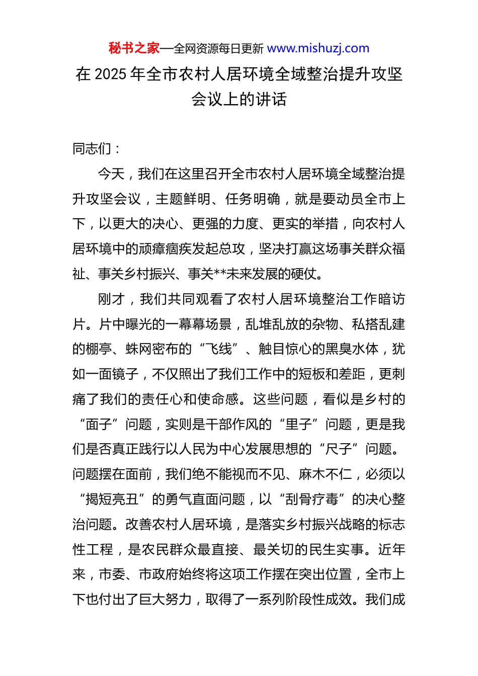 秘书之家—全网资源每日更新 www.mishuzj.com在 2025 年全市农村人居环境全域整治提升攻坚会议上的讲话 同志们:今天,我们在这里召开全市农村人居环境全域整治提升攻坚会议,主题鲜明、任务明确,就是要动员全市上下,以更大的决心、更强的力度、更实的举措,向农村人居环境中的顽瘴痼疾发起总攻,坚决打赢这场事关群众福祉、事关乡村振兴、事关**未来发展的硬仗。刚才,我们共同观看了农村人居环境整治工作暗访片。片中曝光的一幕幕场景,乱堆乱放的杂物、私搭乱建的棚亭、蛛网密布的“飞线”、触目惊心的黑臭水体,犹如一面镜子,不仅照出了我们工作中的短板和差距,更刺痛了我们的责任心和使命感。这些问题,看似是乡村的“面子”问题,实则是干部作风的“里子”问题,更是我们是否真正践行以人民为中心发展思想的“尺子”问题。问题摆在面前,我们绝不能视而不见、麻木不仁,必须以“揭短亮丑”的勇气直面问题,以“刮骨疗毒”的决心整治问题。改善农村人居环境,是落实乡村振兴战略的标志性工程,是农民群众最直接、最关切的民生实事。近年来,市委、市政府始终将这项工作摆在突出位置,全市上下也付出了巨大努力,取得了一系列阶段性成效。我们成秘书之家—全网资源每日更新 www.mishuzj.com功创建了 20 个省级、61 个**市级美丽乡村,新建农村公路 400 公里,并荣获“四好农村路”全国示范县称号。我们还建成了 272 个“垃圾不落地”试点村,开创了城乡环卫一体化新模式。这些成绩的取得,凝聚了全市广大干部群众的心血和汗水,为我们今天发起攻坚战奠定了坚实基础。但是,我们必须清醒地认识到,成绩属于过去,问题就在当下。农村人居环境整治是一项系统性、长期性工程,绝非一朝一夕之功,更不能有“歇歇脚、喘口气”的想法。当前,我们的工作与上级的要求、与群众的期盼相比,还有不小的差距。一些地方“重整治、轻管护”“重建设、轻长效”的现象依然存在;一些顽固性、反复性问题,如乱堆乱放、建筑垃圾、飞线乱象、黑臭水体等治理难题尚未从根本上破解;一些干部群众的思想认识还没有完全到位,主动参与、自主维护的意识还有待加强。这些问题,就是我们这次攻坚行动必须瞄准的靶心、必须攻克的堡垒。下面,我讲几点意见。一、提高站位,深化认识,切实增强打赢攻坚战的责任感和紧迫感(一)我们要从政治高度来认识这项工作。农村人居环境整治,是“国之大者”在**的具体体现,是检验我们“四个意识”和“两个维护”的试金石。习近平总书记反复强调,“要持续开展农村人居环境整治行动,打造美丽秘书之家—全网资源每日更新 www.mishuzj.com乡村,为老百姓留住鸟语花香田园风光”。省委、市委也多次作出部署,要求我们补齐农村人居环境短板。我们必须将思想和行动统一到中央和省市的决策部署上来,将抓好农村人居环境整治作为一项严肃的政治任务,以实际行动诠释对党忠诚、为民负责。(二)我们要从发展全局来把握这项工作。环境是生产力,更是竞争力。一个天蓝、地绿、水清、村美的**,不仅是百姓的幸福家园,更是我们招商引资、汇聚人才、发展文旅产业的“金字招牌”。我们正在大力实施“农村人居环境整治提升五年行动”,推进城乡融合发展。优美的农村人居环境,可以有效带动庭院经济、乡村旅游、健康养老等新业态发展,将生态优势转化为发展优势,为我市绿色低碳高质量发展注入强大动能。可以毫不夸张地说,抓好人居环境,就是抓住了乡村全面振兴的“牛鼻子”。(三)我们要从民生福祉来推动这项工作。民心是最大的政治。老百姓的幸福感、获得感,不是来源于空洞的口号,而是来源于门前屋后的干净整洁,来源于呼吸的清新空气,来源于房前屋后看得见的绿意。整治提升农村人居环境,就是回应人民群众对美好生活的向往,解决好群众最关心、最直接、最现实的利益问题。我们必须始终坚持“群众满意”这个最高标准,把工作做到群众心坎上,秘书之家—全网资源每日更新 www.mishuzj.com让广大农民群众在共建共享中有实实在在的获得感。二、聚焦靶心,精准发力,全面攻克人居环境领域的顽瘴痼疾这次攻坚行动,要坚持问题导向,什么问题突出就集中解决什么问...