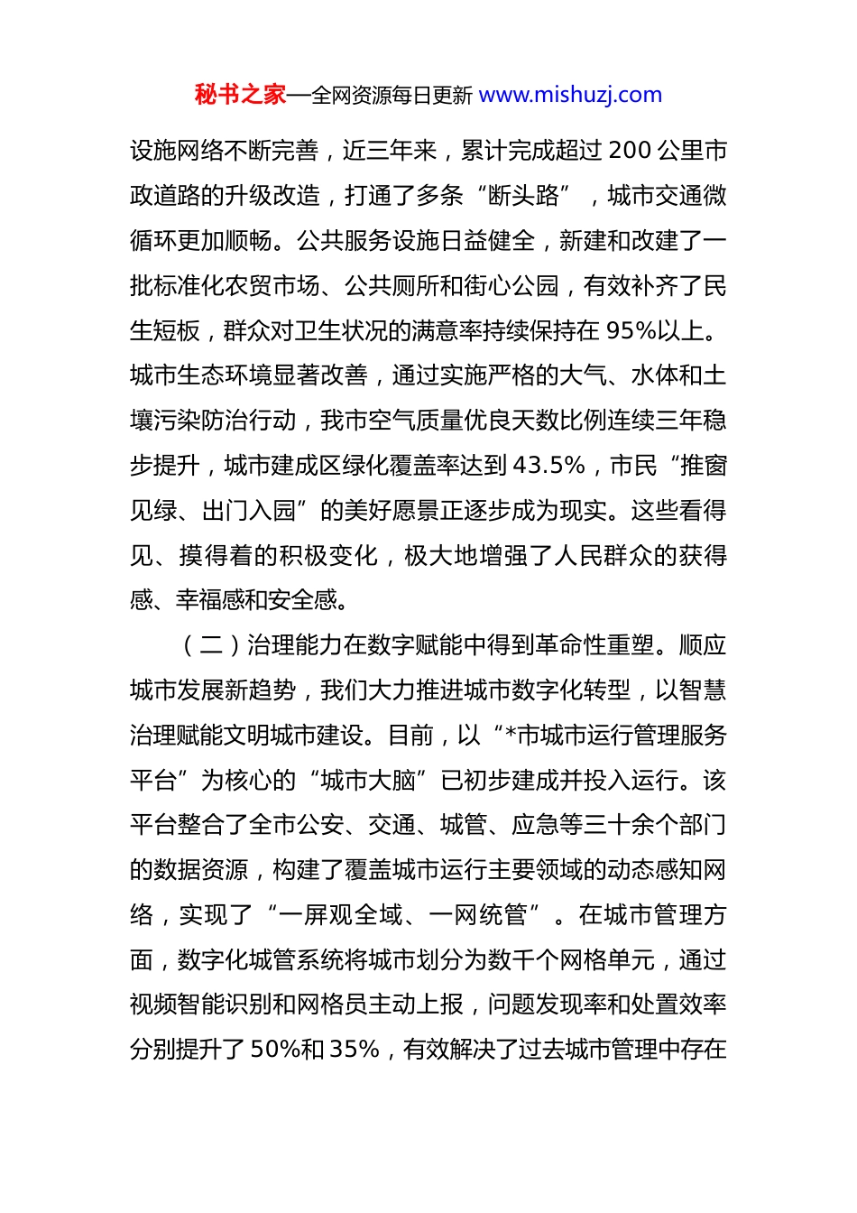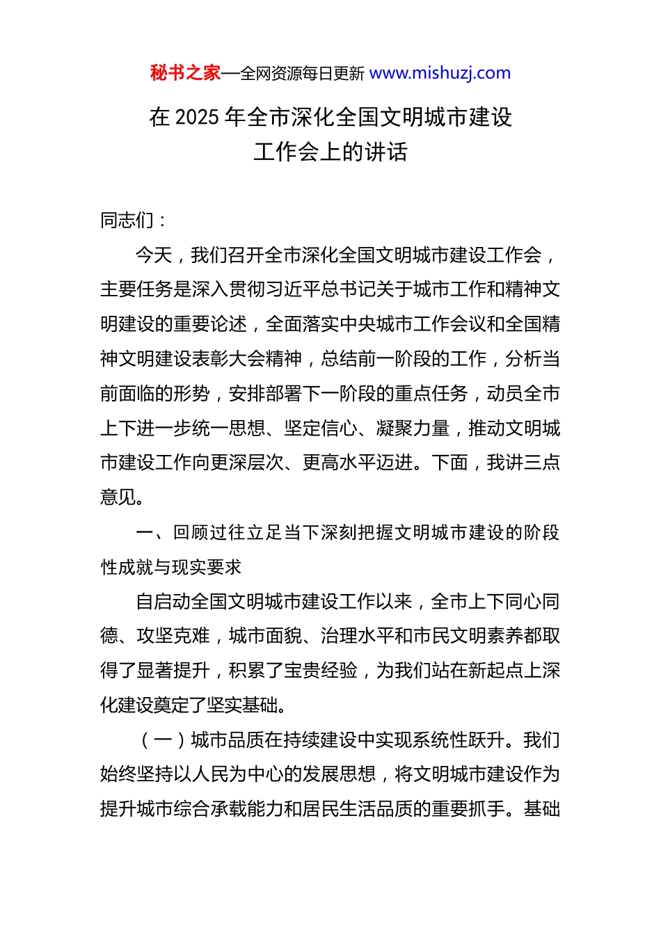 秘书之家—全网资源每日更新 www.mishuzj.com在 2025 年全市深化全国文明城市建设工作会上的讲话 同志们:今天,我们召开全市深化全国文明城市建设工作会,主要任务是深入贯彻习近平总书记关于城市工作和精神文明建设的重要论述,全面落实中央城市工作会议和全国精神文明建设表彰大会精神,总结前一阶段的工作,分析当前面临的形势,安排部署下一阶段的重点任务,动员全市上下进一步统一思想、坚定信心、凝聚力量,推动文明城市建设工作向更深层次、更高水平迈进。下面,我讲三点意见。一、回顾过往立足当下深刻把握文明城市建设的阶段性成就与现实要求自启动全国文明城市建设工作以来,全市上下同心同德、攻坚克难,城市面貌、治理水平和市民文明素养都取得了显著提升,积累了宝贵经验,为我们站在新起点上深化建设奠定了坚实基础。(一)城市品质在持续建设中实现系统性跃升。我们始终坚持以人民为中心的发展思想,将文明城市建设作为提升城市综合承载能力和居民生活品质的重要抓手。基础秘书之家—全网资源每日更新 www.mishuzj.com设施网络不断完善,近三年来,累计完成超过 200 公里市政道路的升级改造,打通了多条“断头路”,城市交通微循环更加顺畅。公共服务设施日益健全,新建和改建了一批标准化农贸市场、公共厕所和街心公园,有效补齐了民生短板,群众对卫生状况的满意率持续保持在 95%以上。城市生态环境显著改善,通过实施严格的大气、水体和土壤污染防治行动,我市空气质量优良天数比例连续三年稳步提升,城市建成区绿化覆盖率达到 43.5%,市民“推窗见绿、出门入园”的美好愿景正逐步成为现实。这些看得见、摸得着的积极变化,极大地增强了人民群众的获得感、幸福感和安全感。(二)治理能力在数字赋能中得到革命性重塑。顺应城市发展新趋势,我们大力推进城市数字化转型,以智慧治理赋能文明城市建设。目前,以“*市城市运行管理服务平台”为核心的“城市大脑”已初步建成并投入运行。该平台整合了全市公安、交通、城管、应急等三十余个部门的数据资源,构建了覆盖城市运行主要领域的动态感知网络,实现了“一屏观全域、一网统管”。在城市管理方面,数字化城管系统将城市划分为数千个网格单元,通过视频智能识别和网格员主动上报,问题发现率和处置效率分别提升了 50%和 35%,有效解决了过去城市管理中存在秘书之家—全网资源每日更新 www.mishuzj.com的“发现难、处置慢”等问题。在公共服务方面,“一网通办”平台不断优化,98%以上的政务服务事项实现线上办理,企业和群众办事更加便捷高效。数字技术的深度应用,不仅提升了城市管理的精细化、智能化水平,也为文明城市建设提供了强大的技术支撑和制度保障。(三)市民素质在价值引领中获得整体性提高。文明的城市,离不开文明的市民。我们始终将培育和践行社会主义核心价值观作为根本任务,深入开展各类精神文明创建活动。通过广泛开展红色教育实践活动和新时代文明实践活动,市民的家国情怀和文明意识普遍增强。志愿服务蔚然成风,全市注册志愿者人数已突破 25 万,各类志愿服务组织活跃在城市的大街小巷,成为一道亮丽的风景线。先进典型不断涌现,近年来,我市涌现出一大批“*好人”、道德模范等先进人物,他们的事迹广为传颂,引领了崇德向善的社会风尚。同时,通过持续开展文明交通、文明餐桌、文明旅游等专项行动,市民的文明行为习惯正在养成,社会风气持续向好。在肯定成绩的同时,也必须清醒地认识到,对标全国文明城市的更高标准和人民群众的更高期待,我们的工作还存在一些不容忽视的短板和弱项。例如,城乡发展不平衡问题依然存在,部分城乡接合部、背街小巷的环境卫生秘书之家—全网资源每日更新 www.mishuzj.com和基础设施仍是薄弱环节;城市精细化管理水平有待进一步提升,车辆乱停乱放、占道经营等现象偶有反弹;部分市民的文明习惯尚未完全养成,公共场所不文明行为时有发生;常态长效的工作机制仍需进一步健全和完善,存在“平时抓得紧、平时有所松”的现象。这些问题是深化文明城市建设必须攻克的难关,也是我们下一步工作的着力点。二、把握精髓锚定航向以更高站位擘画文...