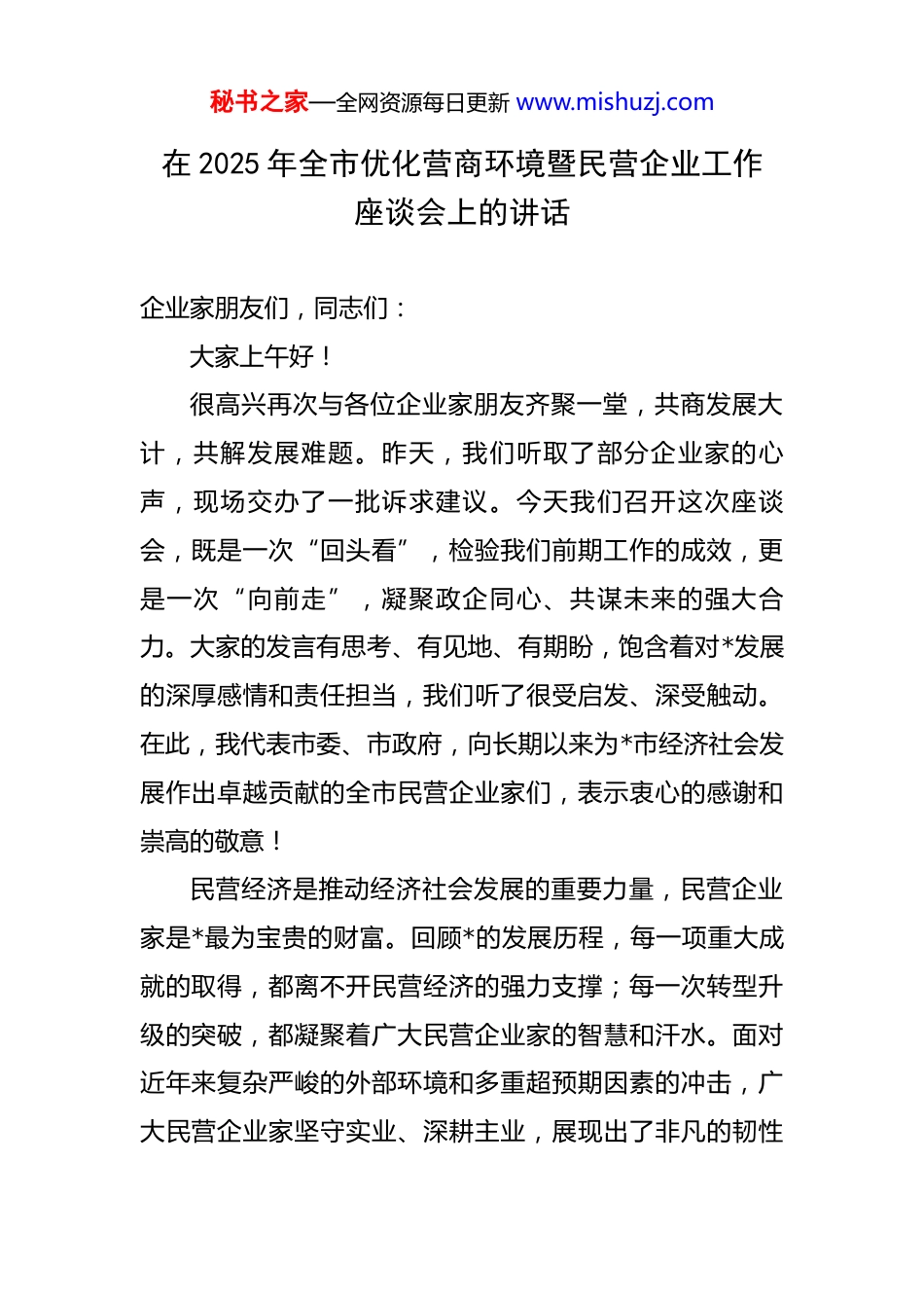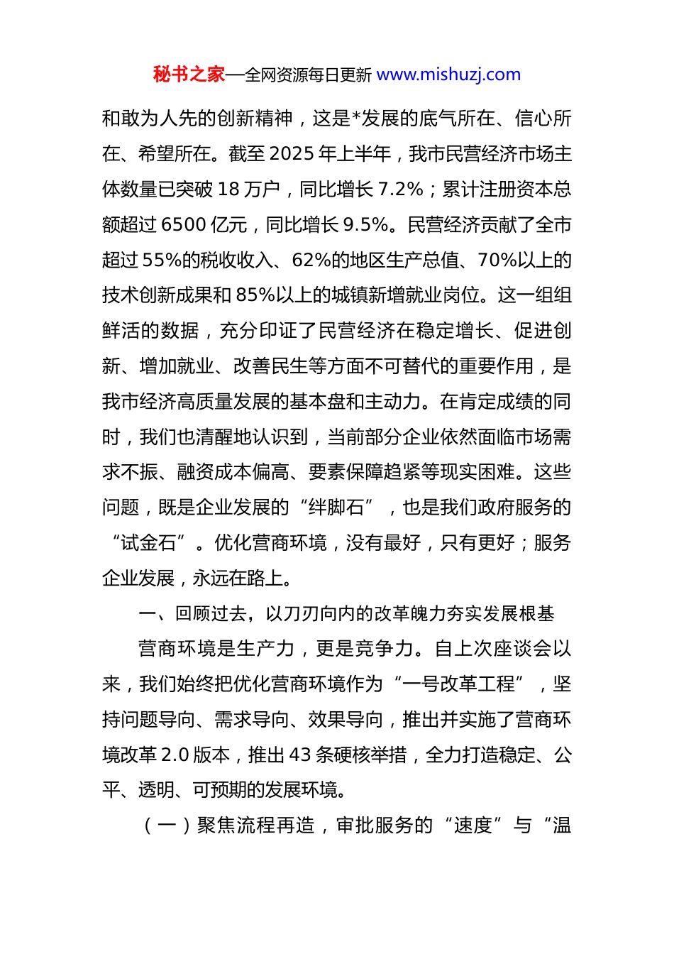 秘书之家—全网资源每日更新 www.mishuzj.com在 2025 年全市优化营商环境暨民营企业工作座谈会上的讲话 企业家朋友们,同志们:大家上午好!很高兴再次与各位企业家朋友齐聚一堂,共商发展大计,共解发展难题。昨天,我们听取了部分企业家的心声,现场交办了一批诉求建议。今天我们召开这次座谈会,既是一次“回头看”,检验我们前期工作的成效,更是一次“向前走”,凝聚政企同心、共谋未来的强大合力。大家的发言有思考、有见地、有期盼,饱含着对*发展的深厚感情和责任担当,我们听了很受启发、深受触动。在此,我代表市委、市政府,向长期以来为*市经济社会发展作出卓越贡献的全市民营企业家们,表示衷心的感谢和崇高的敬意!民营经济是推动经济社会发展的重要力量,民营企业家是*最为宝贵的财富。回顾*的发展历程,每一项重大成就的取得,都离不开民营经济的强力支撑;每一次转型升级的突破,都凝聚着广大民营企业家的智慧和汗水。面对近年来复杂严峻的外部环境和多重超预期因素的冲击,广大民营企业家坚守实业、深耕主业,展现出了非凡的韧性秘书之家—全网资源每日更新 www.mishuzj.com和敢为人先的创新精神,这是*发展的底气所在、信心所在、希望所在。截至 2025 年上半年,我市民营经济市场主体数量已突破 18 万户,同比增长 7.2%;累计注册资本总额超过 6500 亿元,同比增长 9.5%。民营经济贡献了全市超过 55%的税收收入、62%的地区生产总值、70%以上的技术创新成果和 85%以上的城镇新增就业岗位。这一组组鲜活的数据,充分印证了民营经济在稳定增长、促进创新、增加就业、改善民生等方面不可替代的重要作用,是我市经济高质量发展的基本盘和主动力。在肯定成绩的同时,我们也清醒地认识到,当前部分企业依然面临市场需求不振、融资成本偏高、要素保障趋紧等现实困难。这些问题,既是企业发展的“绊脚石”,也是我们政府服务的“试金石”。优化营商环境,没有最好,只有更好;服务企业发展,永远在路上。一、回顾过去,以刀刃向内的改革魄力夯实发展根基营商环境是生产力,更是竞争力。自上次座谈会以来,我们始终把优化营商环境作为“一号改革工程”,坚持问题导向、需求导向、效果导向,推出并实施了营商环境改革 2.0 版本,推出 43 条硬核举措,全力打造稳定、公平、透明、可预期的发展环境。(一)聚焦流程再造,审批服务的“速度”与“温秘书之家—全网资源每日更新 www.mishuzj.com度”并行。政务服务的效率,直接决定了企业发展的速度。我们对标国内一流标准,以系统性重塑的决心推动审批流程革命。深入推进“高效办成一件事”改革,将企业开办全流程时间压缩至 0.5 个工作日以内,实现“一表申请、一窗受理、一次办结”。针对产业项目落地周期长的痛点,我们全面推行“拿地即开工”“六证同发”等创新模式,将一般性企业投资项目从立项到取得施工许可的审批时限压减至 40 个工作日以内,比改革前缩短了近 60%。不仅追求速度,更注重服务温度。我们建立了重点项目“首席服务官”制度,为企业提供从项目洽谈到投产达效的全生命周期“一对一”管家式服务。今年以来,已通过该机制协调解决各类问题超过 300 项,保障了*重工、*新材料等一批重大项目顺利推进。(二)聚焦数字赋能,政务办理的“线上”与“线下”融合。我们顺应数字化变革浪潮,建成了全市统一的“*”智慧政务平台,推动政务服务从“能办”向“好办、易办”转变。目前,全市依申请政务服务事项网上可办率达到 98%,全程网办率超过 90%,“不见面审批”已成为常态。特别是在政策兑现方面,我们着力破解“企业找政策难、政策落地难”问题,创新打造了“免申即享”服务模式。通过大数据分析,精准匹配符合条件的企业,变秘书之家—全网资源每日更新 www.mishuzj.com“企业申报”为“政府智配”,实现政策资金“无感直达”。截至今年 8 月底,通过该平台已为超过 3800 家企业兑现各类扶持资金 4.7 亿元,平均兑现时间缩短了 80%以上,让企业真正感受到了政策的“及时雨”和政府的“暖心办”。(三)聚焦监管创新,执法检查的“力度”与“精度”兼备。一个好的营商环境...
