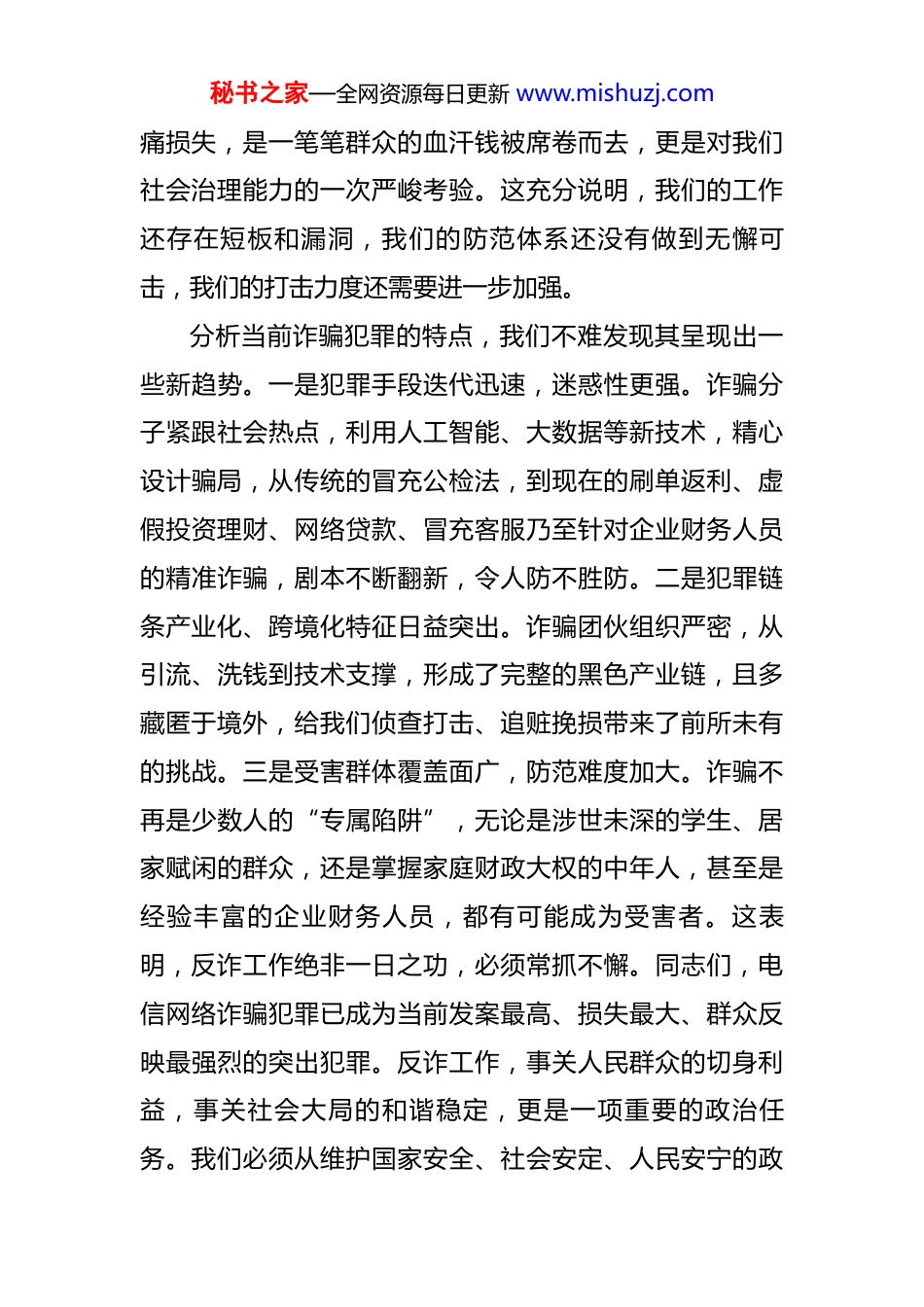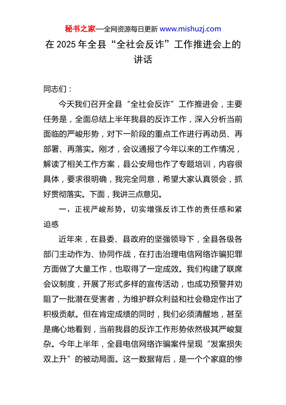 秘书之家—全网资源每日更新 www.mishuzj.com在 2025 年全县“全社会反诈”工作推进会上的讲话 同志们:今天我们召开全县“全社会反诈”工作推进会,主要任务是,全面总结上半年我县的反诈工作,深入分析当前面临的严峻形势,对下一阶段的重点工作进行再动员、再部署、再落实。刚才,会议通报了今年以来的工作情况,解读了相关工作方案,县公安局也作了专题培训,内容很具体,要求很明确,我完全同意,希望大家认真领会,抓好贯彻落实。下面,我讲三点意见。一、正视严峻形势,切实增强反诈工作的责任感和紧迫感近年来,在县委、县政府的坚强领导下,全县各级各部门主动作为、协同作战,在打击治理电信网络诈骗犯罪方面做了大量工作,也取得了一定成效。我们构建了联席会议制度,开展了形式多样的宣传活动,也成功预警并劝阻了一批潜在受害者,为维护群众利益和社会稳定作出了积极贡献。但在肯定成绩的同时,我们必须清醒地,甚至是痛心地看到,当前我县的反诈工作形势依然极其严峻复杂。今年上半年,全县电信网络诈骗案件呈现“发案损失双上升”的被动局面。这一数据背后,是一个个家庭的惨秘书之家—全网资源每日更新 www.mishuzj.com痛损失,是一笔笔群众的血汗钱被席卷而去,更是对我们社会治理能力的一次严峻考验。这充分说明,我们的工作还存在短板和漏洞,我们的防范体系还没有做到无懈可击,我们的打击力度还需要进一步加强。分析当前诈骗犯罪的特点,我们不难发现其呈现出一些新趋势。一是犯罪手段迭代迅速,迷惑性更强。诈骗分子紧跟社会热点,利用人工智能、大数据等新技术,精心设计骗局,从传统的冒充公检法,到现在的刷单返利、虚假投资理财、网络贷款、冒充客服乃至针对企业财务人员的精准诈骗,剧本不断翻新,令人防不胜防。二是犯罪链条产业化、跨境化特征日益突出。诈骗团伙组织严密,从引流、洗钱到技术支撑,形成了完整的黑色产业链,且多藏匿于境外,给我们侦查打击、追赃挽损带来了前所未有的挑战。三是受害群体覆盖面广,防范难度加大。诈骗不再是少数人的“专属陷阱”,无论是涉世未深的学生、居家赋闲的群众,还是掌握家庭财政大权的中年人,甚至是经验丰富的企业财务人员,都有可能成为受害者。这表明,反诈工作绝非一日之功,必须常抓不懈。同志们,电信网络诈骗犯罪已成为当前发案最高、损失最大、群众反映最强烈的突出犯罪。反诈工作,事关人民群众的切身利益,事关社会大局的和谐稳定,更是一项重要的政治任务。我们必须从维护国家安全、社会安定、人民安宁的政秘书之家—全网资源每日更新 www.mishuzj.com治高度,深刻认识这项工作的极端重要性和现实紧迫性。每一个单位的“一把手”都必须亲自过问、亲自部署,分管领导要具体抓、抓具体,坚决克服麻痹思想和厌战情绪,以“时时放心不下”的责任感,以决战决胜的姿态,迅速行动起来,坚决把“发案损失双上升”的势头打下去,切实守护好人民群众的“钱袋子”。二、聚焦关键环节,全力构建齐抓共管的工作新格局面对严峻复杂的斗争形势,单靠公安机关一家单打独斗是远远不够的。我们必须坚持系统观念、法治思维,坚持多措并举、综合施策,着力构建党委领导、政府主导、部门主责、行业监管、社会参与的“全社会反诈”工作格局。(一)深化宣传防范,筑牢“全民免疫”的第一道防线。无数案例证明,事后打击不如事中阻断,事中阻断不如事前防范。提升群众的识骗防骗能力,是成本最低、效果最好的反诈举措。一是要让精准宣传“全覆盖”。宣传工作不能“大水漫灌”,要推动“精准滴灌”。要深入分析我县高发的诈骗类型和易受骗的群体特征,分门别类、因人施策。针对学生群体,要联合教育部门,将反诈知识纳入“开学第一课”,通过典型案例、情景剧等形式,让他们了解“校园贷”“刷单”等骗局的危害。针对企业财会人员,要定期组织专题培训,强化制度建设,堵塞管理秘书之家—全网资源每日更新 www.mishuzj.com漏洞。针对老年群体,要多用他们听得懂的语言,走进社区、走进家庭,揭露养老、保健品等诈骗手法。二是要让创新宣传“深入人心”。我们要充分利用各类宣传阵地,不仅要在传统媒体上发声,更...