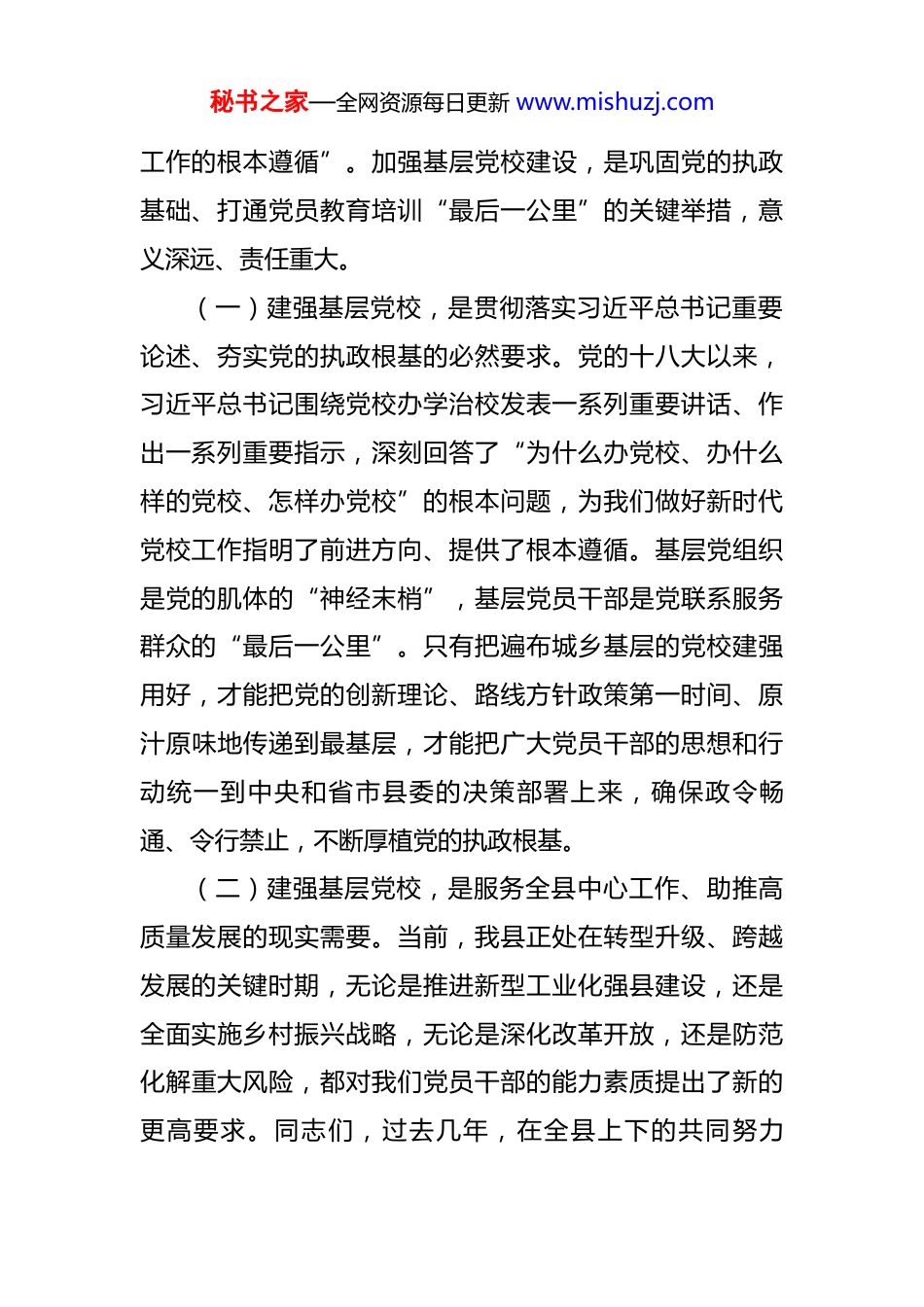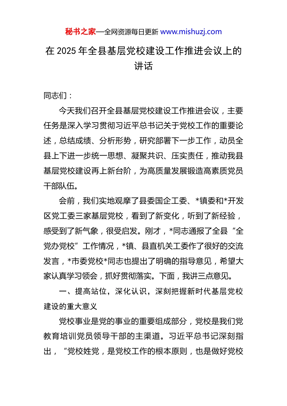 秘书之家—全网资源每日更新 www.mishuzj.com在 2025 年全县基层党校建设工作推进会议上的讲话 同志们:今天我们召开全县基层党校建设工作推进会议,主要任务是深入学习贯彻习近平总书记关于党校工作的重要论述,总结成绩、分析形势,研究部署下一步工作,动员全县上下进一步统一思想、凝聚共识、压实责任,推动我县基层党校建设再上新台阶,为高质量发展锻造高素质党员干部队伍。会前,我们实地观摩了县委国企工委、*镇委和*开发区党工委三家基层党校,看到了新变化,听到了新经验,感受到了新气象,很受启发。刚才,*同志通报了全县“全党办党校”工作情况,*镇、县直机关工委作了很好的交流发言,*市委党校*同志也提出了明确的指导意见,希望大家认真学习领会,抓好贯彻落实。下面,我讲三点意见。一、提高站位,深化认识,深刻把握新时代基层党校建设的重大意义党校事业是党的事业的重要组成部分,党校是我们党教育培训党员领导干部的主渠道。习近平总书记深刻指出,“党校姓党,是党校工作的根本原则,也是做好党校秘书之家—全网资源每日更新 www.mishuzj.com工作的根本遵循”。加强基层党校建设,是巩固党的执政基础、打通党员教育培训“最后一公里”的关键举措,意义深远、责任重大。(一)建强基层党校,是贯彻落实习近平总书记重要论述、夯实党的执政根基的必然要求。党的十八大以来,习近平总书记围绕党校办学治校发表一系列重要讲话、作出一系列重要指示,深刻回答了“为什么办党校、办什么样的党校、怎样办党校”的根本问题,为我们做好新时代党校工作指明了前进方向、提供了根本遵循。基层党组织是党的肌体的“神经末梢”,基层党员干部是党联系服务群众的“最后一公里”。只有把遍布城乡基层的党校建强用好,才能把党的创新理论、路线方针政策第一时间、原汁原味地传递到最基层,才能把广大党员干部的思想和行动统一到中央和省市县委的决策部署上来,确保政令畅通、令行禁止,不断厚植党的执政根基。(二)建强基层党校,是服务全县中心工作、助推高质量发展的现实需要。当前,我县正处在转型升级、跨越发展的关键时期,无论是推进新型工业化强县建设,还是全面实施乡村振兴战略,无论是深化改革开放,还是防范化解重大风险,都对我们党员干部的能力素质提出了新的更高要求。同志们,过去几年,在全县上下的共同努力秘书之家—全网资源每日更新 www.mishuzj.com下,我县基层党校建设取得了长足进步。目前,我们已经构建起覆盖全县*个镇(街道)、*个县直单位和重点行业的基层党校矩阵,实现了党员教育阵地的“无死角”覆盖。全县共挂牌成立基层党校*所,组建了一支由*名专兼职教师构成的师资队伍。仅去年一年,全县各级党校就举办各类培训班超过 200 期,培训党员干部 1.5 万余人次,为全县经济社会发展注入了强大动力。但同时,我们也要清醒地看到,对标新形势新任务,我县基层党校工作仍存在一些不容忽视的问题:有的地方和单位对党校工作的重视程度还不够,投入保障有待加强;有的基层党校办学不规范,阵地作用发挥不充分;有的教学内容和方式方法陈旧,吸引力、感染力不强;有的师资力量薄弱,课程体系与基层实际需求结合不够紧密。这些问题,必须引起我们高度重视,采取有力措施加以解决。(三)建强基层党校,是推进全面从严治党、锻造过硬干部队伍的迫切任务。干部教育培训是建设高素质干部队伍的先导性、基础性、战略性工程。基层党校作为党员干部党性锻炼的“大熔炉”,承担着从源头上加强思想政治建设、筑牢信仰之基、补足精神之钙、把稳思想之舵的重要职责。只有把基层党校这个阵地建好守好,才能引导广大党员干部树立正确的权力观、政绩观、事业观,严守秘书之家—全网资源每日更新 www.mishuzj.com政治纪律和政治规矩,永葆共产党人政治本色,锻造一支忠诚干净担当的干部队伍,营造风清气正的政治生态。二、聚焦重点,精准发力,全面推动基层党校建设提质增效办好建强基层党校,是一项系统工程,必须坚持目标导向和问题导向相统一,抓重点、补短板、强弱项,在规范化、特色化、实效化上下功夫,全面提升办学治校水平。(一)必须始终坚持“...