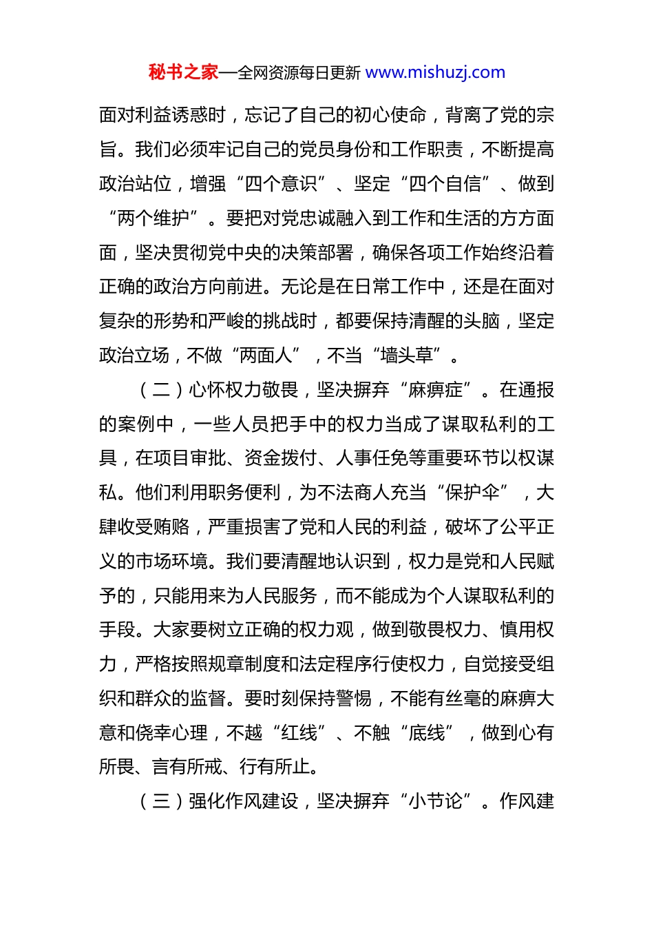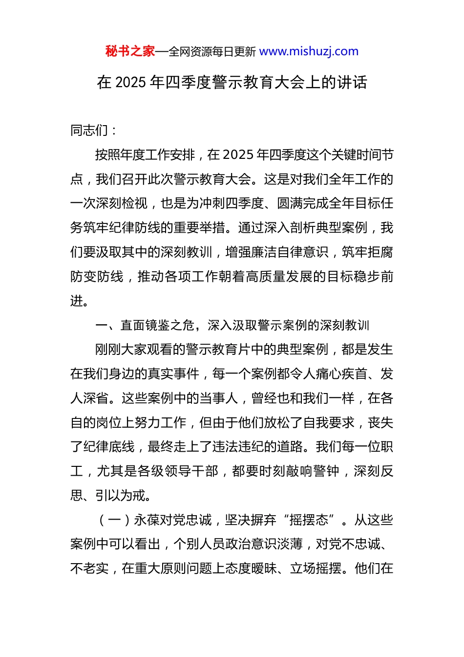 秘书之家—全网资源每日更新 www.mishuzj.com在 2025 年四季度警示教育大会上的讲话 同志们:按照年度工作安排,在 2025 年四季度这个关键时间节点,我们召开此次警示教育大会。这是对我们全年工作的一次深刻检视,也是为冲刺四季度、圆满完成全年目标任务筑牢纪律防线的重要举措。通过深入剖析典型案例,我们要汲取其中的深刻教训,增强廉洁自律意识,筑牢拒腐防变防线,推动各项工作朝着高质量发展的目标稳步前进。一、直面镜鉴之危,深入汲取警示案例的深刻教训刚刚大家观看的警示教育片中的典型案例,都是发生在我们身边的真实事件,每一个案例都令人痛心疾首、发人深省。这些案例中的当事人,曾经也和我们一样,在各自的岗位上努力工作,但由于他们放松了自我要求,丧失了纪律底线,最终走上了违法违纪的道路。我们每一位职工,尤其是各级领导干部,都要时刻敲响警钟,深刻反思、引以为戒。(一)永葆对党忠诚,坚决摒弃“摇摆态”。从这些案例中可以看出,个别人员政治意识淡薄,对党不忠诚、不老实,在重大原则问题上态度暧昧、立场摇摆。他们在秘书之家—全网资源每日更新 www.mishuzj.com面对利益诱惑时,忘记了自己的初心使命,背离了党的宗旨。我们必须牢记自己的党员身份和工作职责,不断提高政治站位,增强“四个意识”、坚定“四个自信”、做到“两个维护”。要把对党忠诚融入到工作和生活的方方面面,坚决贯彻党中央的决策部署,确保各项工作始终沿着正确的政治方向前进。无论是在日常工作中,还是在面对复杂的形势和严峻的挑战时,都要保持清醒的头脑,坚定政治立场,不做“两面人”,不当“墙头草”。(二)心怀权力敬畏,坚决摒弃“麻痹症”。在通报的案例中,一些人员把手中的权力当成了谋取私利的工具,在项目审批、资金拨付、人事任免等重要环节以权谋私。他们利用职务便利,为不法商人充当“保护伞”,大肆收受贿赂,严重损害了党和人民的利益,破坏了公平正义的市场环境。我们要清醒地认识到,权力是党和人民赋予的,只能用来为人民服务,而不能成为个人谋取私利的手段。大家要树立正确的权力观,做到敬畏权力、慎用权力,严格按照规章制度和法定程序行使权力,自觉接受组织和群众的监督。要时刻保持警惕,不能有丝毫的麻痹大意和侥幸心理,不越“红线”、不触“底线”,做到心有所畏、言有所戒、行有所止。(三)强化作风建设,坚决摒弃“小节论”。作风建秘书之家—全网资源每日更新 www.mishuzj.com设无小事。典型案例中的一些人员纪律意识淡薄,经常迟到早退、无故脱岗;有的职工服务意识不强,对群众态度冷漠、敷衍塞责;有的工作积极性不高,得过且过,从不主动解决实际问题。这些看似是小事,却严重影响了单位的形象和公信力,损害了党和人民的利益。我们要深刻认识到作风建设的重要性,从小事做起,从细节抓起,严格遵守各项规章制度,持之以恒地加强作风建设。要树立正确的政绩观,真抓实干,勇于担当,以良好的作风推动各项工作取得实效。二、聚焦问题之根,全面整治队伍中的突出问题通过对这些警示案例的深入分析,我们可以看到,当前队伍中存在的问题,既有思想认识方面的原因,也有制度执行方面的漏洞,还有个人自律方面的不足。我们要坚持问题导向,深入查找问题根源,制定有效举措,全面整治队伍中存在的突出问题。(一)加强思想理论建设,筑牢忠诚之基。要深入学习贯彻习近平新时代中国特色社会主义思想,特别是关于党风廉政建设和反腐败工作的重要论述,不断提高理论水平和政治素养。要加强理想信念教育,引导广大职工坚定共产主义信仰,牢记为人民服务的宗旨,忠诚履行职责。同时,要加强职业道德教育,培养职工的荣誉感和责任秘书之家—全网资源每日更新 www.mishuzj.com感,树立正确的价值观和权力观。通过开展专题学习、主题党日活动等形式,让广大职工深刻领会新思想的内涵和实质,自觉用新思想武装头脑、指导实践、推动工作。(二)强化纪律规矩建设,树立良好形象。要严格执行各项纪律规定,加强对职工的日常管理和监督,及时发现和纠正职工的错误行为。要定期对重点领域、关键环节进行监督检查,防止权力滥用和腐败问题...