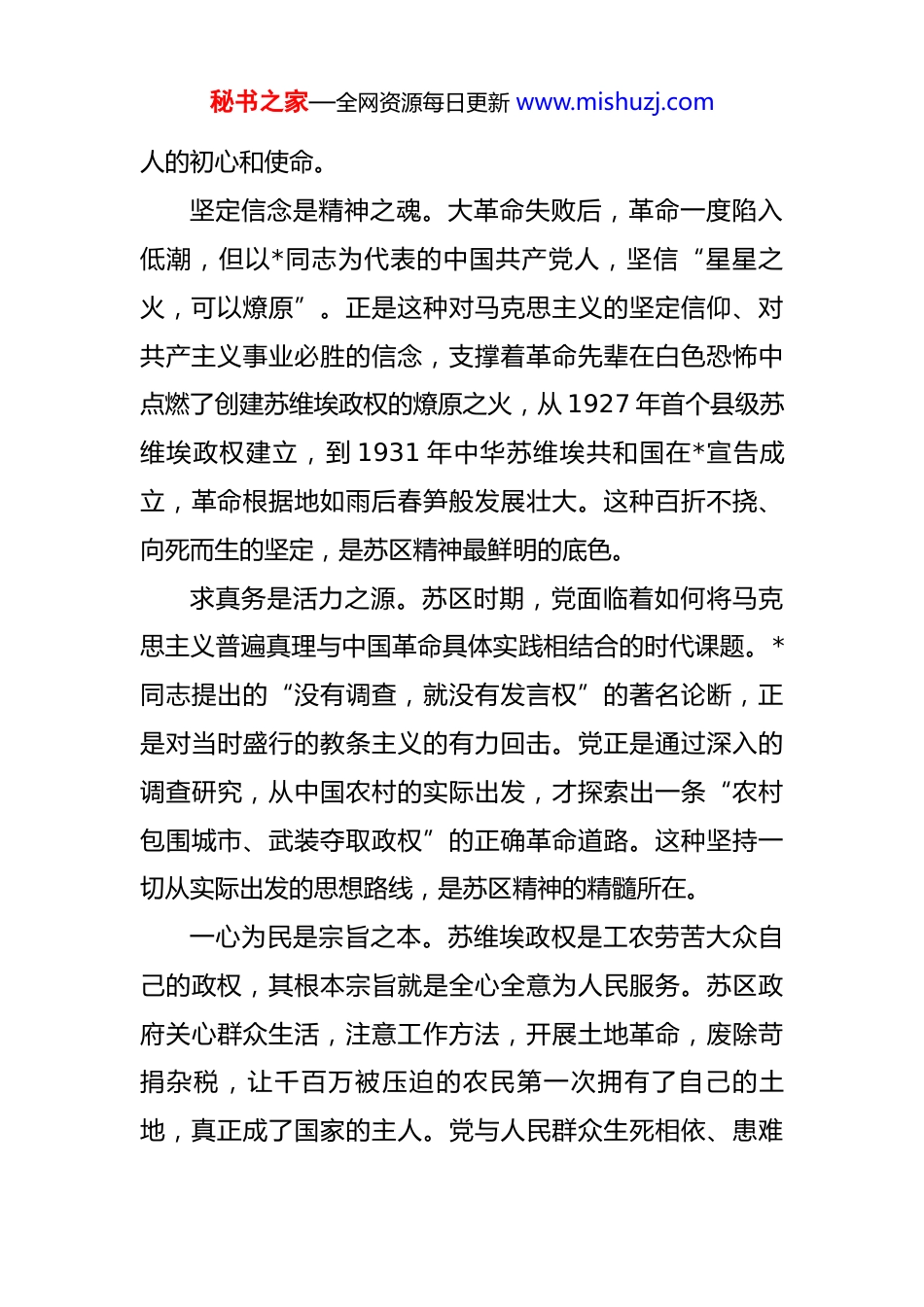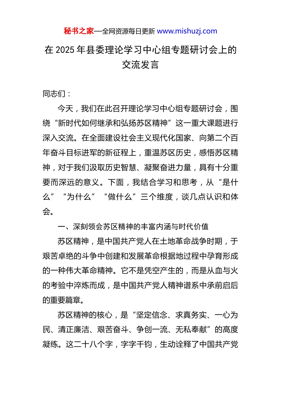 秘书之家—全网资源每日更新 www.mishuzj.com在 2025 年县委理论学习中心组专题研讨会上的交流发言 同志们:今天,我们在此召开理论学习中心组专题研讨会,围绕“新时代如何继承和弘扬苏区精神”这一重大课题进行深入交流。在全面建设社会主义现代化国家、向第二个百年奋斗目标进军的新征程上,重温苏区历史,感悟苏区精神,对于我们汲取历史智慧、凝聚奋进力量,具有十分重要而深远的意义。下面,我结合学习和思考,从“是什么”“为什么”“做什么”三个维度,谈几点认识和体会。一、深刻领会苏区精神的丰富内涵与时代价值苏区精神,是中国共产党人在土地革命战争时期,于艰苦卓绝的斗争中创建和发展革命根据地过程中孕育形成的一种伟大革命精神。它不是凭空产生的,而是从血与火的考验中淬炼而成,是中国共产党人精神谱系中承前启后的重要篇章。苏区精神的核心,是“坚定信念、求真务实、一心为民、清正廉洁、艰苦奋斗、争创一流、无私奉献”的高度凝练。这二十八个字,字字千钧,生动诠释了中国共产党秘书之家—全网资源每日更新 www.mishuzj.com人的初心和使命。坚定信念是精神之魂。大革命失败后,革命一度陷入低潮,但以*同志为代表的中国共产党人,坚信“星星之火,可以燎原”。正是这种对马克思主义的坚定信仰、对共产主义事业必胜的信念,支撑着革命先辈在白色恐怖中点燃了创建苏维埃政权的燎原之火,从 1927 年首个县级苏维埃政权建立,到 1931 年中华苏维埃共和国在*宣告成立,革命根据地如雨后春笋般发展壮大。这种百折不挠、向死而生的坚定,是苏区精神最鲜明的底色。求真务是活力之源。苏区时期,党面临着如何将马克思主义普遍真理与中国革命具体实践相结合的时代课题。*同志提出的“没有调查,就没有发言权”的著名论断,正是对当时盛行的教条主义的有力回击。党正是通过深入的调查研究,从中国农村的实际出发,才探索出一条“农村包围城市、武装夺取政权”的正确革命道路。这种坚持一切从实际出发的思想路线,是苏区精神的精髓所在。一心为民是宗旨之本。苏维埃政权是工农劳苦大众自己的政权,其根本宗旨就是全心全意为人民服务。苏区政府关心群众生活,注意工作方法,开展土地革命,废除苛捐杂税,让千百万被压迫的农民第一次拥有了自己的土地,真正成了国家的主人。党与人民群众生死相依、患难秘书之家—全网资源每日更新 www.mishuzj.com与共,形成了牢不可破的血肉联系,这是苏区能够存在和发展的根本原因。清正廉洁是作风之基。在物资极度匮乏的环境下,党和苏维埃政府高度重视廉政建设,颁布了中国共产党历史上第一个反腐败法令,严惩贪污浪费行为。时任*省苏维埃政府主席的*同志,在突围中身负重伤,宁愿沿途乞讨,也未动用分毫其保管的党的经费。这种克己奉公、清廉如水的政治本色,赢得了民心,巩固了政权。艰苦奋斗、争创一流、无私奉献是实践之要。苏区军民在敌人的严密封锁下,自力更生,发展生产,打破了一个个“不可能”;在各个领域都追求卓越,力求把工作做到最好;无数革命先烈为了人民的解放事业,不惜抛头颅、洒热血,用生命践行了对党的无限忠诚。总而言之,苏区精神上承井冈山精神,下启长征精神,是党和人民极为宝贵的精神财富。其丰富内涵,跨越时空,历久弥新,是我们今天走好新时代长征路的力量源泉和行动指南。二、精准把握传承弘扬苏区精神的重大意义进入新时代,我们面临的形势环境、肩负的历史任务发生了深刻变化,但苏区精神所蕴含的价值追求和精神力量,不仅没有过时,反而更显其时代光芒。秘书之家—全网资源每日更新 www.mishuzj.com传承弘扬苏区精神,是筑牢信仰之基、补足精神之钙的政治要求。习近平总书记在 2025 年考察江西时深刻指出,苏区精神“承载着中国共产党人的初心和使命,是砥砺我们不忘初心、牢记使命的不竭精神动力”。当前,各种思想文化交流交融交锋日益频繁,一些党员干部不同程度地面临着信仰迷茫、精神懈怠的危险。重温苏区先辈们用生命和鲜血铸就的坚定信念,就是要引导广大党员干部从思想深处解决“为谁执政、为谁用权、为谁服务”的根本问题,深刻领悟“两个确立”的决定性意义,增强“四...
