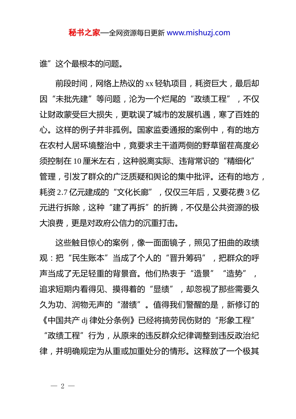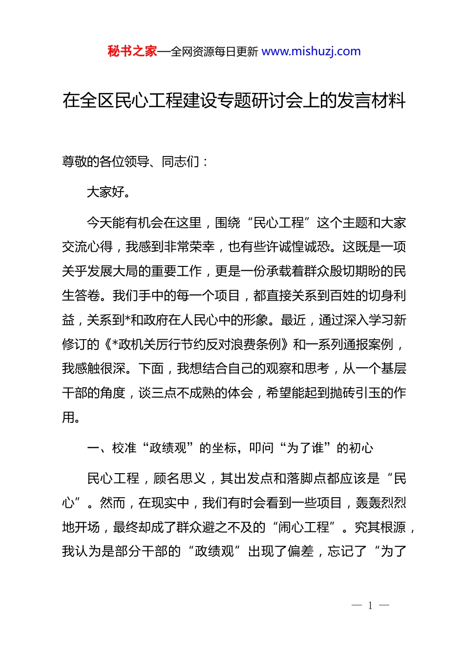 秘书之家—全网资源每日更新 www.mishuzj.com在全区民心工程建设专题研讨会上的发言材料尊敬的各位领导、同志们:大家好。今天能有机会在这里,围绕“民心工程”这个主题和大家交流心得,我感到非常荣幸,也有些许诚惶诚恐。这既是一项关乎发展大局的重要工作,更是一份承载着群众殷切期盼的民生答卷。我们手中的每一个项目,都直接关系到百姓的切身利益,关系到*和政府在人民心中的形象。最近,通过深入学习新修订的《*政机关厉行节约反对浪费条例》和一系列通报案例,我感触很深。下面,我想结合自己的观察和思考,从一个基层干部的角度,谈三点不成熟的体会,希望能起到抛砖引玉的作用。一、校准“政绩观”的坐标,叩问“为了谁”的初心民心工程,顾名思义,其出发点和落脚点都应该是“民心”。然而,在现实中,我们有时会看到一些项目,轰轰烈烈地开场,最终却成了群众避之不及的“闹心工程”。究其根源,我认为是部分干部的“政绩观”出现了偏差,忘记了“为了— 1 —秘书之家—全网资源每日更新 www.mishuzj.com谁”这个最根本的问题。前段时间,网络上热议的 xx 轻轨项目,耗资巨大,最后却因“未批先建”等问题,沦为一个烂尾的“政绩工程”,不仅让财政蒙受巨大损失,更耽误了城市的发展机遇,寒了百姓的心。这样的例子并非孤例。国家监委通报的案例中,有的地方在农村人居环境整治中,竟要求主干道两侧的野草留茬高度必须控制在 10 厘米左右,这种脱离实际、违背常识的“精细化”管理,引发了群众的广泛质疑和舆论的集中批评。还有的地方,耗资 2.7 亿元建成的“文化长廊”,仅仅三年后,又要花费 3 亿元进行拆除,这种“建了再拆”的折腾,不仅是公共资源的极大浪费,更是对政府公信力的沉重打击。这些触目惊心的案例,像一面面镜子,照见了扭曲的政绩观:把“民生账本”当成了个人的“晋升筹码”,把群众的呼声当成了无足轻重的背景音。他们热衷于“造景”“造势”,追求短期内看得见、摸得着的“显绩”,却忽视了那些需要久久为功、润物无声的“潜绩”。值得我们警醒的是,新修订的《中国共产 dj 律处分条例》已经将搞劳民伤财的“形象工程”“政绩工程”行为,从原来的违反群众纪律调整到违反政治纪律,并明确规定为从重或加重处分的情形。这释放了一个极其— 2 —秘书之家—全网资源每日更新 www.mishuzj.com强烈的信号:错误的政绩观,就是对*和人民事业不负责任的政治问题。因此,我认为,要让民心工程真正赢得民心,首要的就是校准我们内心的坐标,时刻叩问自己,我们手中的权力是谁赋予的,我们所做的一切究竟是为了谁。只有把群众的满意度作为唯一的衡量标准,我们的工作才能找准方向,行稳致远。二、走出“办公室”的围城,丈量“民意场”的距离一个好的民心工程,必然是“从群众中来,到群众中去”的产物。如果决策只是在会议室里“拍脑袋”,调研只是“坐着车子转”,那么制定出的方案很可能就会“水土不服”。河北省 xx 市曾以统一城市风貌为由,强制要求 1800 余家商户变更门头牌匾颜色,这种“一刀切”的做法,事先没有经过充分的民意征集和科学论证,结果是侵害了群众的合法权益,加重了基层的执行负担,好事最终办成了坏事。反思这类现象,我认为它暴露了我们工作中存在的一种“悬浮”状态,一种与群众之间的无形隔阂。作为基层干部,我们很多人,包括我自己在内,可能都曾有过类似的困惑与挣扎。比如,上级领导下来调研,我们常常会陷入“层层陪同”的模式,担心不陪同会被认为是不重视,结果是“领导身边站一个,调研外围站一圈”。这种看似“尊重”的形式主义,实— 3 —秘书之家—全网资源每日更新 www.mishuzj.com际上却在我们和群众之间筑起了一道高墙,让领导听不到最真实的声音,也让我们自己习惯了“隔着玻璃看世界”。长此以往,我们对群众的真实需求会变得越来越模糊,决策的“靶心”自然也就越来越偏。要打破这堵墙,唯一的办法就是迈开双腿,走出“办公室”的围城。我们必须大力弘扬“四下基层”的优良作风,把办公桌搬到田间地头,把会议室设在居民院坝。调研不能满足于看“盆景”、走“经典路线”,更要主动去...