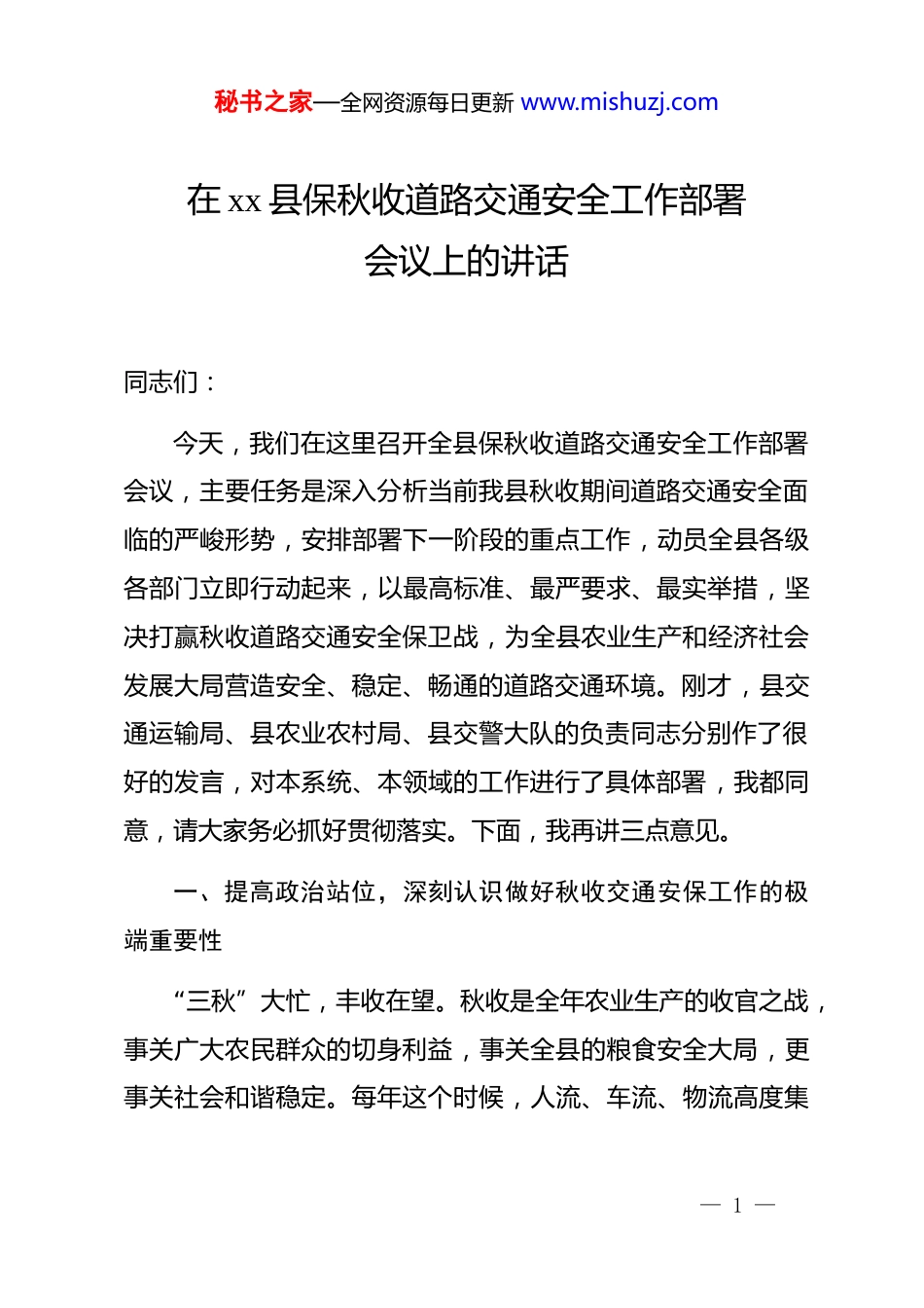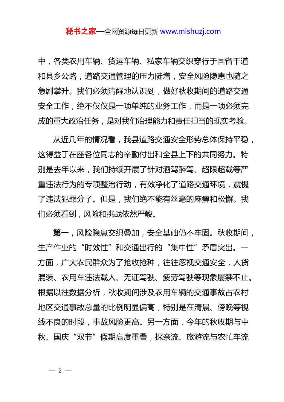 秘书之家—全网资源每日更新 www.mishuzj.com在 xx 县保秋收道路交通安全工作部署会议上的讲话同志们:今天,我们在这里召开全县保秋收道路交通安全工作部署会议,主要任务是深入分析当前我县秋收期间道路交通安全面临的严峻形势,安排部署下一阶段的重点工作,动员全县各级各部门立即行动起来,以最高标准、最严要求、最实举措,坚决打赢秋收道路交通安全保卫战,为全县农业生产和经济社会发展大局营造安全、稳定、畅通的道路交通环境。刚才,县交通运输局、县农业农村局、县交警大队的负责同志分别作了很好的发言,对本系统、本领域的工作进行了具体部署,我都同意,请大家务必抓好贯彻落实。下面,我再讲三点意见。一、提高政治站位,深刻认识做好秋收交通安保工作的极端重要性“三秋”大忙,丰收在望。秋收是全年农业生产的收官之战,事关广大农民群众的切身利益,事关全县的粮食安全大局,更事关社会和谐稳定。每年这个时候,人流、车流、物流高度集— 1 —秘书之家—全网资源每日更新 www.mishuzj.com中,各类农用车辆、货运车辆、私家车辆交织穿行于国省干道和县乡公路,道路交通管理的压力陡增,安全风险隐患也随之急剧攀升。我们必须清醒地认识到,做好秋收期间的道路交通安全工作,绝不仅仅是一项单纯的业务工作,而是一项必须完成的重大政治任务,是对我们治理能力和责任担当的现实考验。从近几年的情况看,我县道路交通安全形势总体保持平稳,这得益于在座各位同志的辛勤付出和全县上下的共同努力。特别是去年以来,我们持续开展了针对酒驾醉驾、超限超载等严重违法行为的专项整治行动,有效净化了道路交通环境,震慑了违法犯罪分子。但是,我们绝不能有丝毫的麻痹和松懈。我们必须看到,风险和挑战依然严峻。第一,风险隐患交织叠加,安全基础仍不牢固。秋收期间,生产作业的“时效性”和交通出行的“集中性”矛盾突出。一方面,广大农民群众为了抢收抢种,往往忽视交通安全,人货混装、农用车违法载人、无证驾驶、疲劳驾驶等现象屡禁不止。根据以往数据分析,秋收期间涉及农用车辆的交通事故占农村地区交通事故总量的比例明显偏高,特别是在清晨、傍晚等视线不良的时段,事故风险更高。另一方面,今年的秋收期与中秋、国庆“双节”假期高度重叠,探亲流、旅游流与农忙车流— 2 —秘书之家—全网资源每日更新 www.mishuzj.com叠加,道路通行压力前所未有。加之秋季多雾、多雨等恶劣天气频发,给道路安全带来极大挑战。这些风险相互交织,任何一个环节出现疏漏,都可能引发连锁反应,导致严重后果。第二,重点车辆监管难度大,源头管理存在短板。我县农村地区道路等级低、路况复杂,许多道路缺乏必要的安全设施。同时,“两客一危一货一校一面”等重点车辆的安全监管仍需持续加强。特别是拖拉机、三轮汽车、低速载货汽车等农用车辆,很多存在安全性能差、非法改装、逾期未检验甚至达到报废标准等问题,这些车辆行驶在路上,就是移动的“事故源”。此外,部分运输企业主体责任落实不到位,对驾驶员的安全教育和车辆的日常维护管理流于形式,源头性、根本性的问题尚未得到彻底解决。第三,群众交通安全意识薄弱,宣传教育仍需深化。长期以来,部分农村群众“重生产、轻安全”的思想根深蒂固,认为“在村里开慢点就没事”“这么多年都这么过来的”,对交通法规知之甚少、心存侥幸。交通安全宣传教育虽然年年讲、月月抓,但还存在方式单一、内容枯燥、覆盖面不广、针对性不强等问题,没有真正入耳、入脑、入心。如何让交通安全知识真正走进田间地头,转化为广大农民群众的自觉行动,是我— 3 —秘书之家—全网资源每日更新 www.mishuzj.com们必须下大力气破解的难题。因此,全县各级各部门必须把思想和行动统一到县委、县政府的决策部署上来,牢固树立“人民至上、生命至上”的理念,以“时时放心不下”的责任感和“事事落实到位”的执行力,把保秋收交通安全工作作为当前压倒一切的头等大事来抓,坚决守牢安全底线,为全县人民群众的生命财产安全站好岗、放好哨。二、聚焦关键环节,全面落实秋收交通安保工作的各项硬核措施做好今年的保秋收交通安全工作,必...