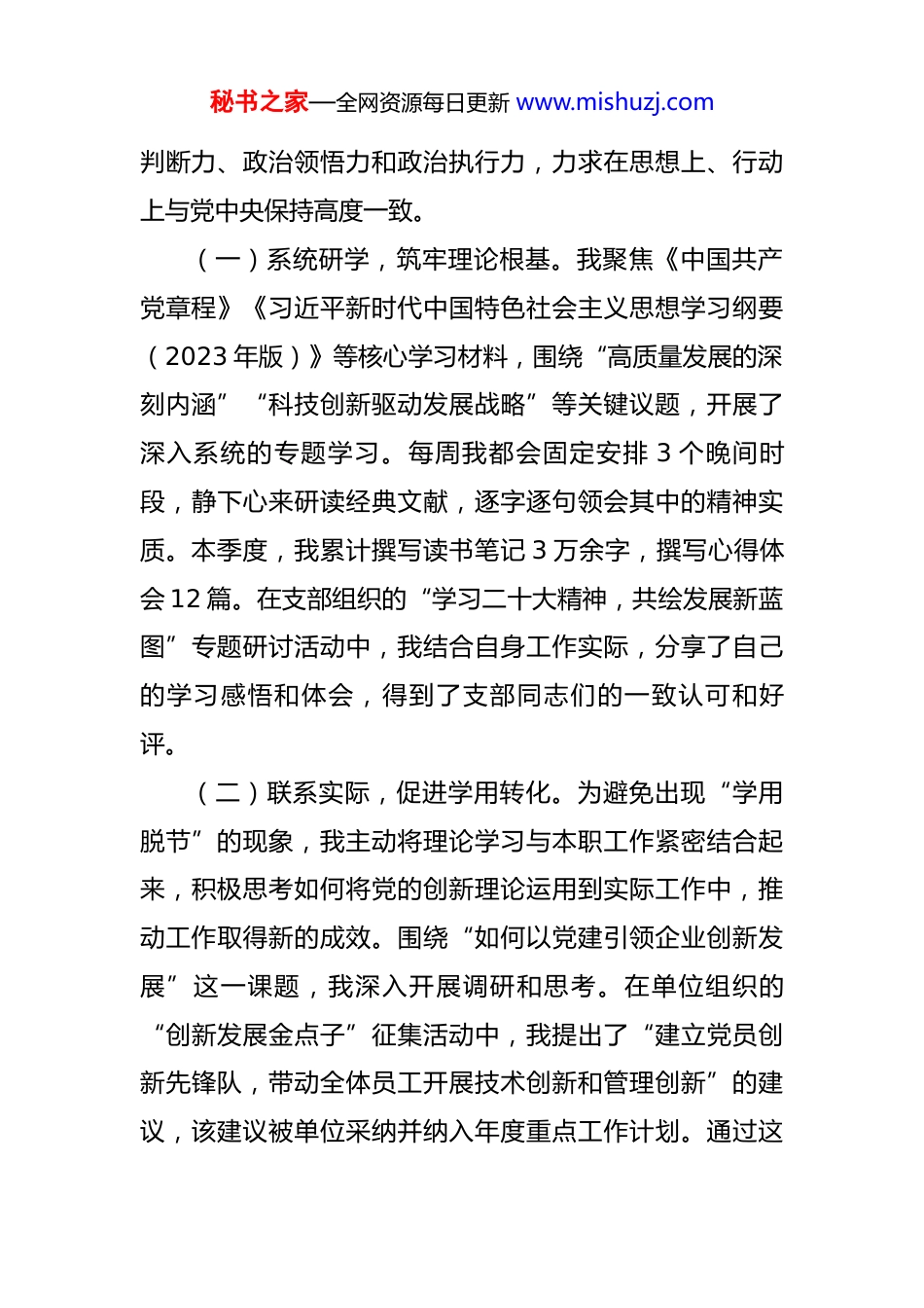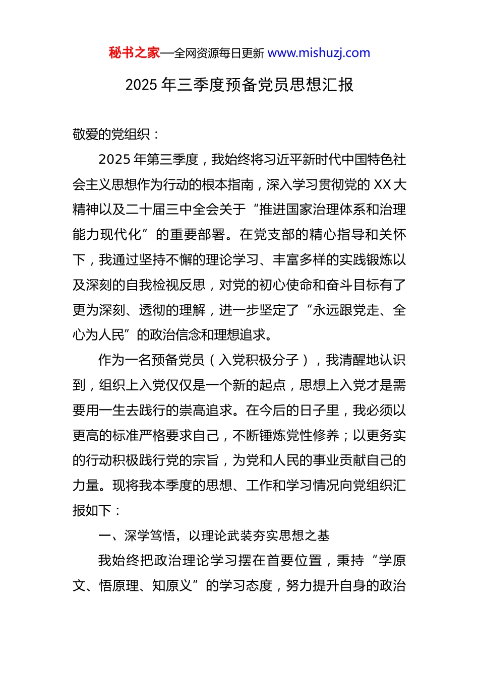秘书之家—全网资源每日更新 www.mishuzj.com2025 年三季度预备党员思想汇报 敬爱的党组织:2025 年第三季度,我始终将习近平新时代中国特色社会主义思想作为行动的根本指南,深入学习贯彻党的 XX 大精神以及二十届三中全会关于“推进国家治理体系和治理能力现代化”的重要部署。在党支部的精心指导和关怀下,我通过坚持不懈的理论学习、丰富多样的实践锻炼以及深刻的自我检视反思,对党的初心使命和奋斗目标有了更为深刻、透彻的理解,进一步坚定了“永远跟党走、全心为人民”的政治信念和理想追求。作为一名预备党员(入党积极分子),我清醒地认识到,组织上入党仅仅是一个新的起点,思想上入党才是需要用一生去践行的崇高追求。在今后的日子里,我必须以更高的标准严格要求自己,不断锤炼党性修养;以更务实的行动积极践行党的宗旨,为党和人民的事业贡献自己的力量。现将我本季度的思想、工作和学习情况向党组织汇报如下:一、深学笃悟,以理论武装夯实思想之基我始终把政治理论学习摆在首要位置,秉持“学原文、悟原理、知原义”的学习态度,努力提升自身的政治秘书之家—全网资源每日更新 www.mishuzj.com判断力、政治领悟力和政治执行力,力求在思想上、行动上与党中央保持高度一致。(一)系统研学,筑牢理论根基。我聚焦《中国共产党章程》《习近平新时代中国特色社会主义思想学习纲要(2023 年版)》等核心学习材料,围绕“高质量发展的深刻内涵”“科技创新驱动发展战略”等关键议题,开展了深入系统的专题学习。每周我都会固定安排 3 个晚间时段,静下心来研读经典文献,逐字逐句领会其中的精神实质。本季度,我累计撰写读书笔记 3 万余字,撰写心得体会 12 篇。在支部组织的“学习二十大精神,共绘发展新蓝图”专题研讨活动中,我结合自身工作实际,分享了自己的学习感悟和体会,得到了支部同志们的一致认可和好评。(二)联系实际,促进学用转化。为避免出现“学用脱节”的现象,我主动将理论学习与本职工作紧密结合起来,积极思考如何将党的创新理论运用到实际工作中,推动工作取得新的成效。围绕“如何以党建引领企业创新发展”这一课题,我深入开展调研和思考。在单位组织的“创新发展金点子”征集活动中,我提出了“建立党员创新先锋队,带动全体员工开展技术创新和管理创新”的建议,该建议被单位采纳并纳入年度重点工作计划。通过这秘书之家—全网资源每日更新 www.mishuzj.com一实践,我深刻体会到了理论对实践的强大指导作用,也更加坚定了将理论学习与实际工作相结合的决心。(三)对标检视,补齐知识短板。对照党员的标准和要求,我认真进行自我反思和检视,发现自己存在“学习碎片化”的问题。具体表现为对金融、环保领域的政策理论关注较少,导致在分析企业发展战略和应对市场变化时缺乏全面的视角和前瞻性的思维。在培养联系人的悉心提醒和指导下,我制定了“每周 2 篇政策解读文章学习”的计划,通过阅读《经济日报》的深度报道、政府部门发布的政策解读文件等,不断拓宽自己的知识视野,努力提升自己的综合素质和业务能力。我深刻认识到,只有持续用党的创新理论武装头脑,才能在复杂多变的市场环境中保持清醒的头脑,确保自己的工作不偏离正确的方向。二、知行合一,以实干担当诠释初心使命我始终牢记“为人民服务”的根本宗旨,立足本职岗位,积极履行工作职责,主动深入基层、贴近群众,努力为群众办实事、解难题,在实践中不断检验和提升自己的学习成效。(一)立足岗位,解决实际问题。作为单位业务部门的一名工作人员,我主动承担起“客户需求调研与响应”专项工作,坚持“客户至上、服务第一”的原则,做到秘书之家—全网资源每日更新 www.mishuzj.com“有求必应、应必有果”。第三季度以来,我累计处理客户咨询、投诉事项 58 件,其中“产品售后服务质量提升”“个性化产品定制需求”等 15 项高频问题,通过协调研发、生产、售后等部门,成功推动问题得到解决。我的工作表现得到了单位领导和同事的高度认可,荣获单位季度“服务之星”称号。(二)下沉基层,温暖群众心田。积极响应党组织的号召,我踊跃参与社区“双...