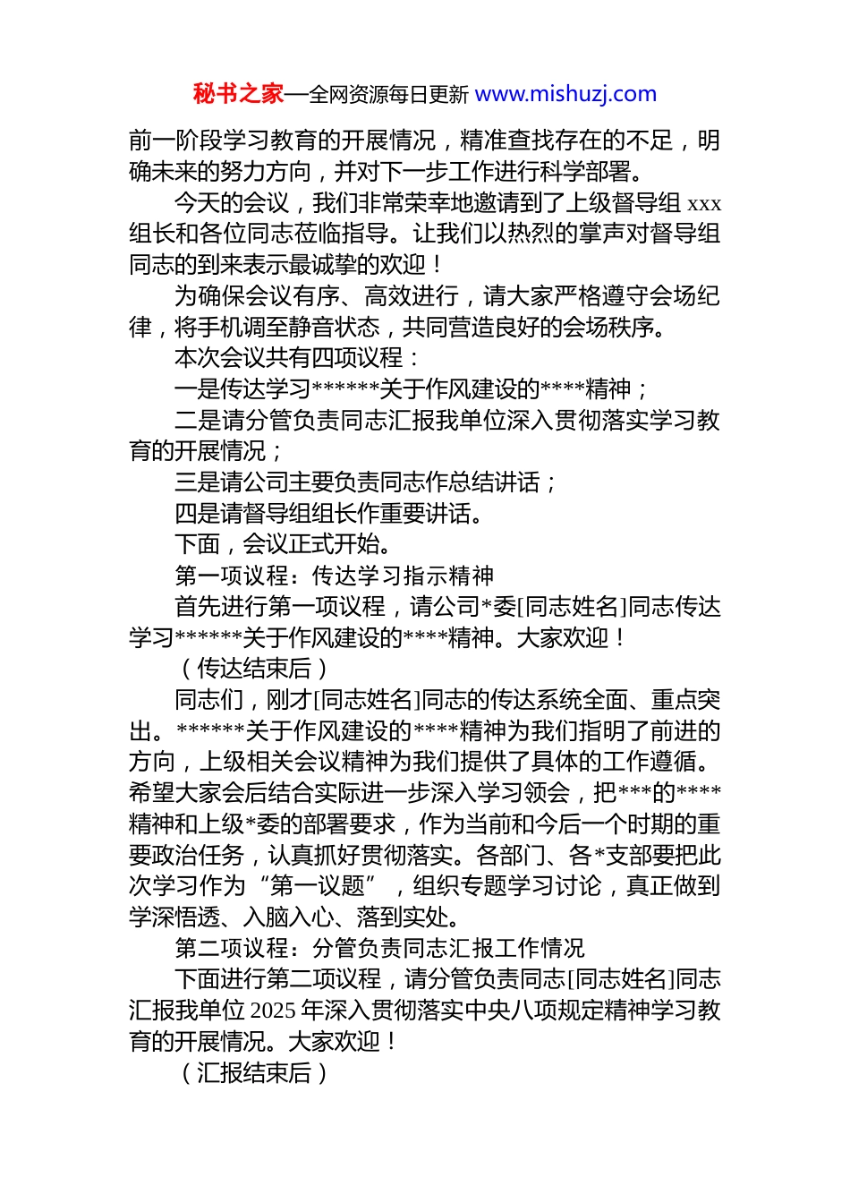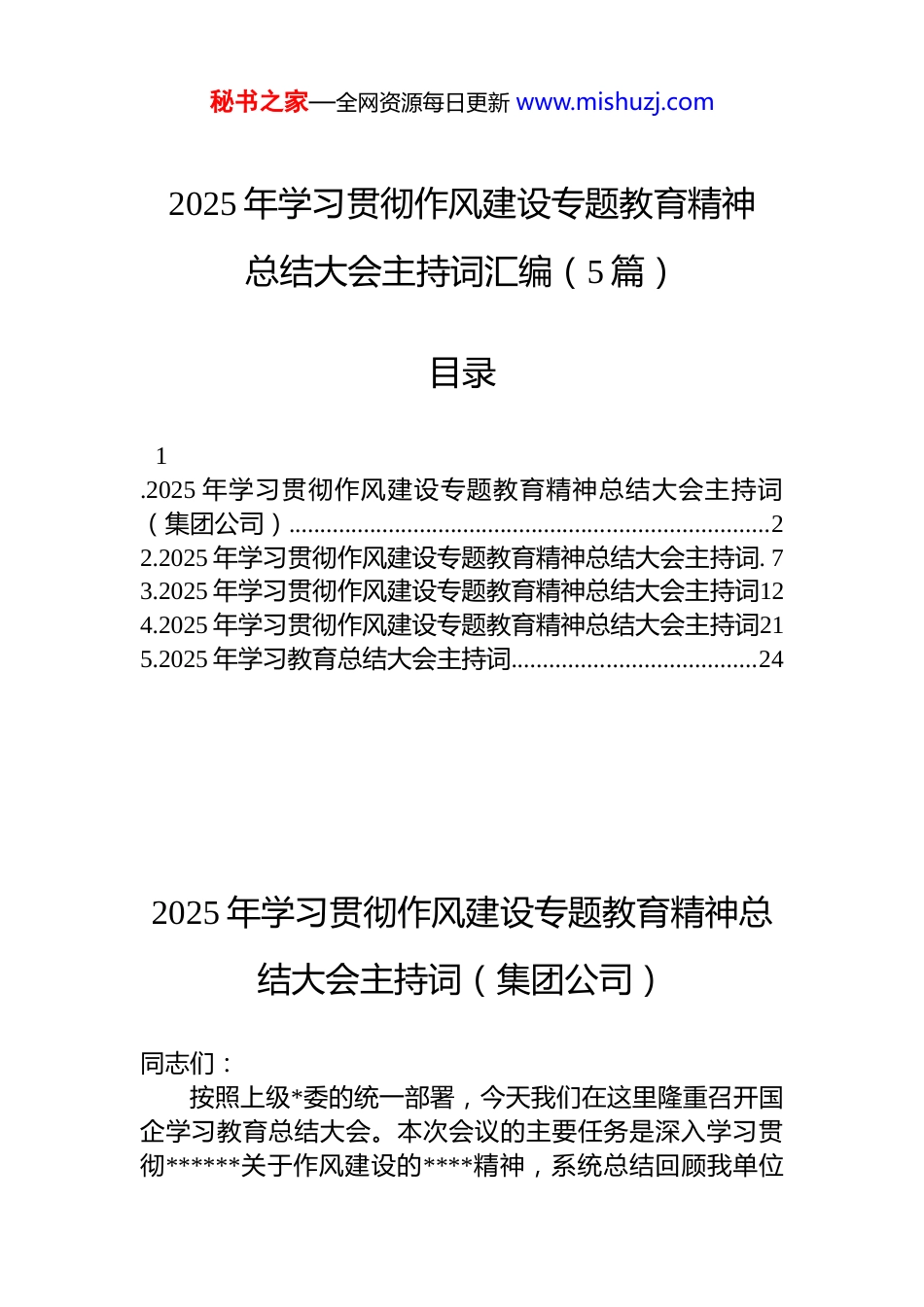 秘书之家—全网资源每日更新 www.mishuzj.com2025 年学习贯彻作风建设专题教育精神总结大会主持词汇编(5 篇)目录1.2025 年学习贯彻作风建设专题教育精神总结大会主持词(集团公司).............................................................................22.2025 年学习贯彻作风建设专题教育精神总结大会主持词. 73.2025 年学习贯彻作风建设专题教育精神总结大会主持词124.2025 年学习贯彻作风建设专题教育精神总结大会主持词215.2025 年学习教育总结大会主持词.......................................242025 年学习贯彻作风建设专题教育精神总结大会主持词(集团公司)同志们:按照上级*委的统一部署,今天我们在这里隆重召开国企学习教育总结大会。本次会议的主要任务是深入学习贯彻******关于作风建设的****精神,系统总结回顾我单位秘书之家—全网资源每日更新 www.mishuzj.com前一阶段学习教育的开展情况,精准查找存在的不足,明确未来的努力方向,并对下一步工作进行科学部署。今天的会议,我们非常荣幸地邀请到了上级督导组 xxx组长和各位同志莅临指导。让我们以热烈的掌声对督导组同志的到来表示最诚挚的欢迎!为确保会议有序、高效进行,请大家严格遵守会场纪律,将手机调至静音状态,共同营造良好的会场秩序。本次会议共有四项议程:一是传达学习******关于作风建设的****精神;二是请分管负责同志汇报我单位深入贯彻落实学习教育的开展情况;三是请公司主要负责同志作总结讲话;四是请督导组组长作重要讲话。下面,会议正式开始。第一项议程:传达学习指示精神首先进行第一项议程,请公司*委[同志姓名]同志传达学习******关于作风建设的****精神。大家欢迎!(传达结束后)同志们,刚才[同志姓名]同志的传达系统全面、重点突出。******关于作风建设的****精神为我们指明了前进的方向,上级相关会议精神为我们提供了具体的工作遵循。希望大家会后结合实际进一步深入学习领会,把***的****精神和上级*委的部署要求,作为当前和今后一个时期的重要政治任务,认真抓好贯彻落实。各部门、各*支部要把此次学习作为“第一议题”,组织专题学习讨论,真正做到学深悟透、入脑入心、落到实处。第二项议程:分管负责同志汇报工作情况下面进行第二项议程,请分管负责同志[同志姓名]同志汇报我单位 2025 年深入贯彻落实中央八项规定精神学习教育的开展情况。大家欢迎!(汇报结束后)秘书之家—全网资源每日更新 www.mishuzj.com感谢 xx 同志的详细汇报。汇报中既展现了我们在学习教育工作中取得的成绩亮点,也客观地指出了存在的不足和明确了改进方向,为我们接下来进一步做好相关工作提供了清晰的参考。第三项议程:主要负责同志总结讲话接下来进行第三项议程,请公司主要负责同志作总结讲话。大家欢迎!(讲话结束后)公司主要负责同志的讲话高屋建瓴、内涵丰富,全面总结了前一阶段学习教育工作,对存在的问题进行了深刻剖析,并对下一步工作提出了明确的目标和要求。我们要认真领会讲话精神,切实抓好贯彻落实。第四项议程:督导组组长讲话现在进行第四项议程,请督导组组长 xx 作重要讲话。大家欢迎!(讲话结束后)督导组组长的讲话对我们的学习教育工作给予了充分肯定,同时也提出了宝贵的意见和建议,为我们今后的工作指明了方向。我们要高度重视,认真落实督导组的要求不断提升工作水平。会议收尾安排同志们,今天的会议四项议程已经全部完成。为了更好地抓好会议精神的贯彻落实,我再强调五点要求:一、提高政治站位,强化思想引领。深入贯彻落实中央八项规定精神是一项严肃的政治任务,我们要深刻认识到作风建设的重要性和紧迫性。全体干部职工要进一步增强“四个意识”、坚定“四个自信”、做到“两个维护”不断提高政治判断力、政治领悟力、政治执行力,始终在思想上、政治上、行动上同以***同志为核心的*中央保持高度一致。二、细化任务分解,明确责任落实。各部门要根据公秘书之家—全网资源每日更新 www.mishuzj.com司主要负责同志的讲话要求和会议部署,结合自身实际,对工作任务进行详细分解,明确责任人和时间节点。要建立健全...